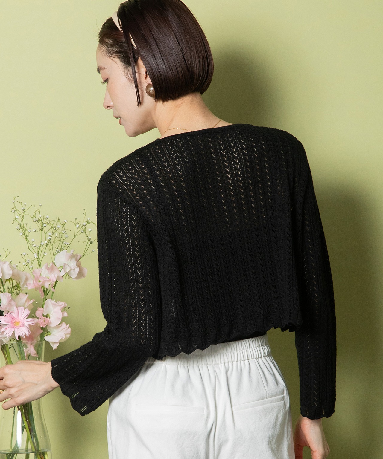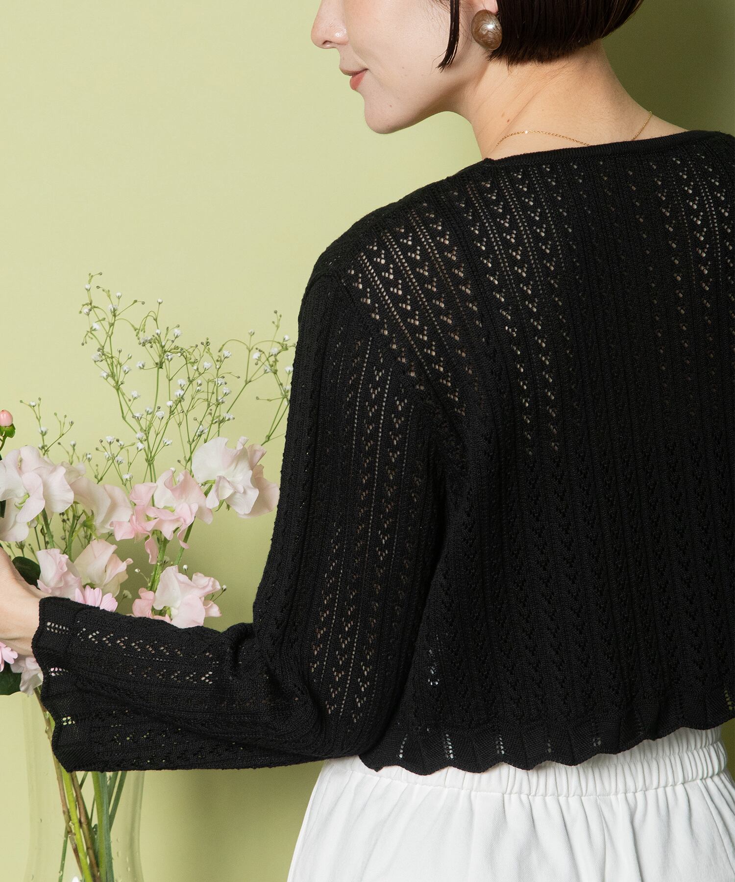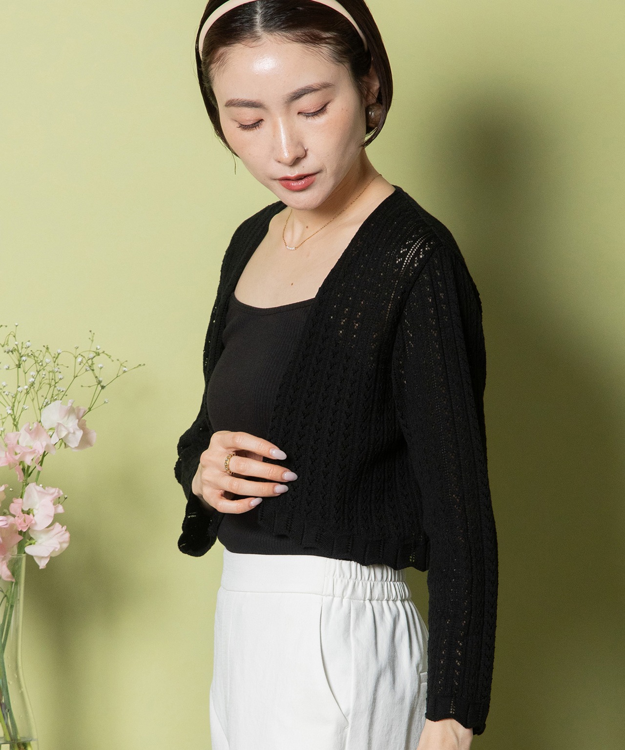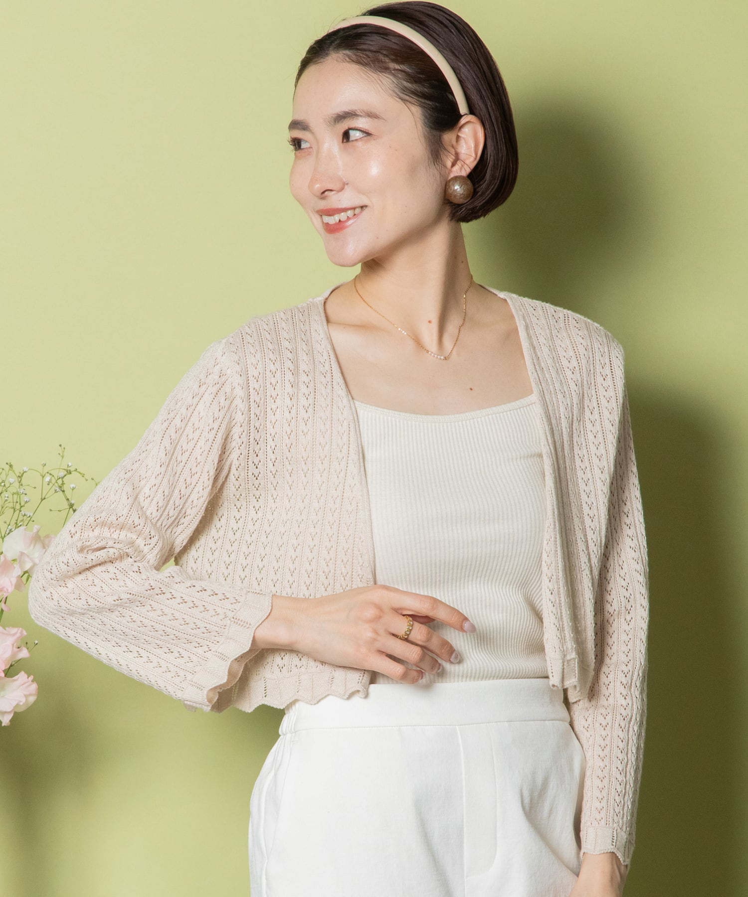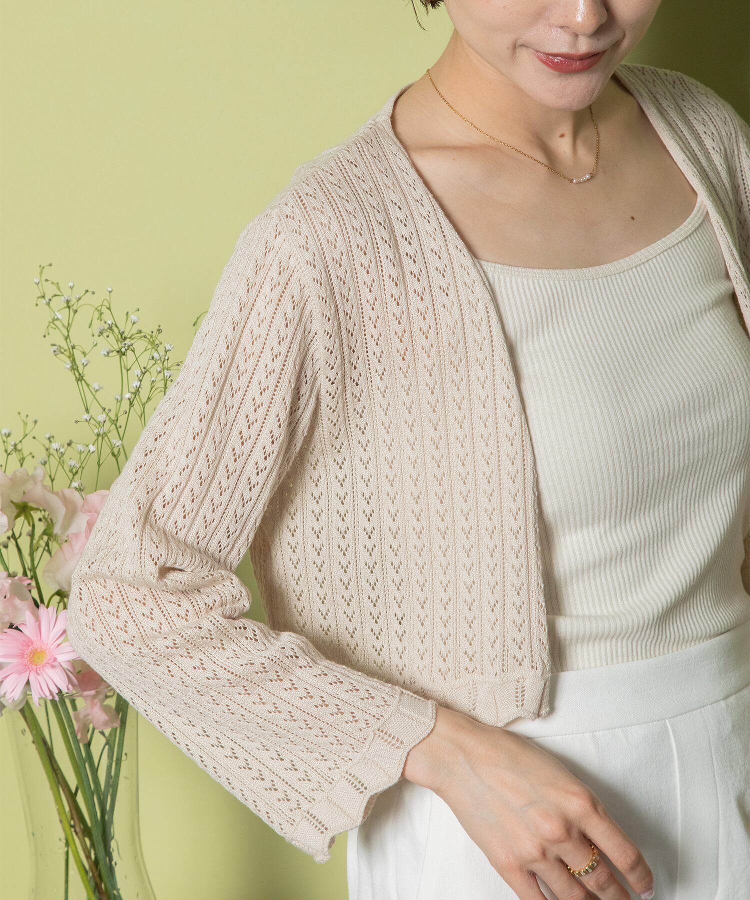 ノースリトップスやキャミソール、ワンピースの上から羽織るのに重宝する1枚。透かし編みで程よい透け感が魅了のフェミニン派におすすめ。