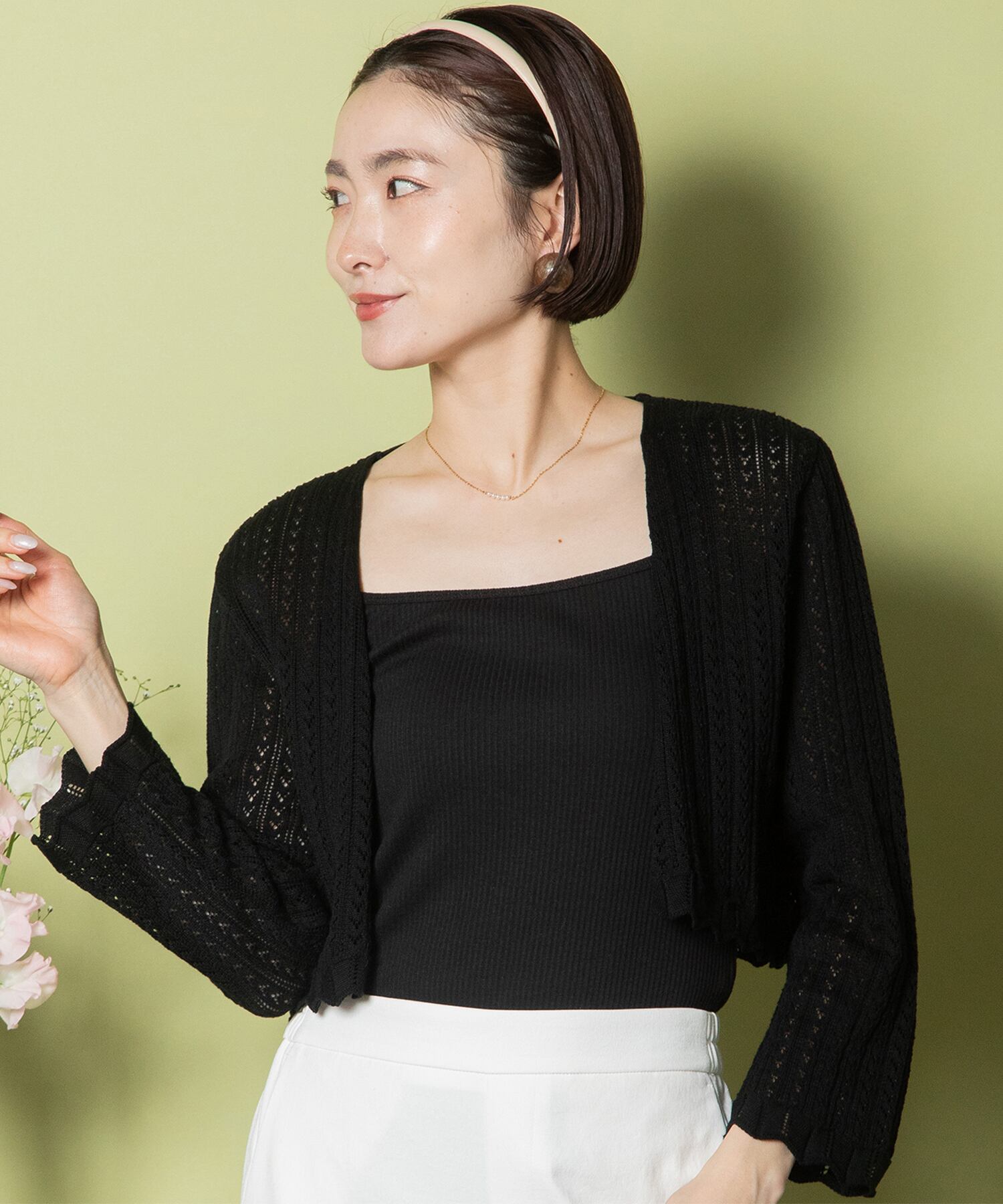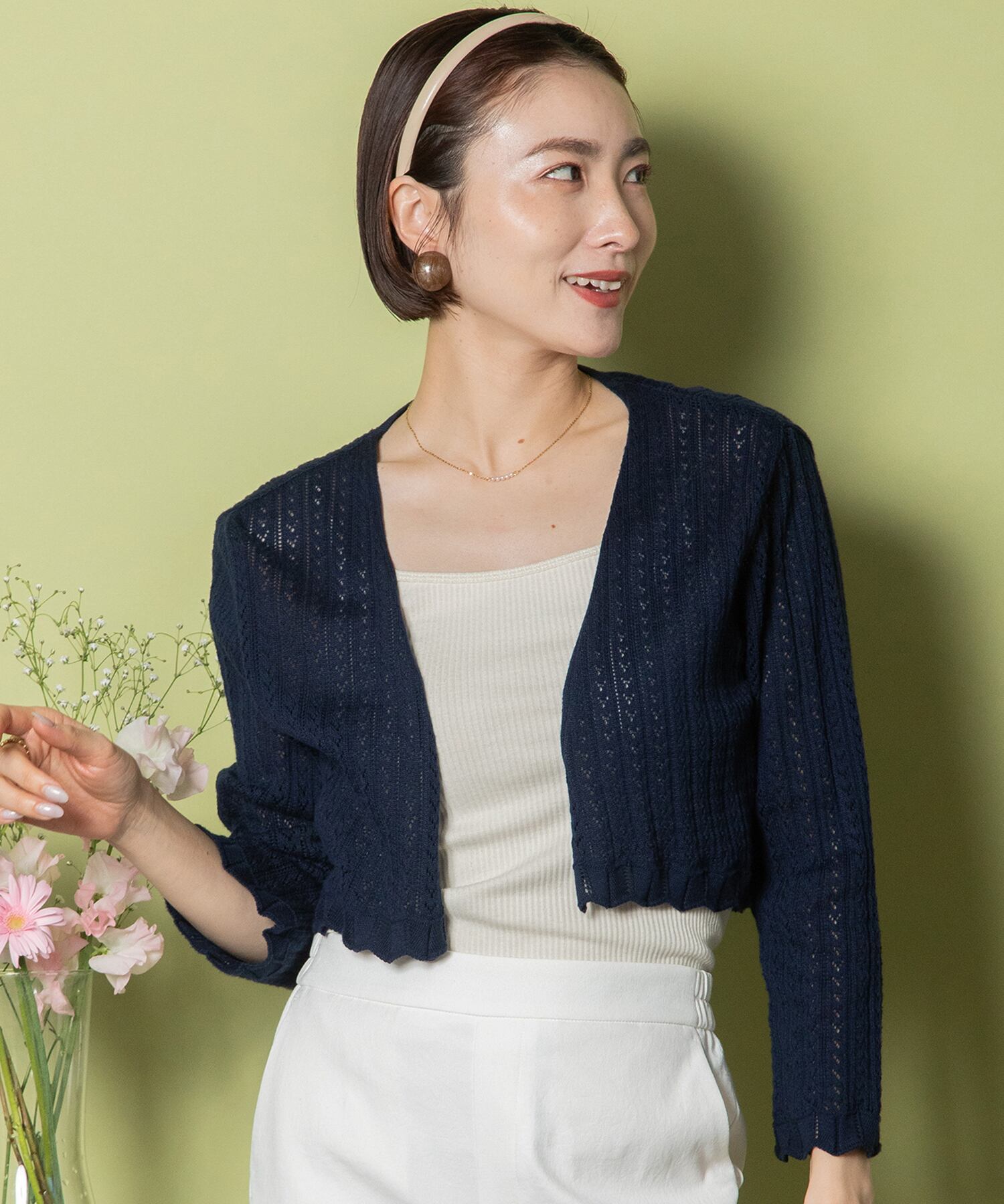 品がよく上品な印象の透かし柄ニットボレロ。ショート丈ボレロタイプでノースリトップスやワンピースの上からサラッと羽織るのにおすすめアイテム。春夏秋と幅広いシーズンで大活躍間違いなし。日焼け対策・冷房対策にも1枚あると重宝する1枚。
