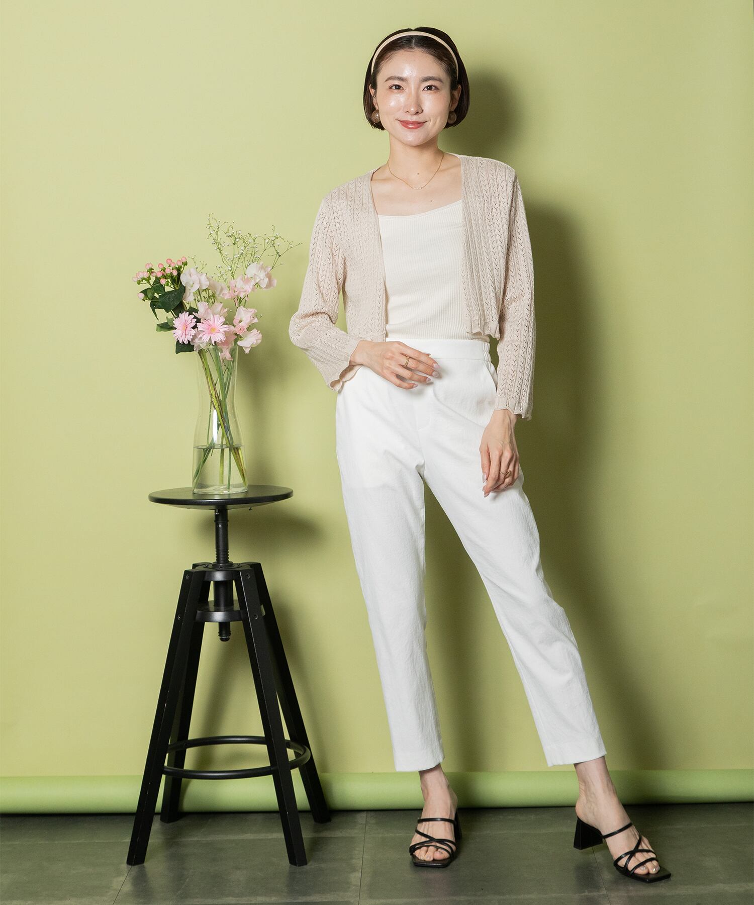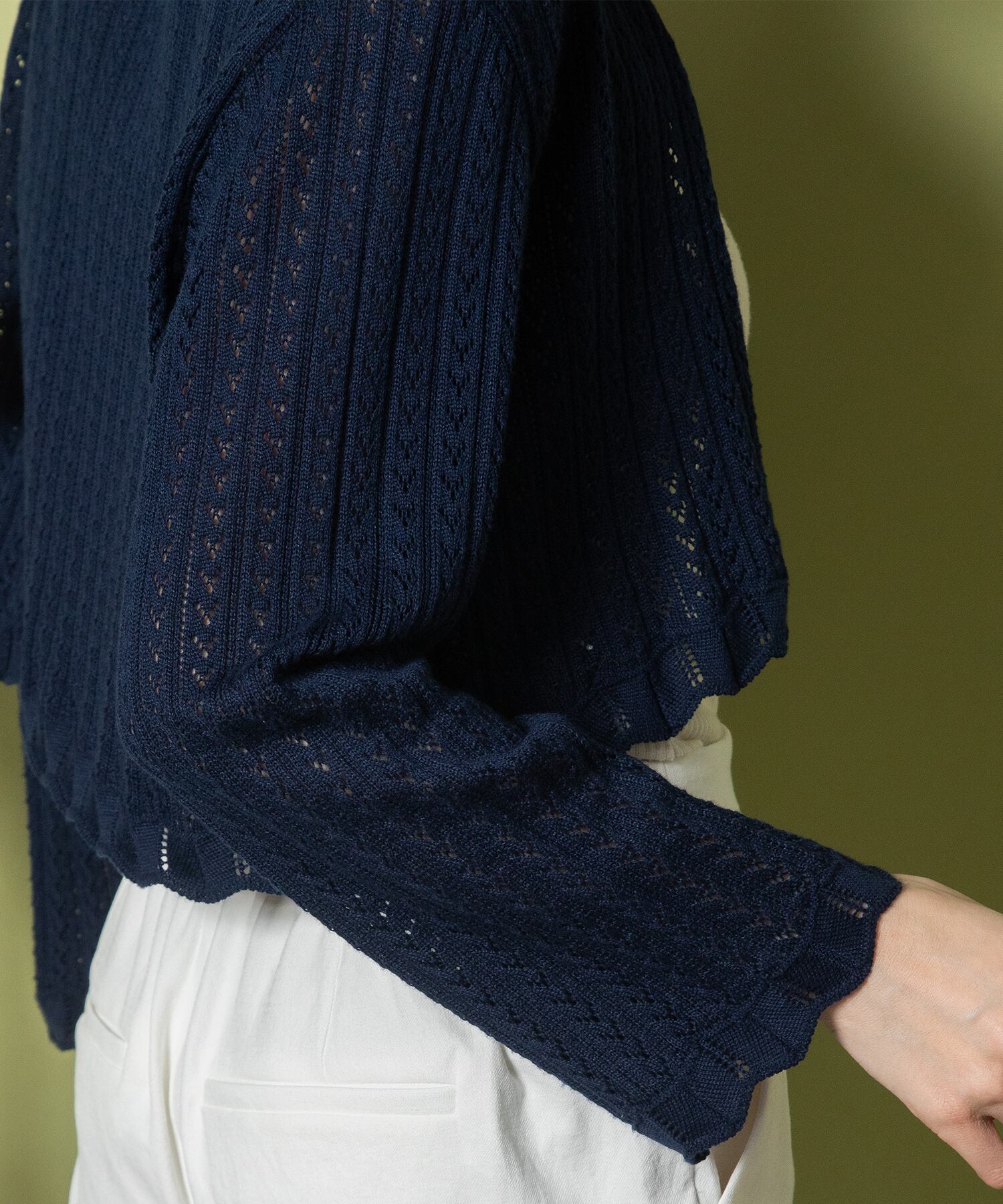 ノースリトップスやキャミソール、ワンピースの上から羽織るのに重宝する1枚。透かし編みで程よい透け感が魅了のフェミニン派におすすめ。