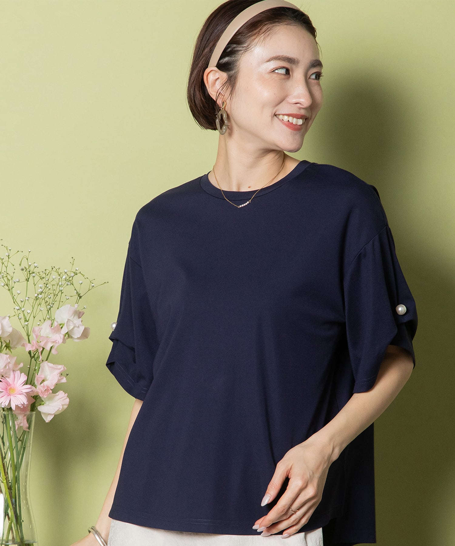 パールモチーフのタックスリーブのデザインカットソー