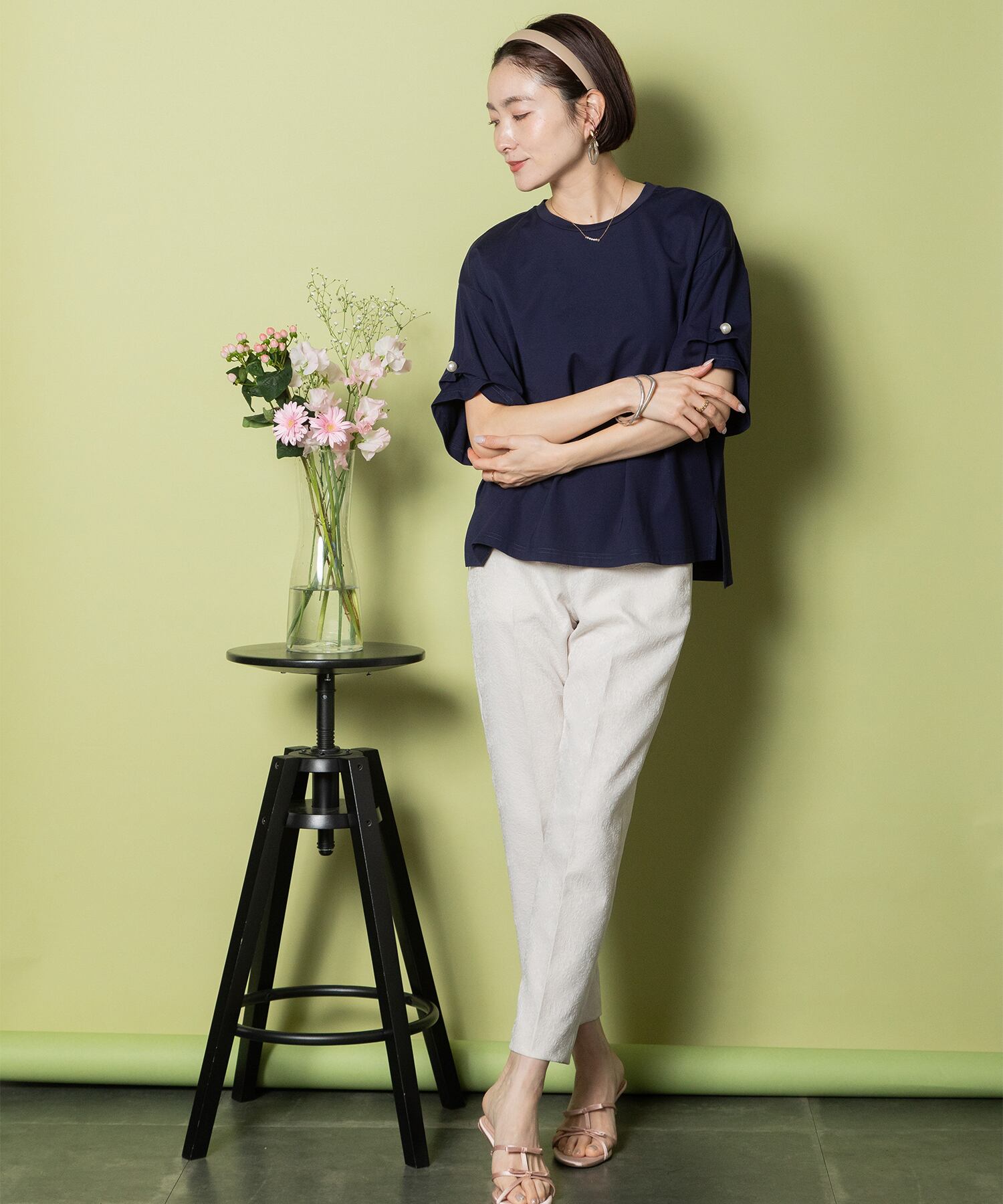袖口にパールモチーフにタックスリーブのデザインカットソー。オフボディのリラックスシルエット。裾はサイドスリットデザインで、アウトでもインでも決まる着回し力抜群のアイテムです。