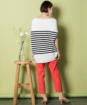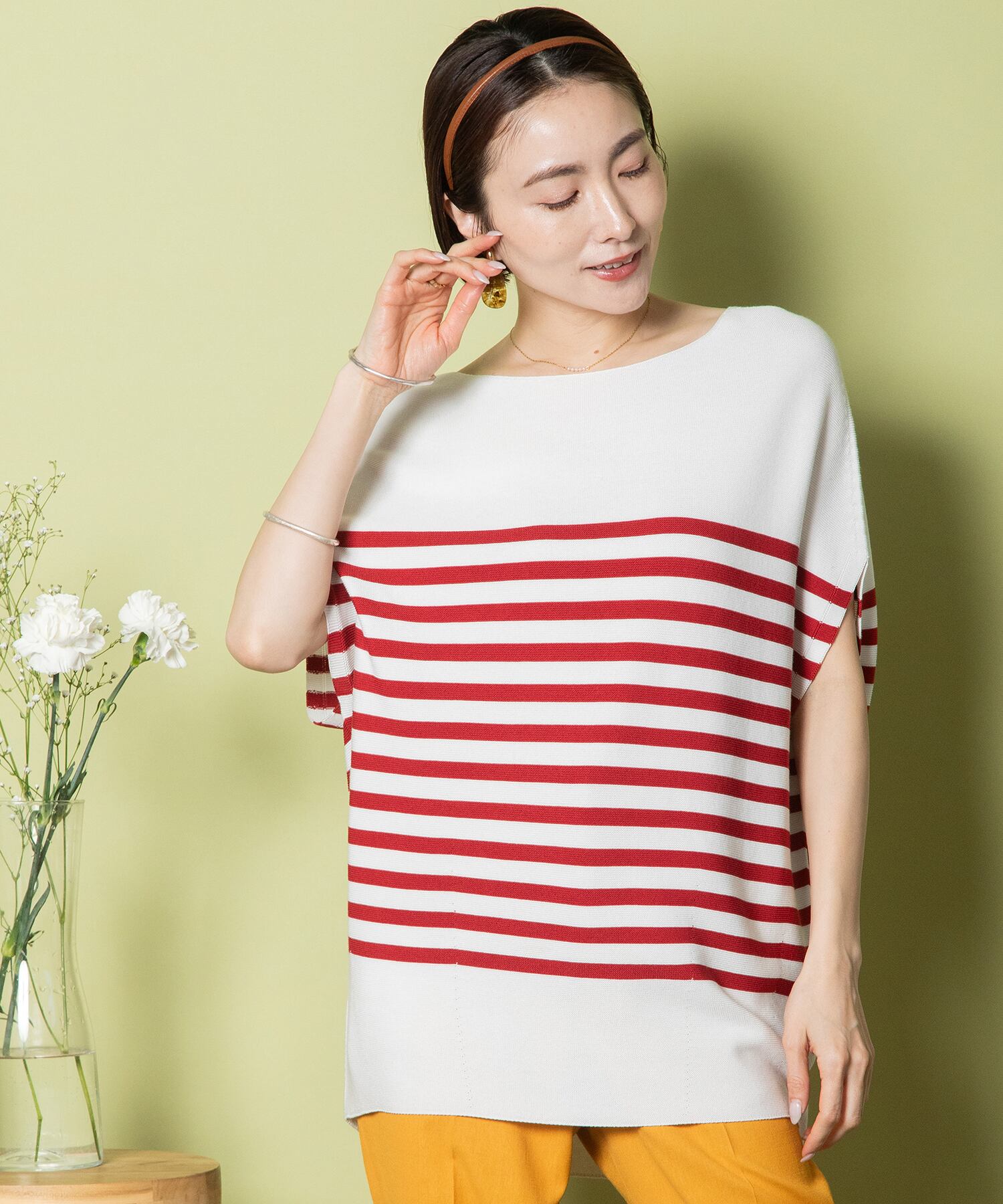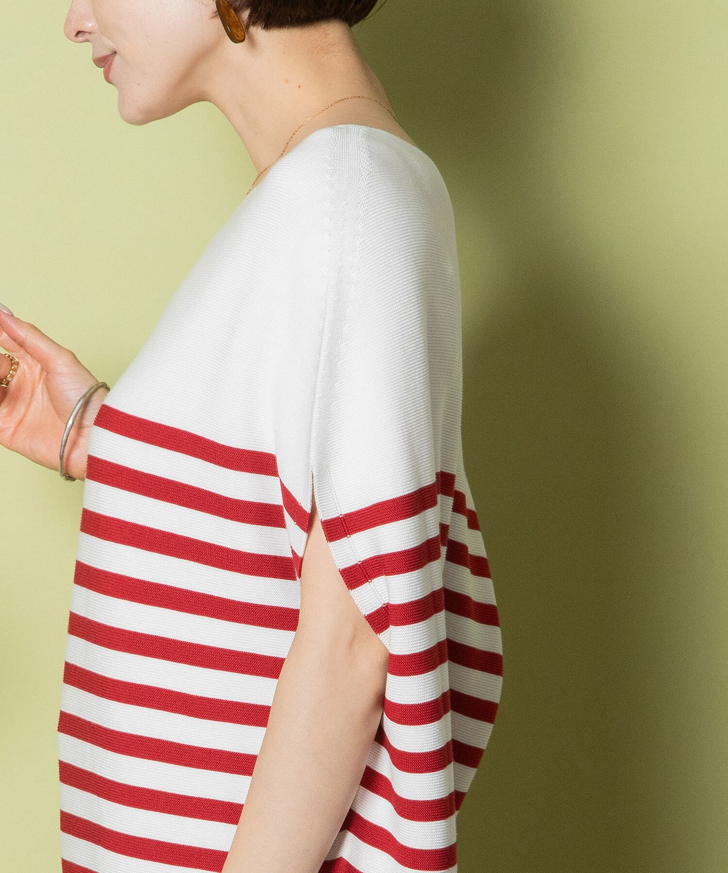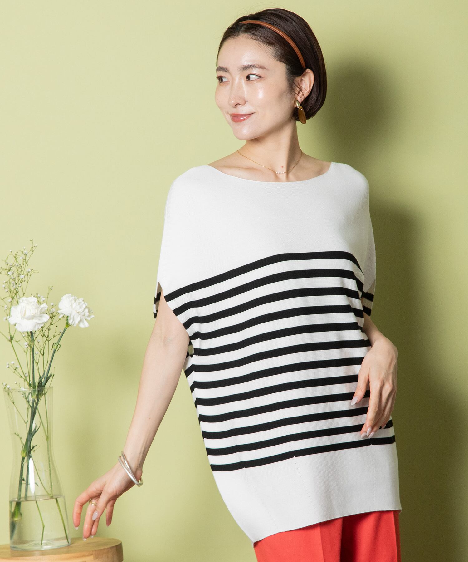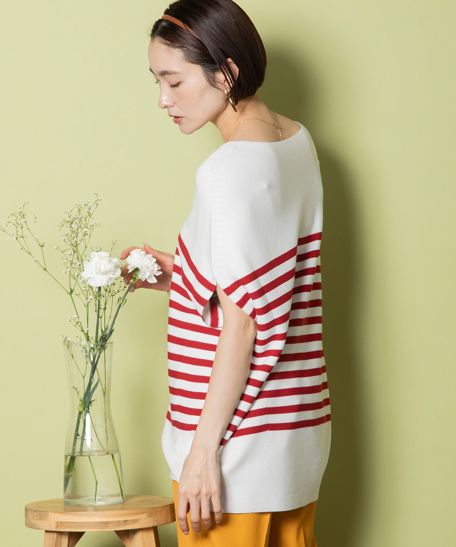 爽やかなマリンテイストのパネルボーダーが目をひくニット。ゆるっとしたオフボディシルエット、二の腕をカバーしてくれるドロップショルダーが魅力のプルオーバー。