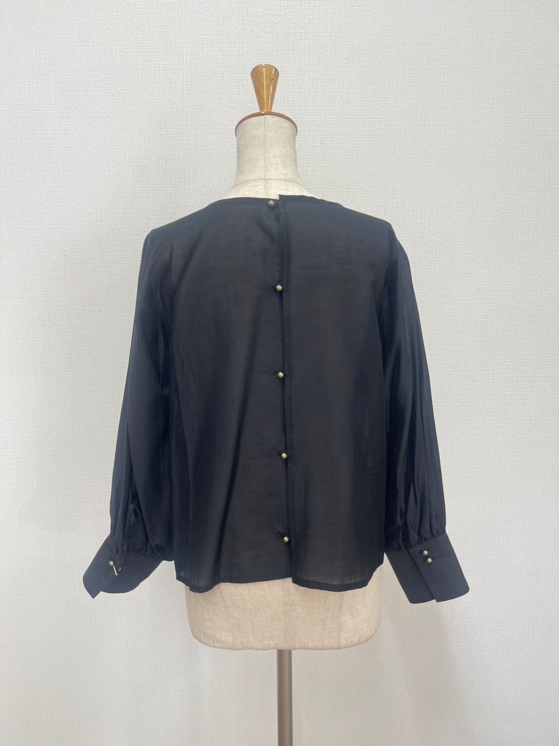 程よい透け感が魅力の雰囲気あるアイテム。バックがボタン仕様になったプルオーバーのデザイン。袖口と背中にはこだわりのアンティーク風ボタンを使用。袖口はギャザーカフス仕様。