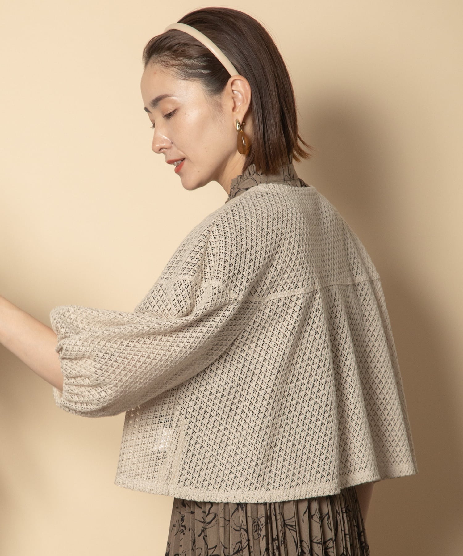 ノースリトップスやキャミソール、ワンピースの上から羽織るのに重宝する1枚。透かし編みで程よい透け感が魅力。