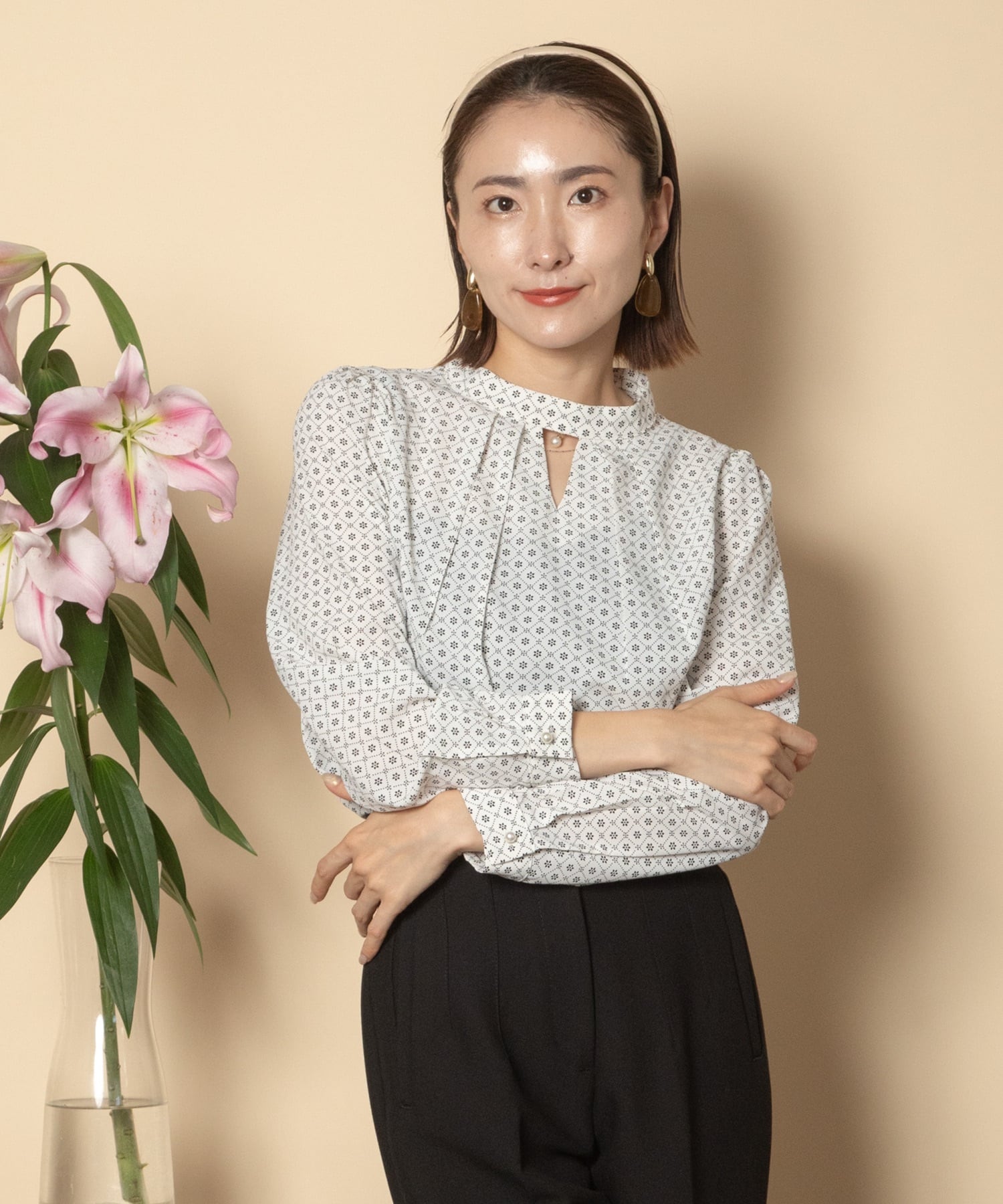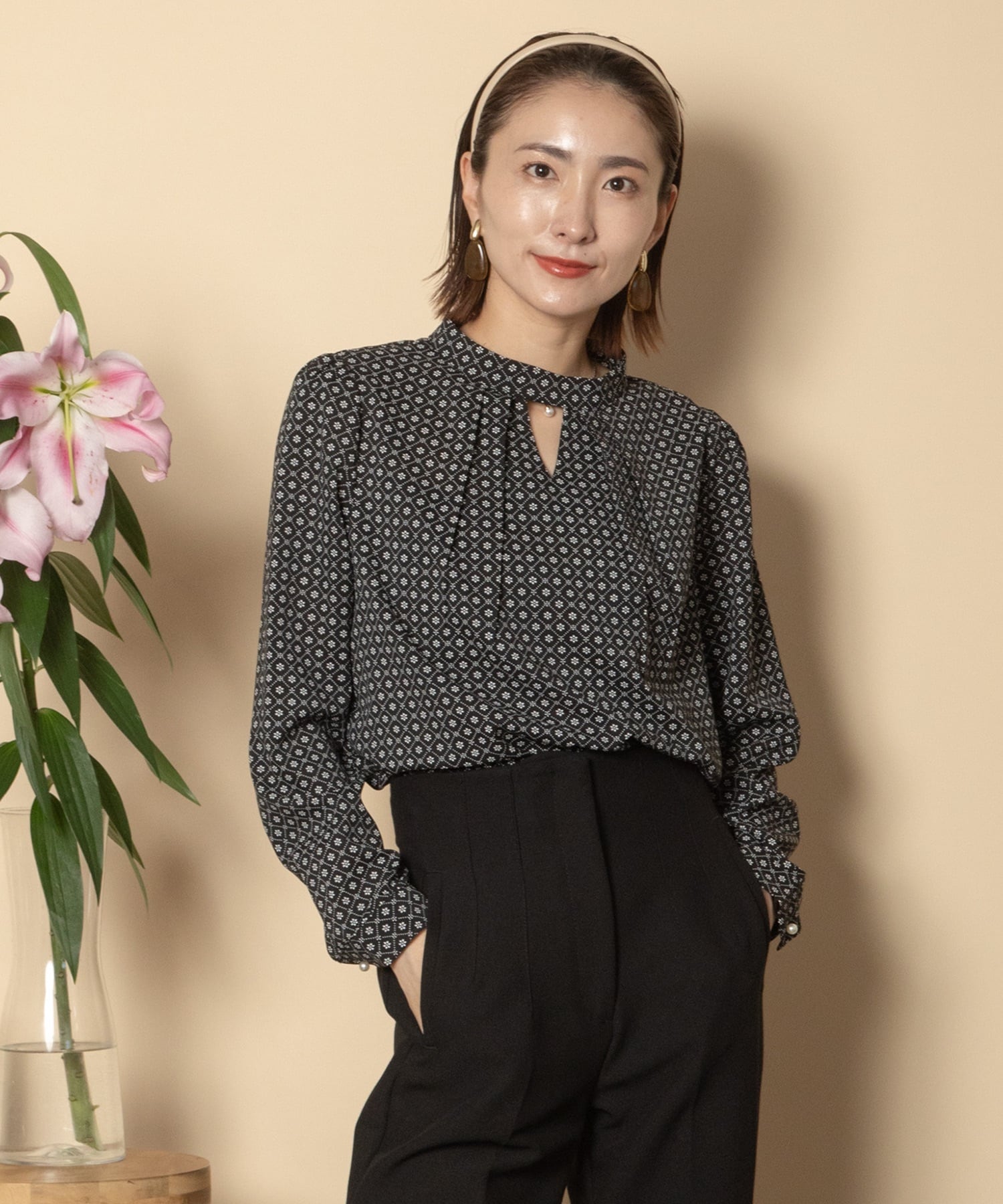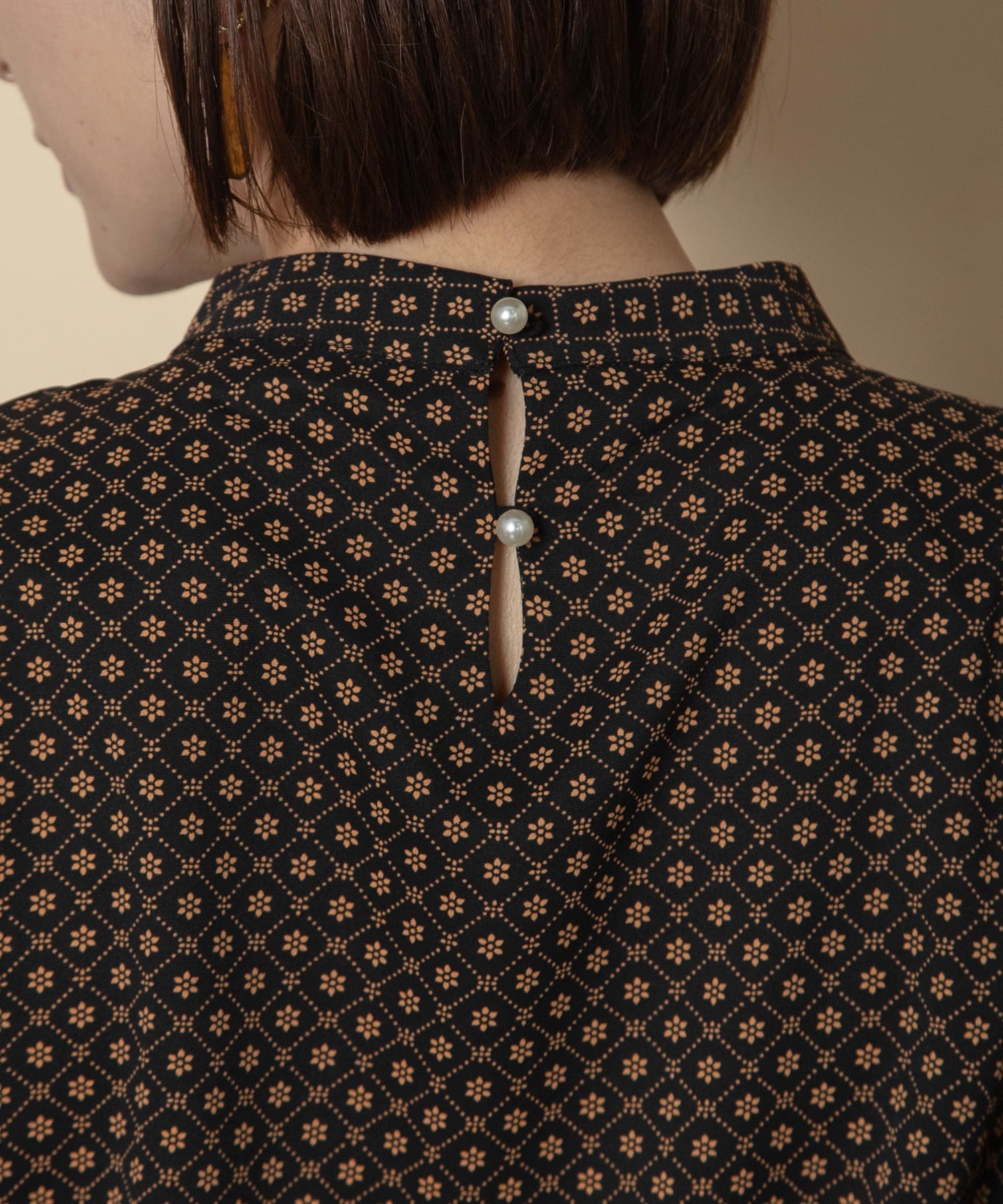 クラシカルな雰囲気の小紋柄プリントのスタンドブラウス。スタンド襟に涙開き、センターにはさりげなくパールがアクセントに。