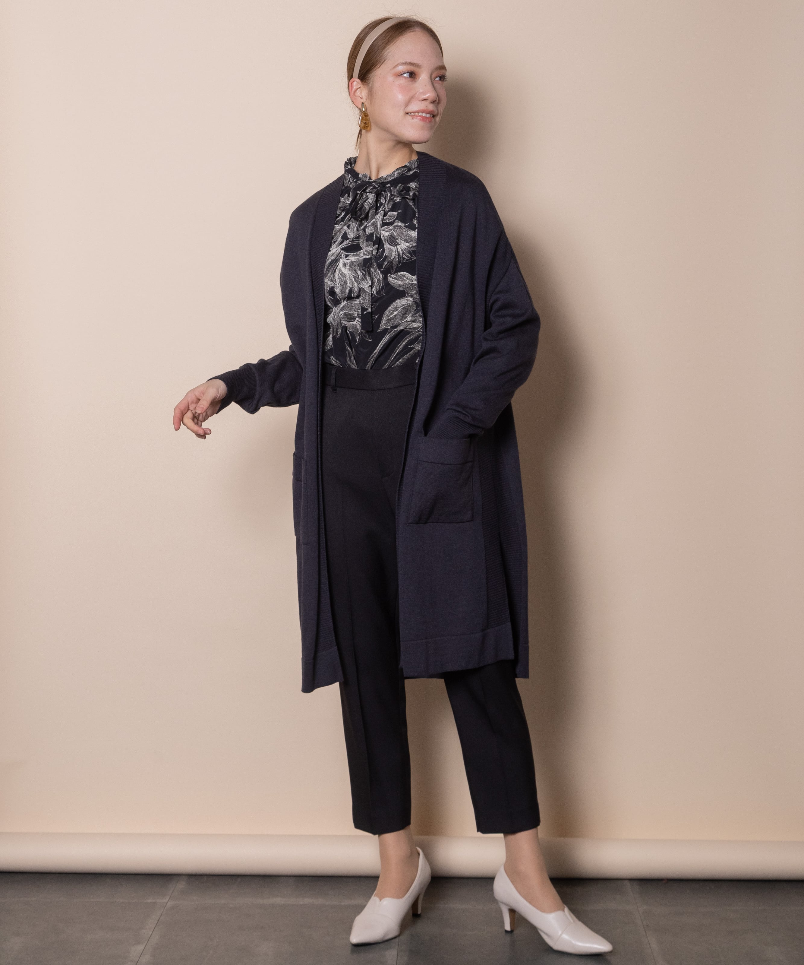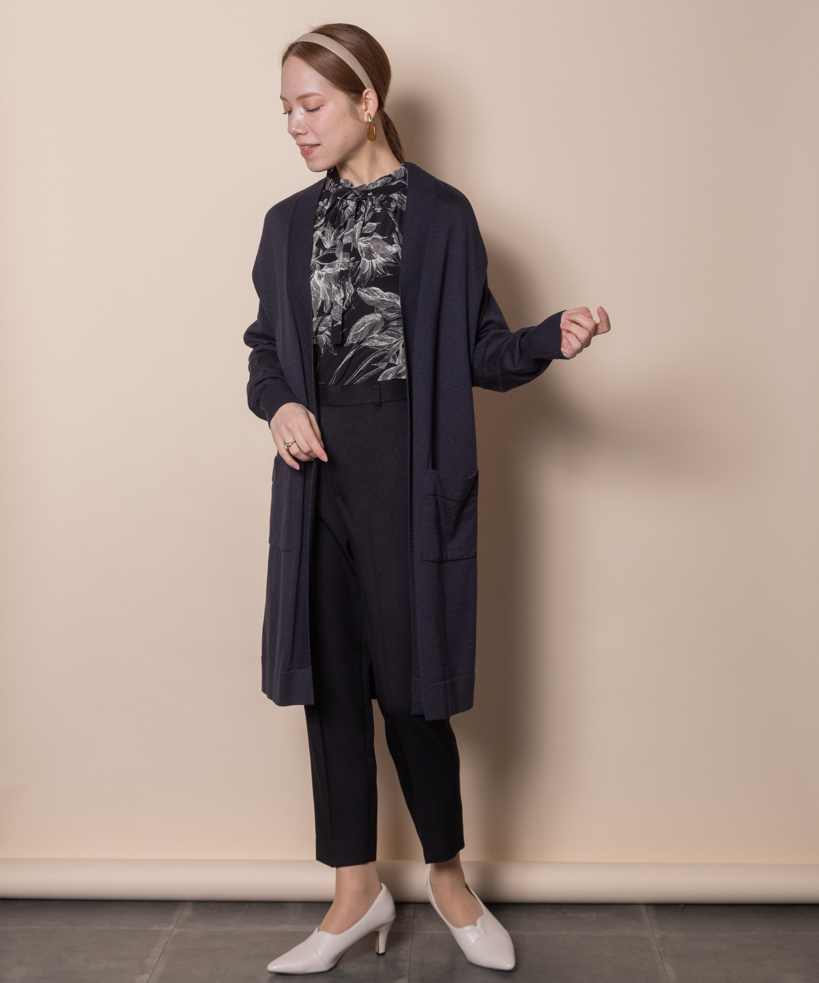 パンツスタイル・スカートスタイルと幅広いボトムとコーデ頂けます。お仕事シーンからカジュアルシーンまで幅広いシーンでご着用頂けます。