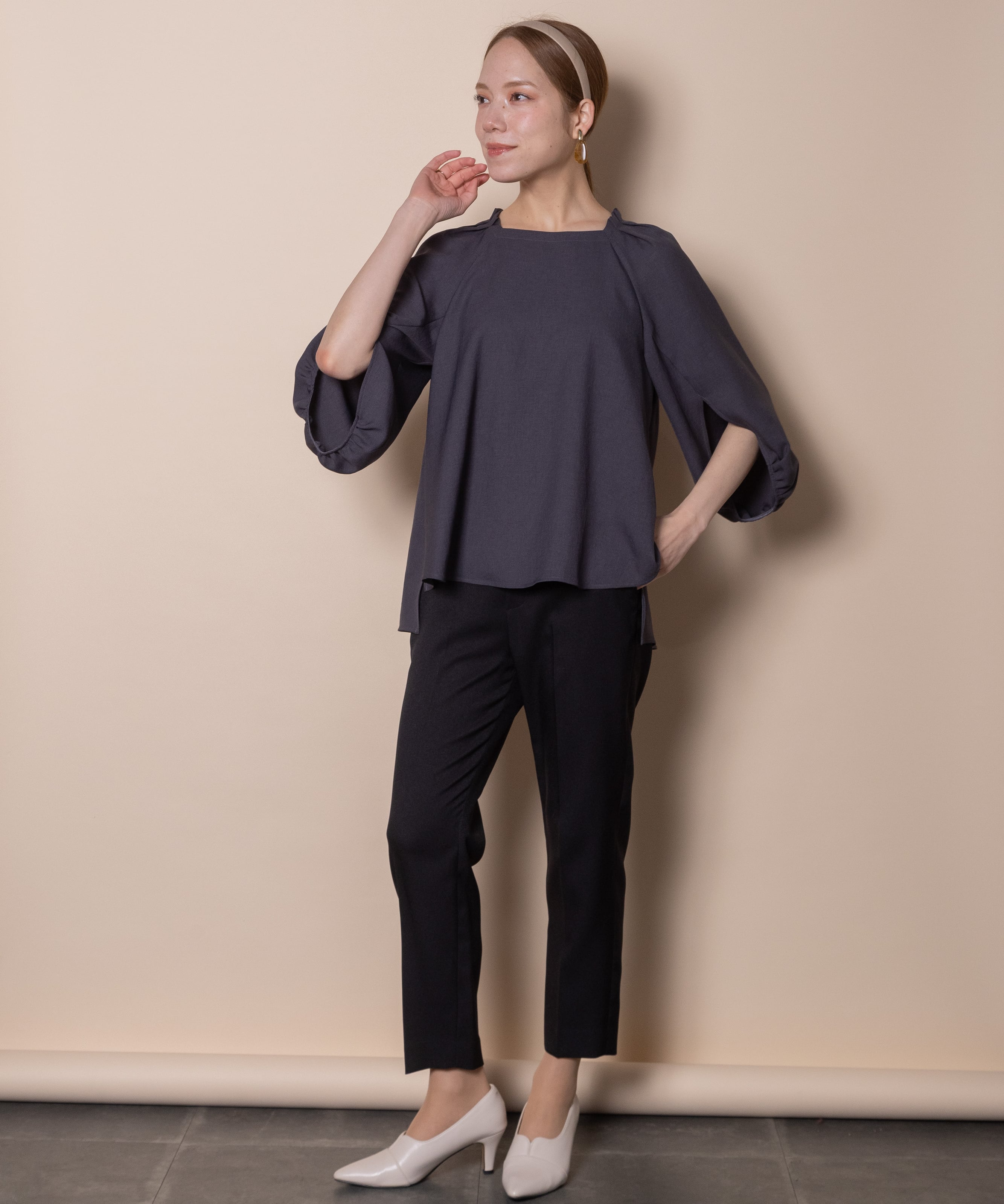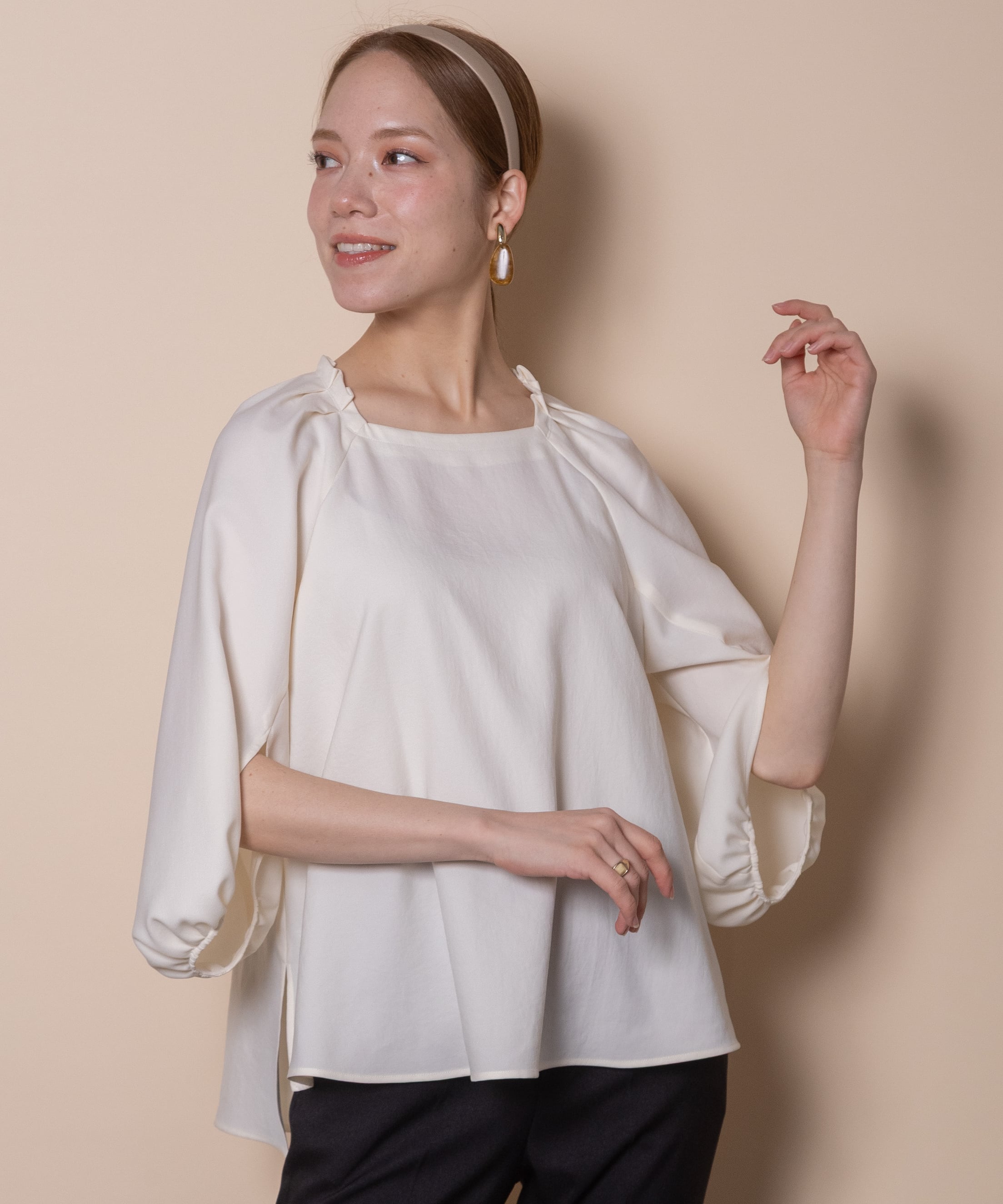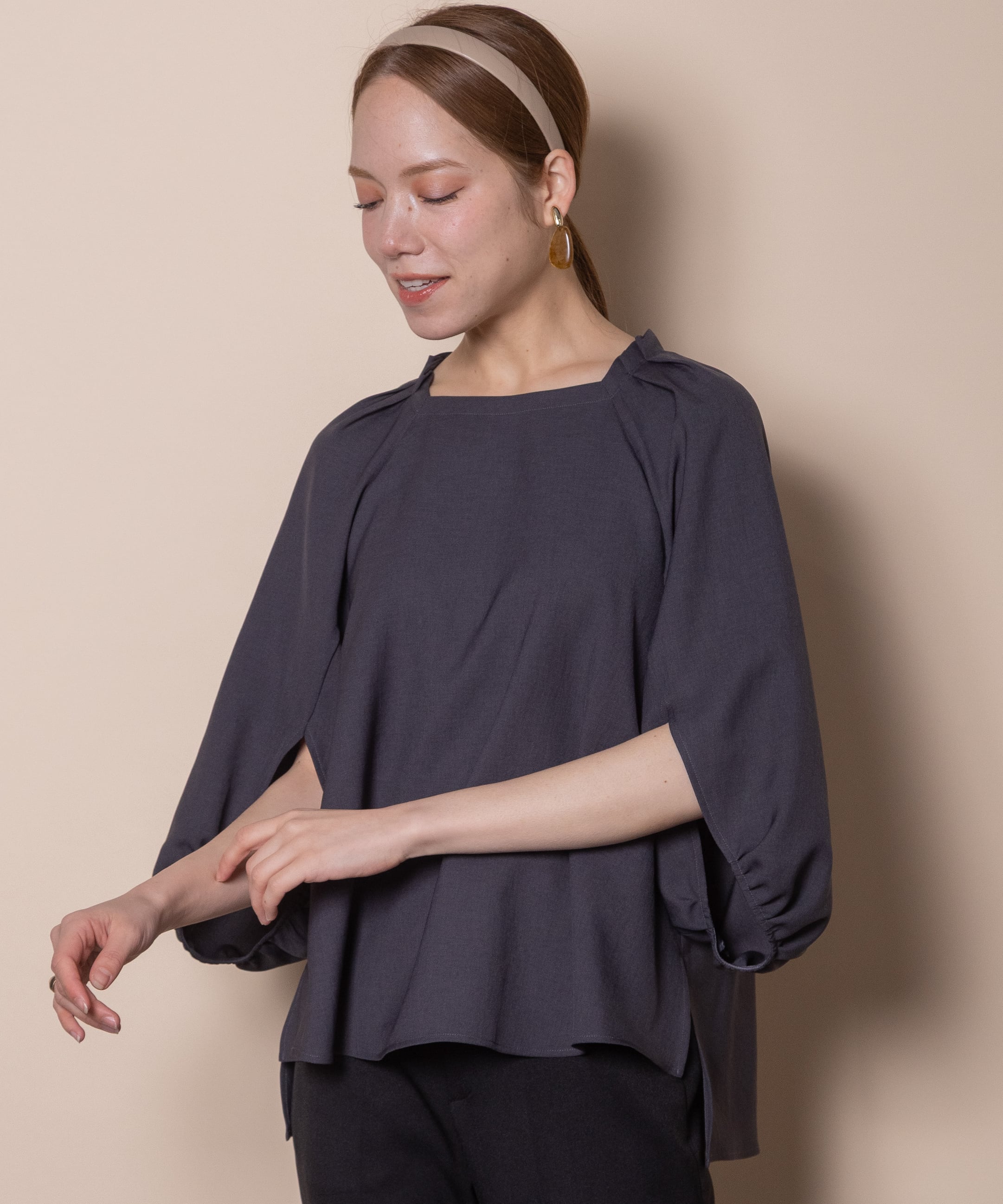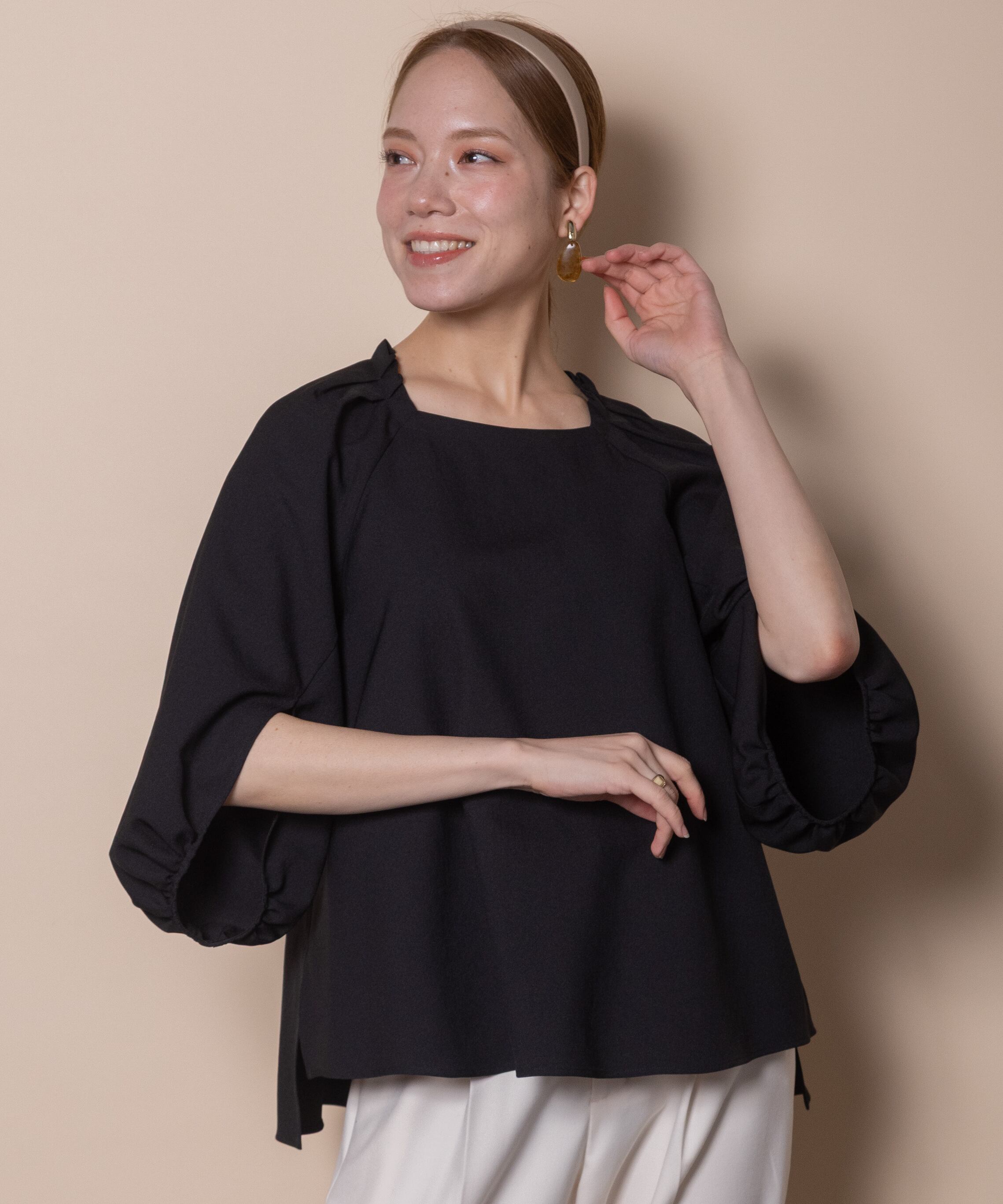 袖のデザイン性が魅力のプルオーバーブラウス。デコルテが美しく見える肩タックのスクエアネック、バックボタン、フレアーシルエットと華やかさのあるデザイン。着心地の良いストレッチジョーゼット素材でモードで雰囲気のあるアイテムです。タックインでもアウトでも決まるサイドスリット入り。