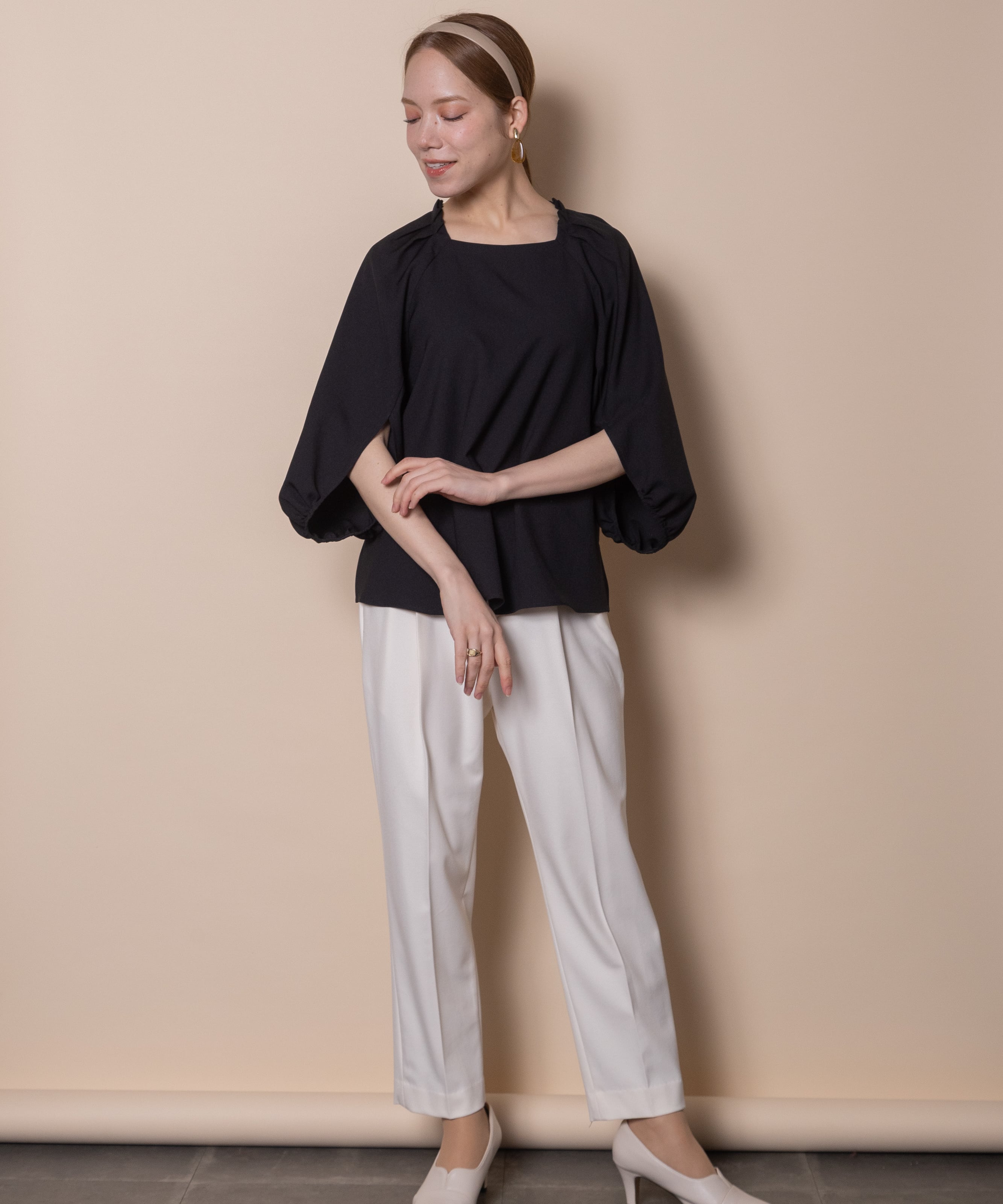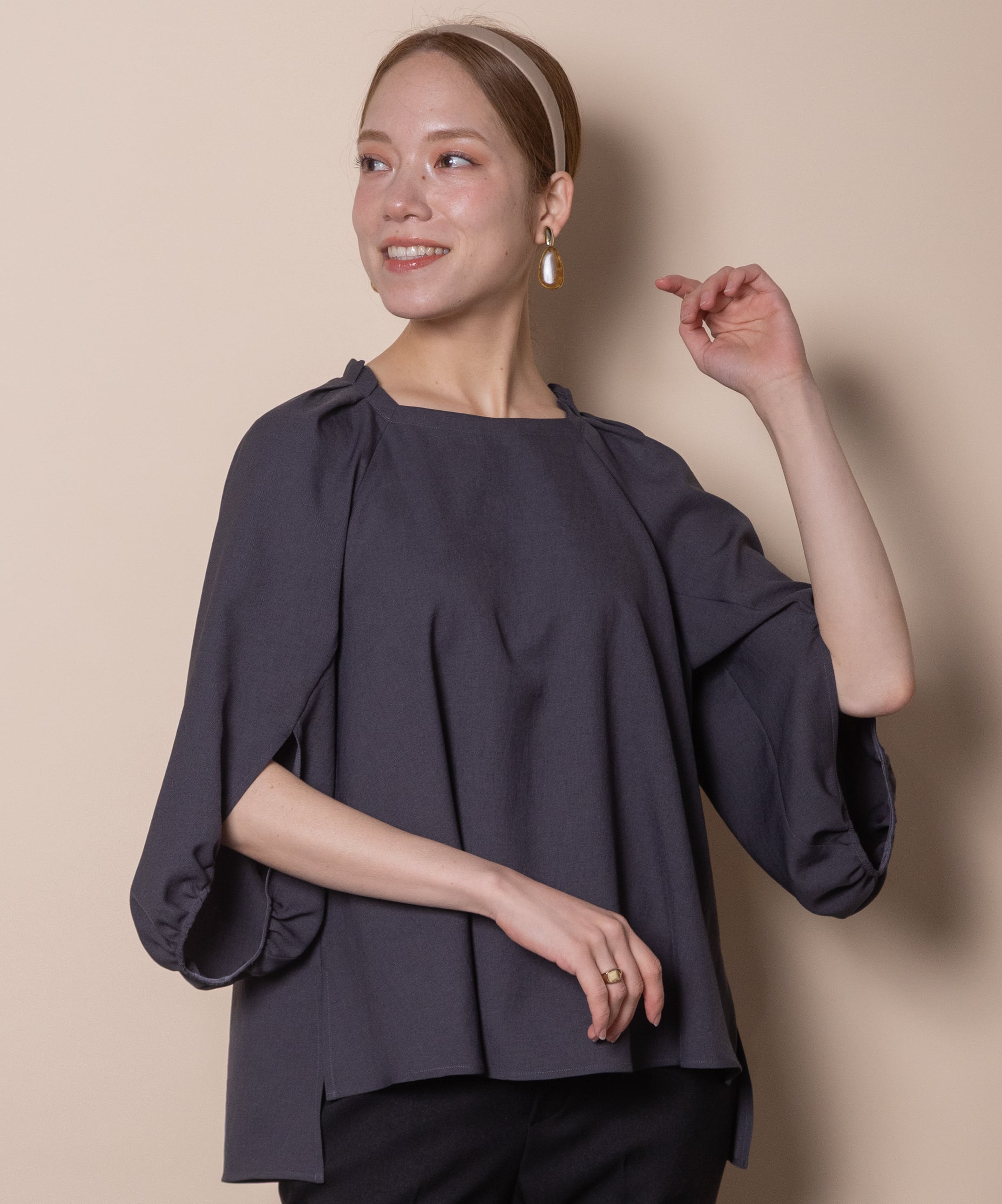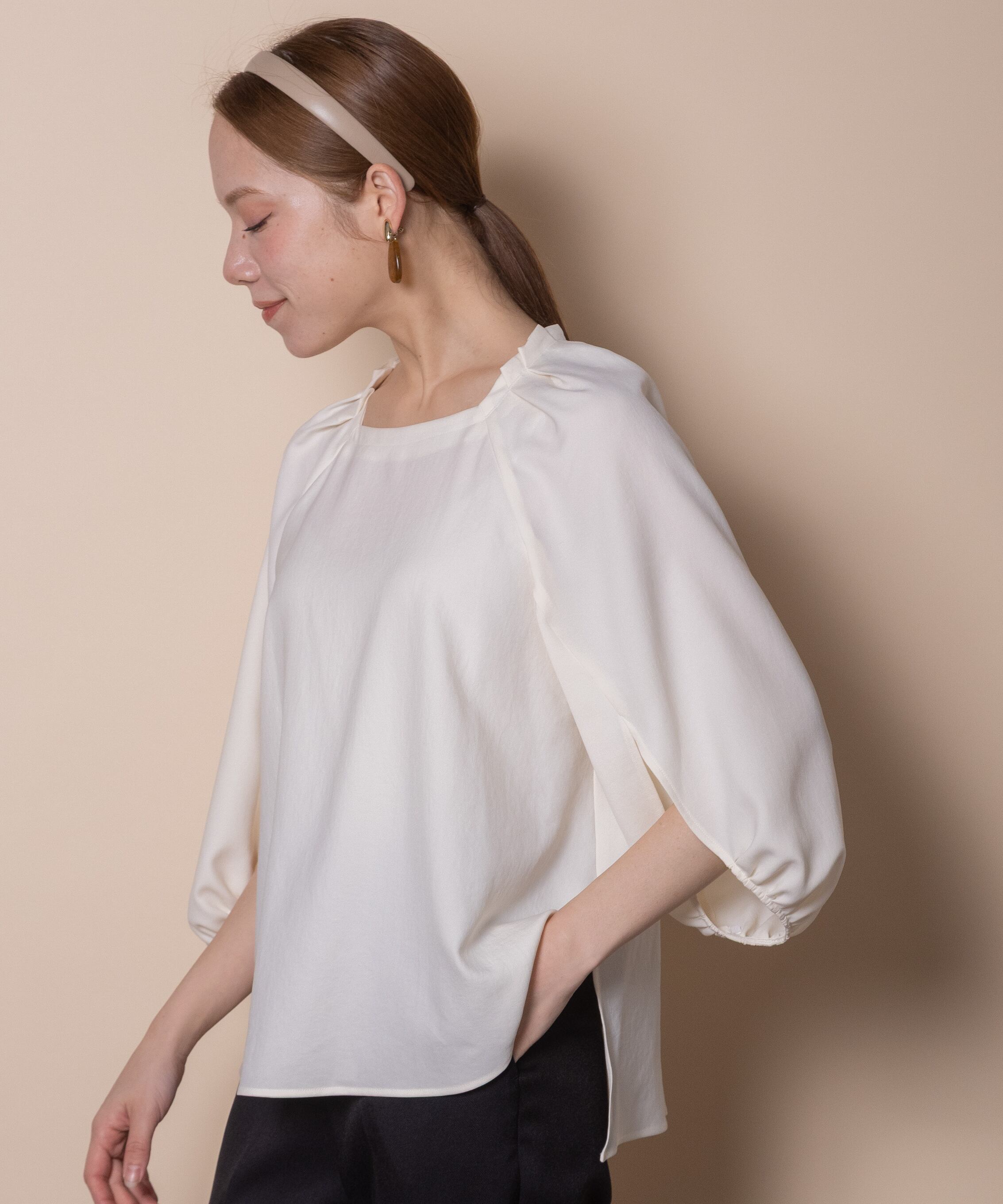 袖のデザイン性が魅力のプルオーバーブラウス。デコルテが美しく見える肩タックのスクエアネック、バックボタン、フレアーシルエットと華やかさのあるデザイン。着心地の良いストレッチジョーゼット素材でモードで雰囲気のあるアイテムです。タックインでもアウトでも決まるサイドスリット入り。