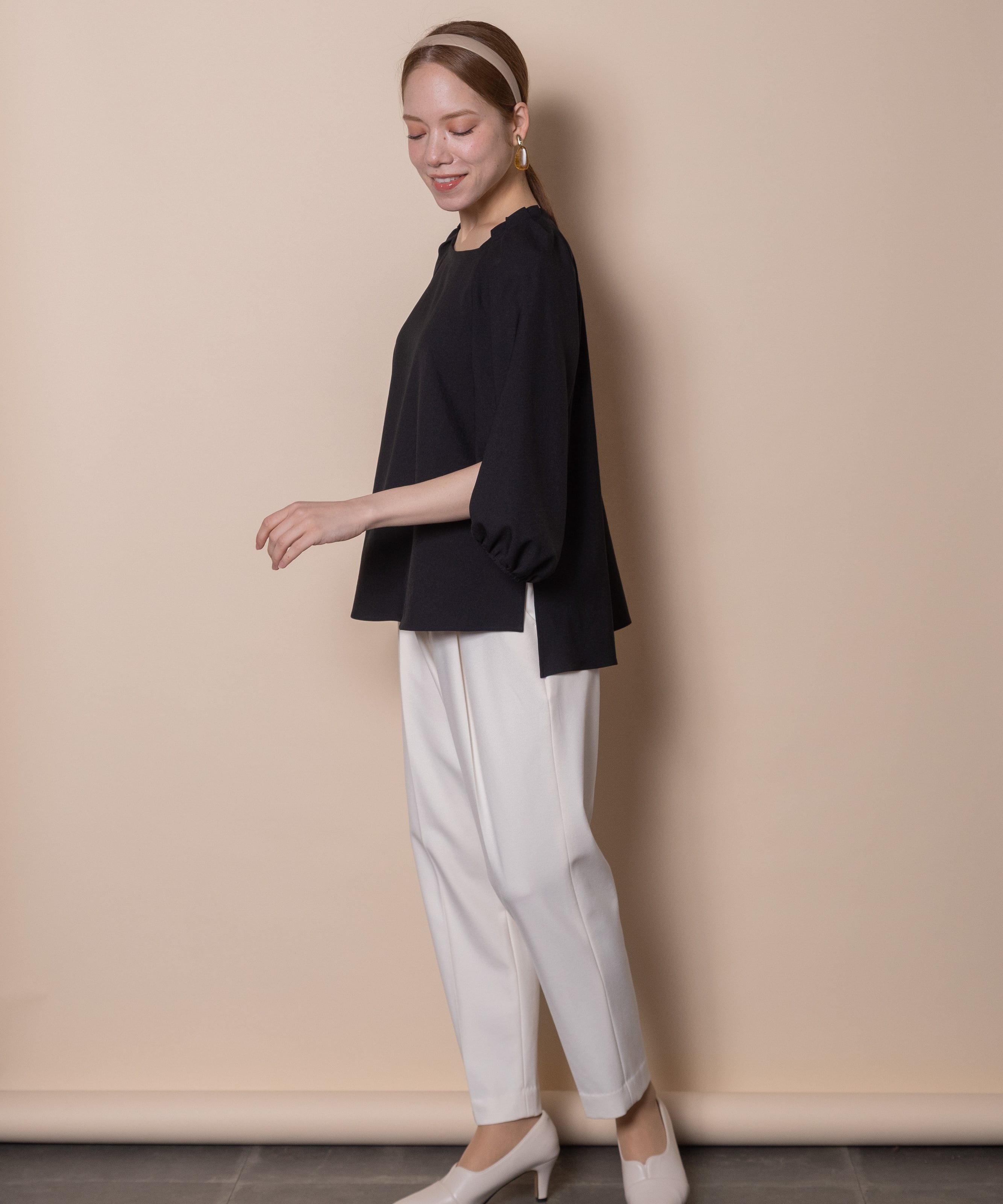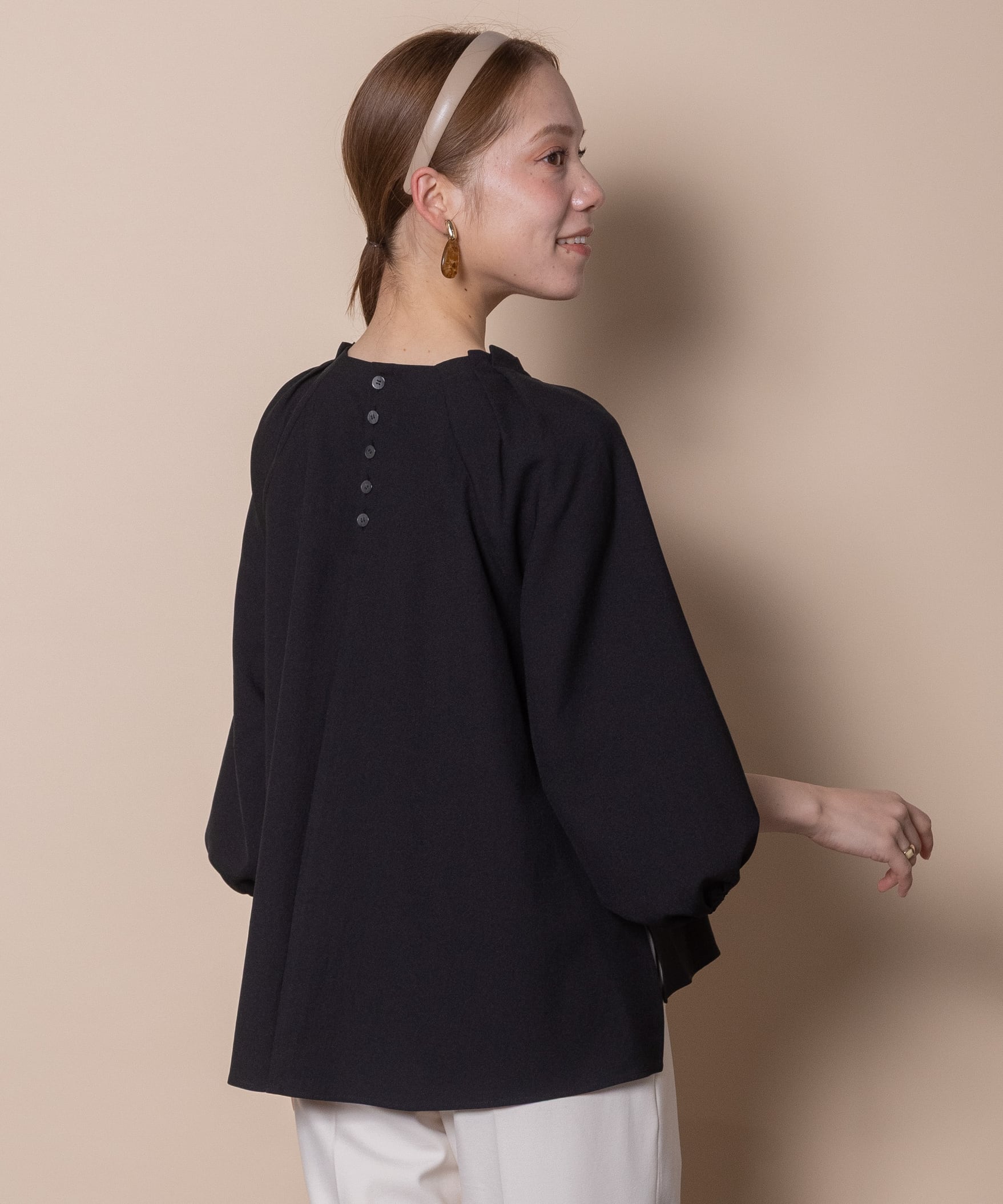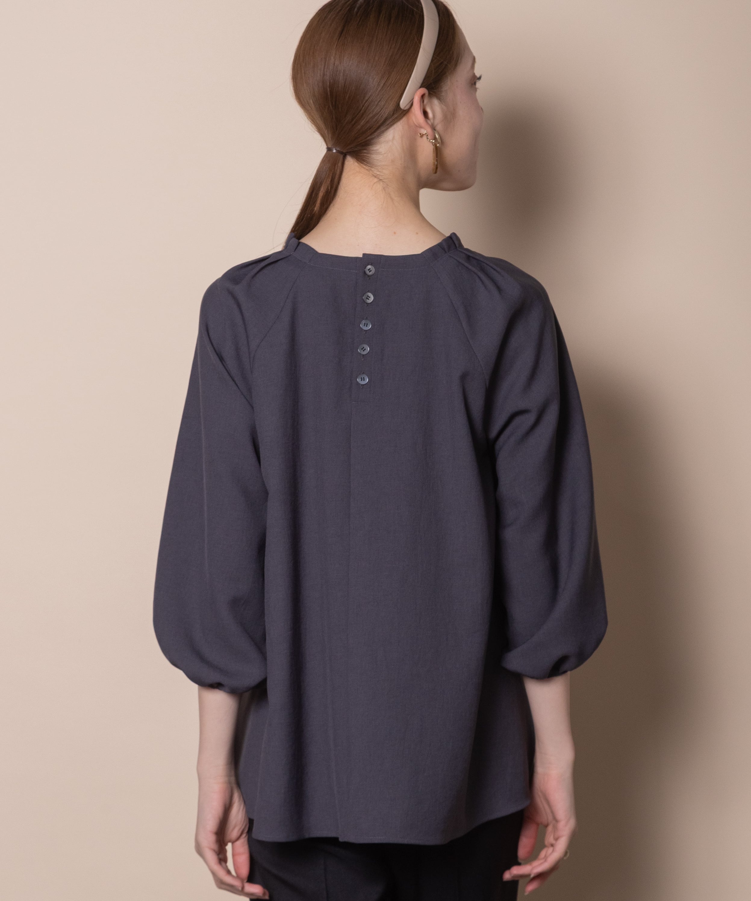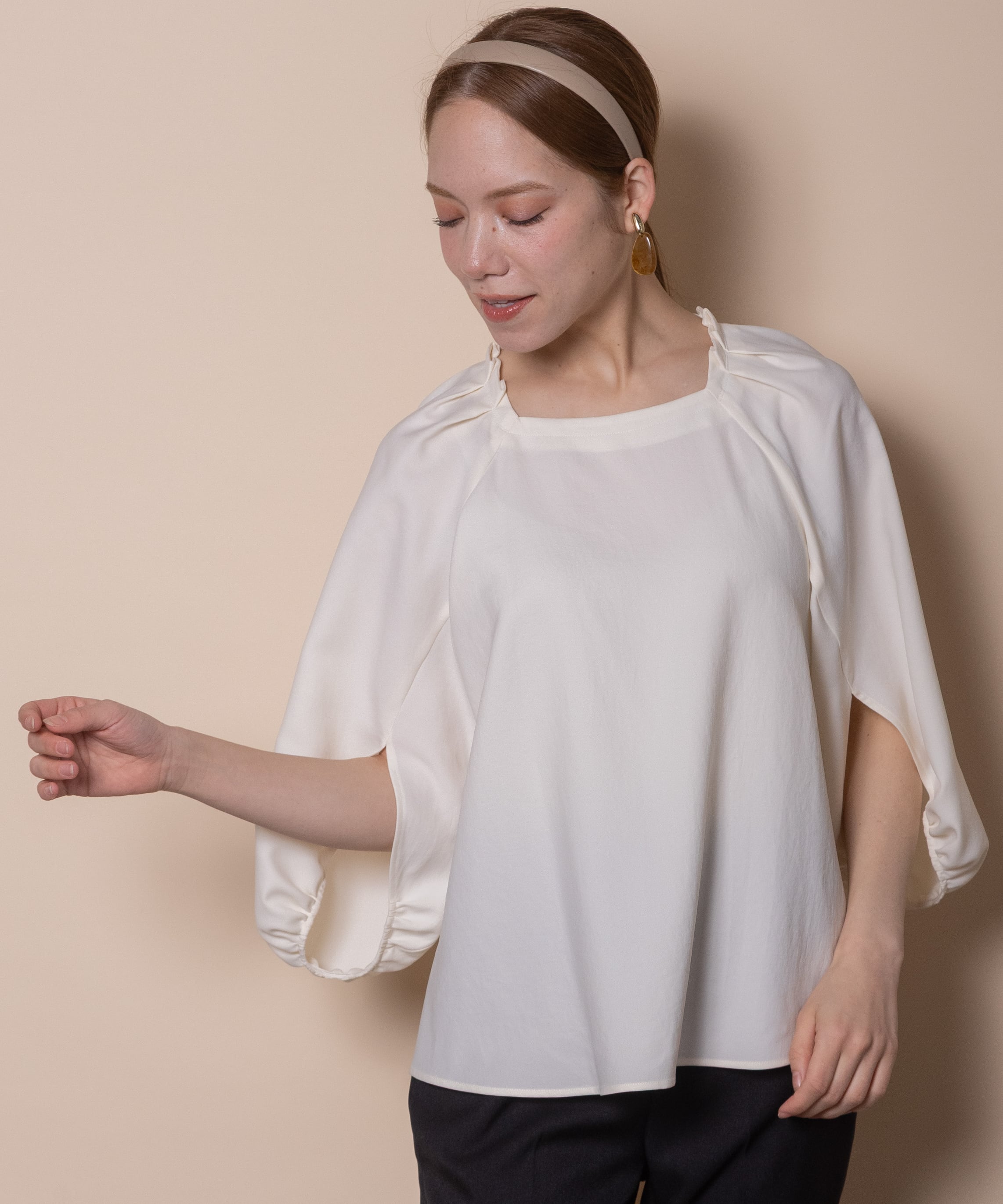 袖のデザイン性が魅力のプルオーバーブラウス。デコルテが美しく見える肩タックのスクエアネック、バックボタン、フレアーシルエットと華やかさのあるデザイン。着心地の良いストレッチジョーゼット素材でモードで雰囲気のあるアイテムです。タックインでもアウトでも決まるサイドスリット入り。