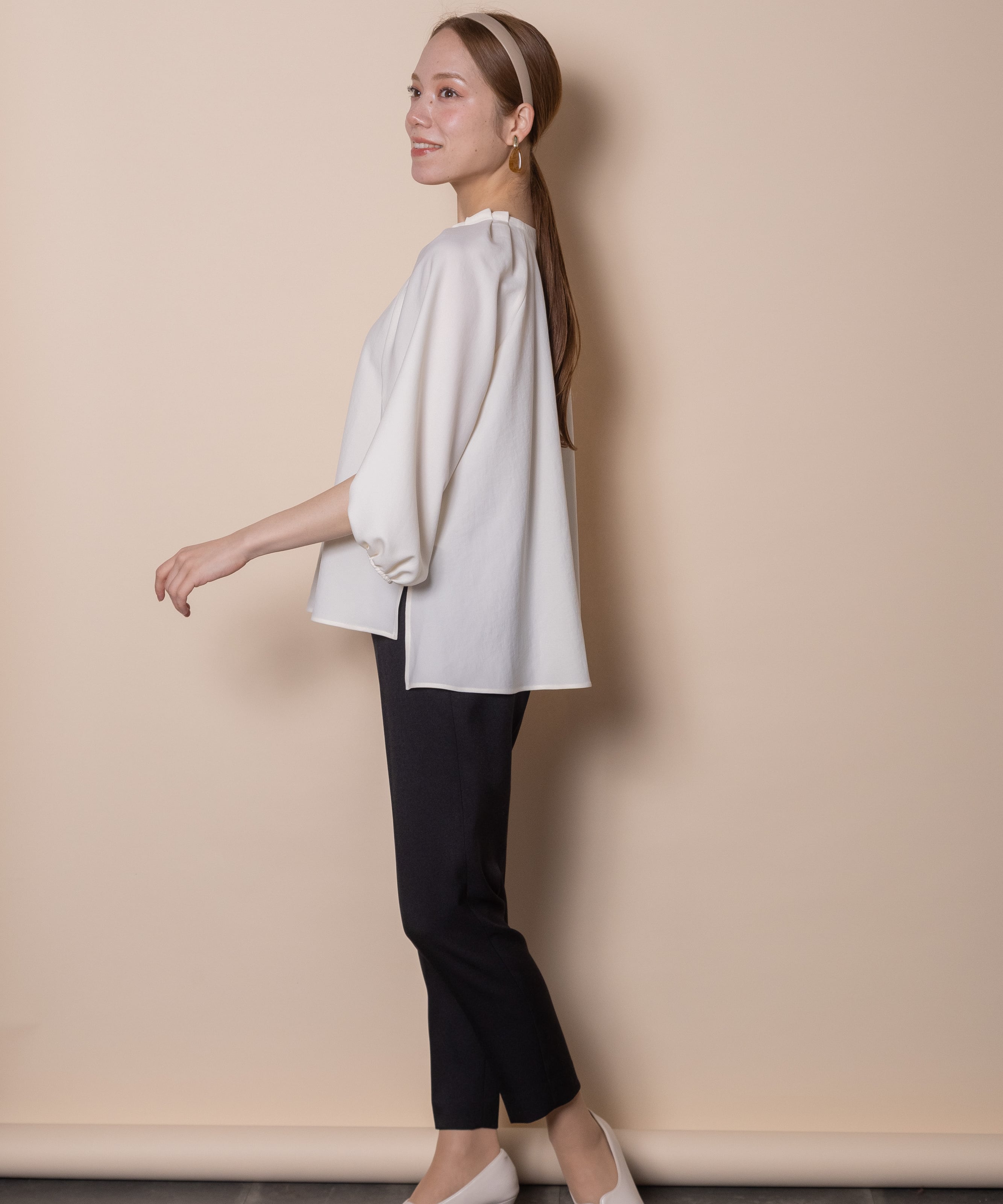 ナチュラルストレッチのツイルジョーゼット素材。シワにもなりにくくお手入れが楽なところも魅力。