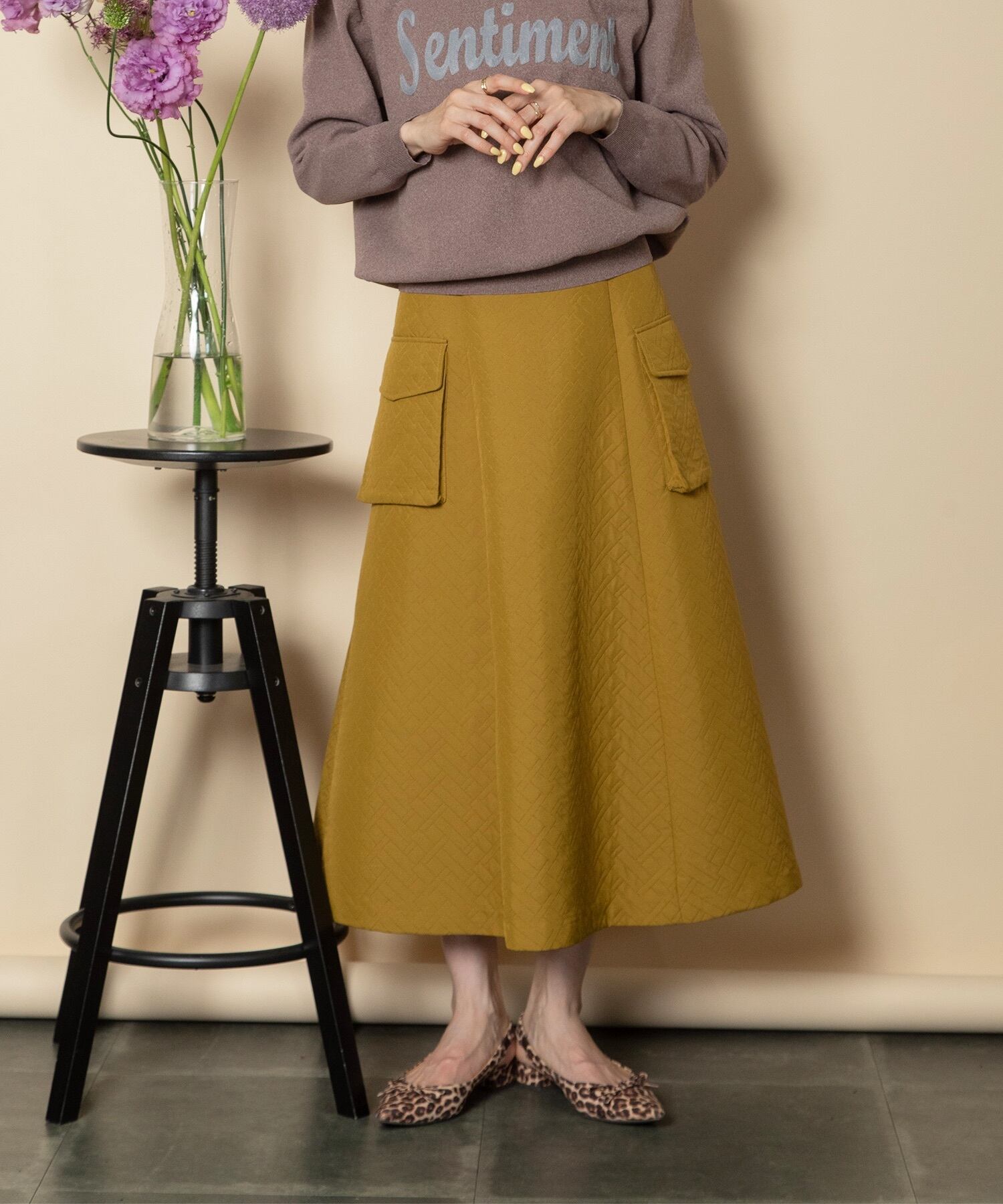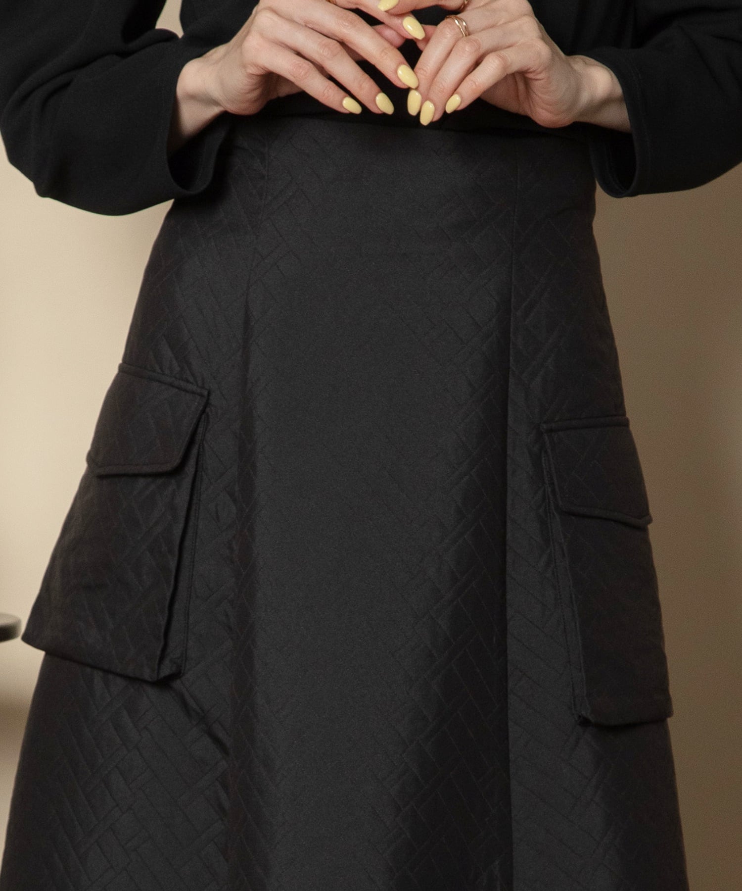 中綿キルトに見えるジャガードキルト素材。両サイドにマチ付きフラップポケットデザインのミリタリー風スカート。