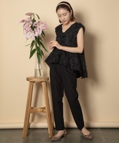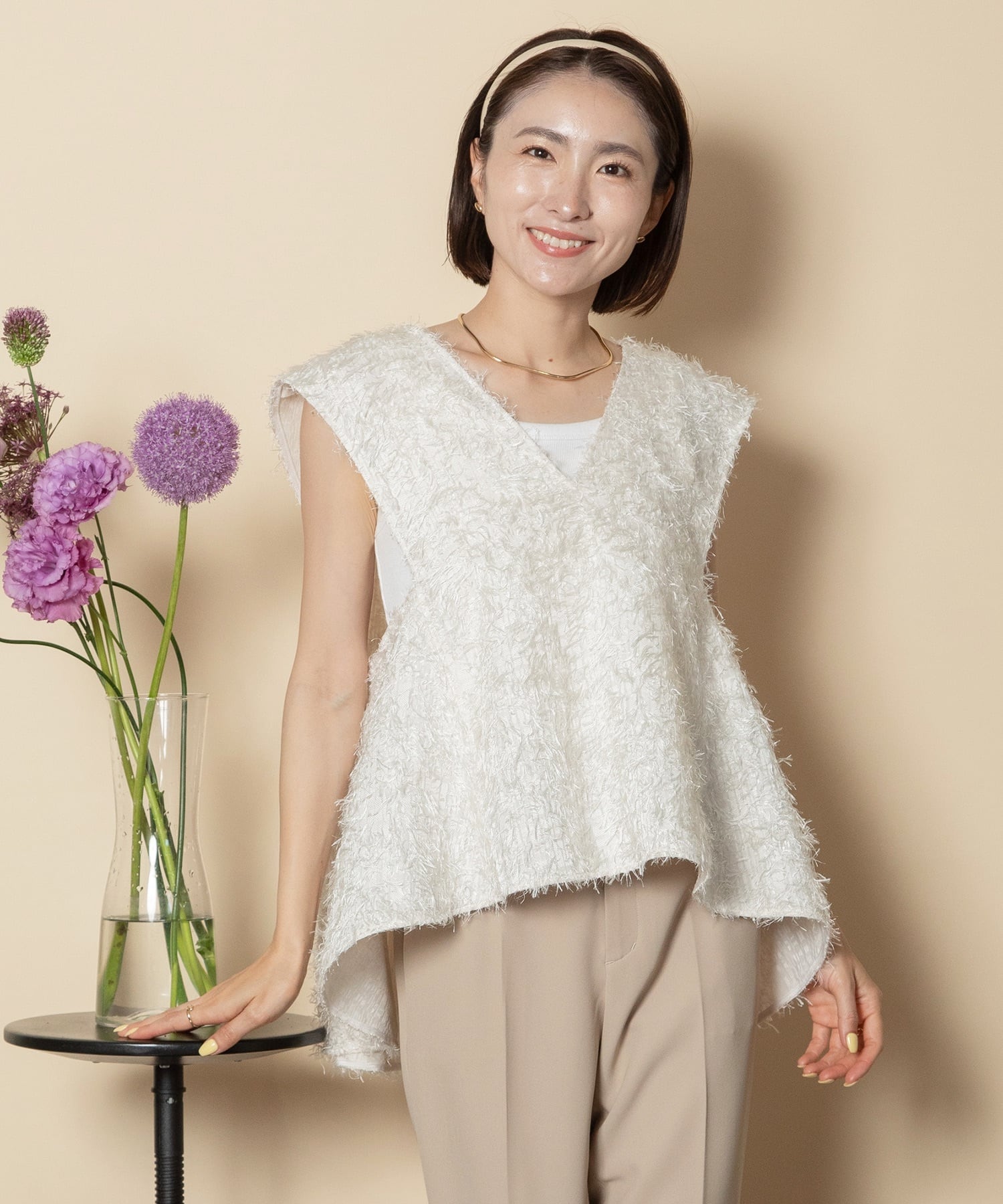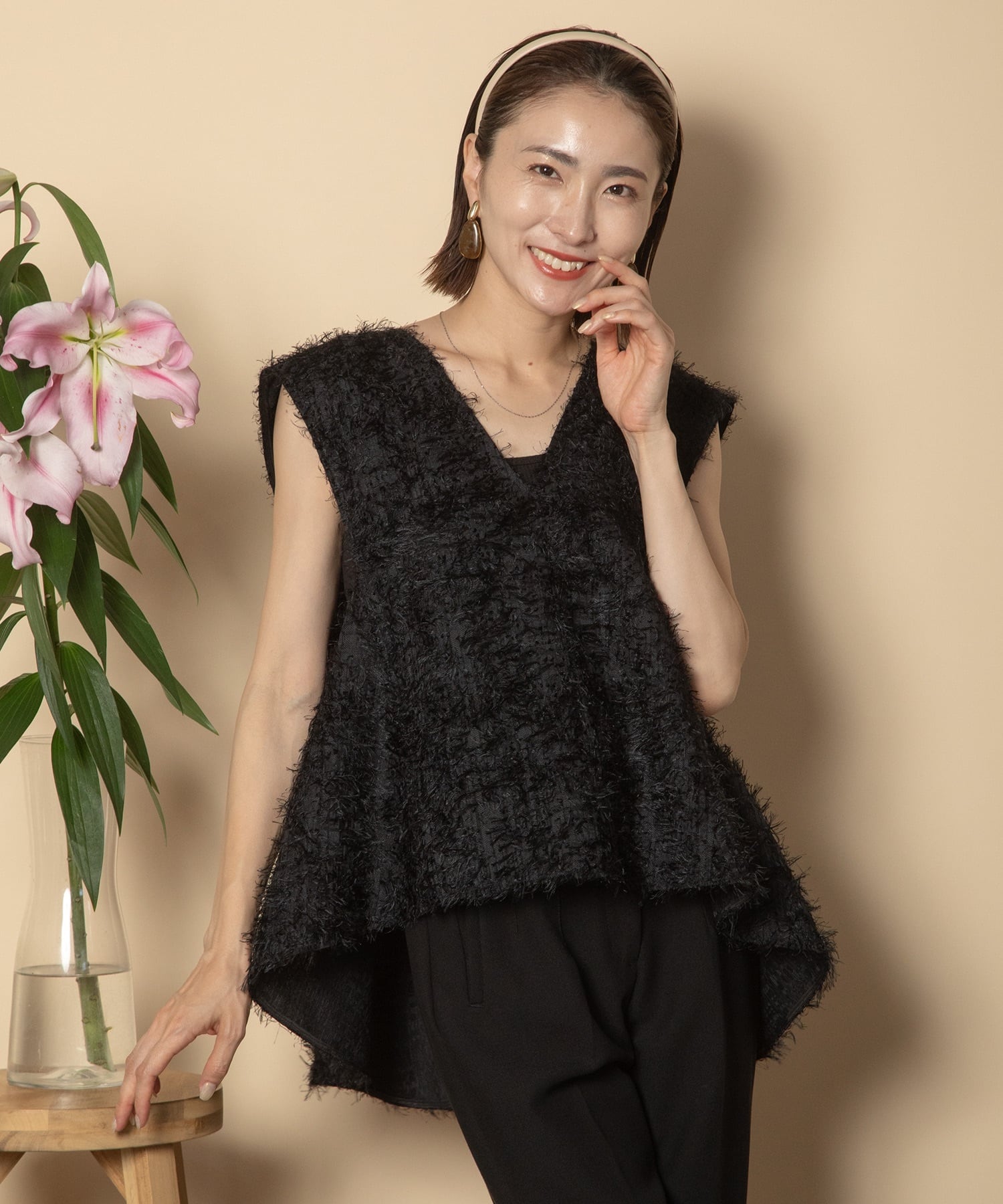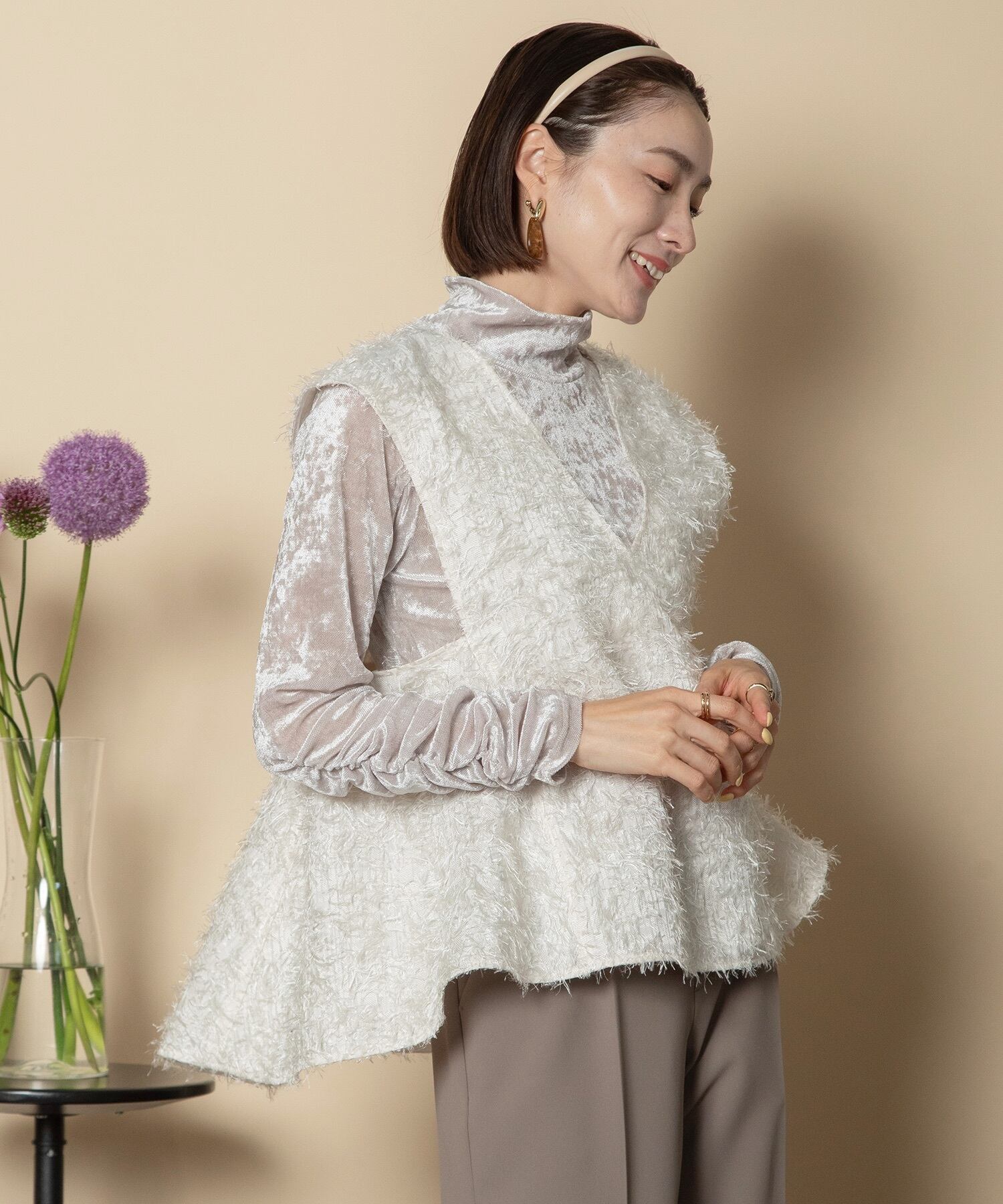 ふわふわ感が魅力のベスト。レイヤードコーデしやすい深めのVネック、肩広めのオーバーシルエット、バックはペプラムフレアーとこなれ感あるデザイン。季節の端境期に活躍するおしゃれなプラスワンアイテム。