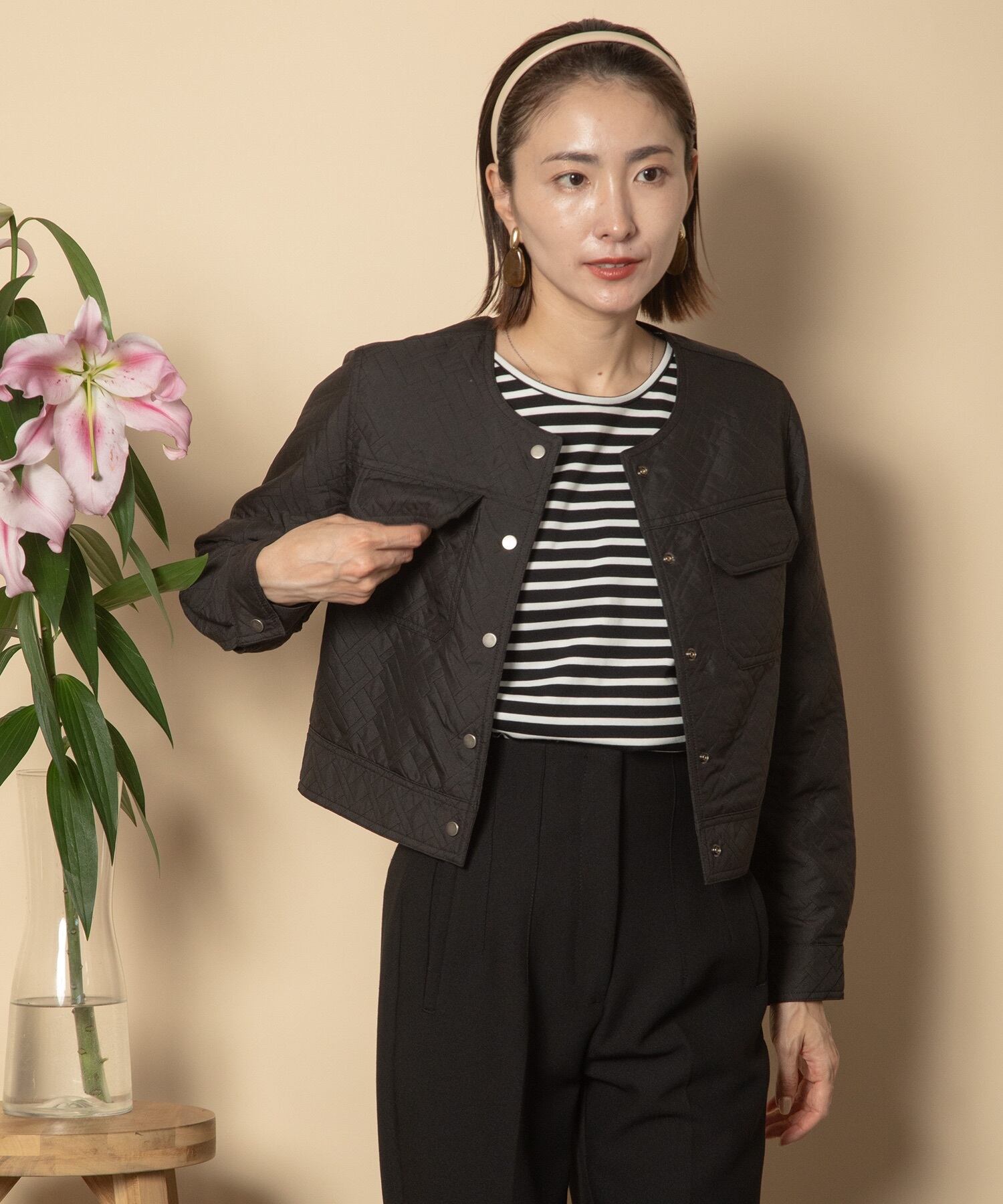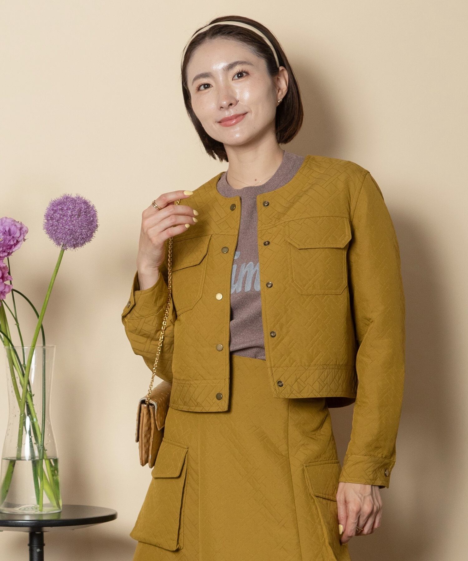 軽くて暖かくお手入れ楽ちんと三拍子揃って機能性に優れたジャガードキルトのノーカラージャケット。フラップポケットにスナップボタンの程よいカジュアル感のあるデザイン。トレンドのショートクロップド丈。