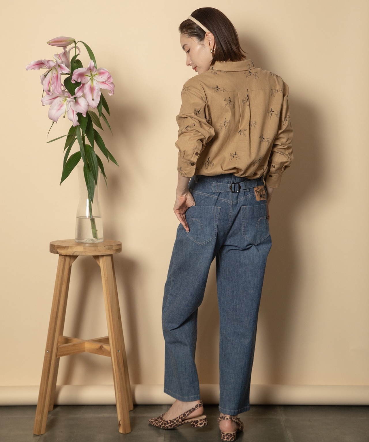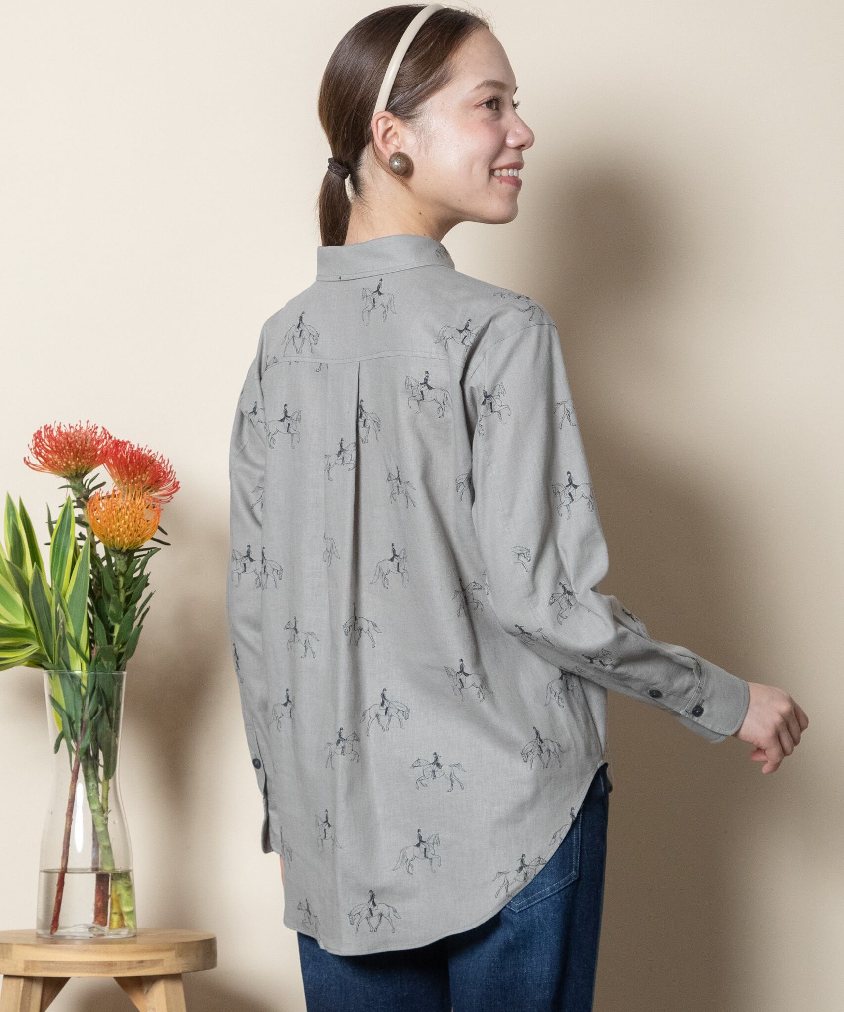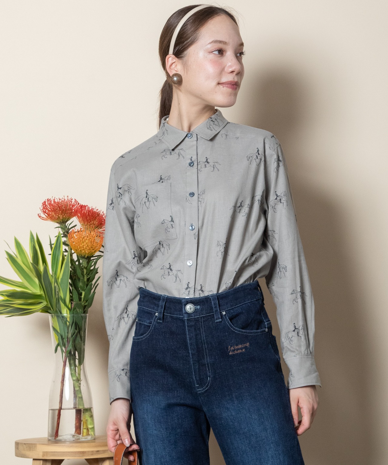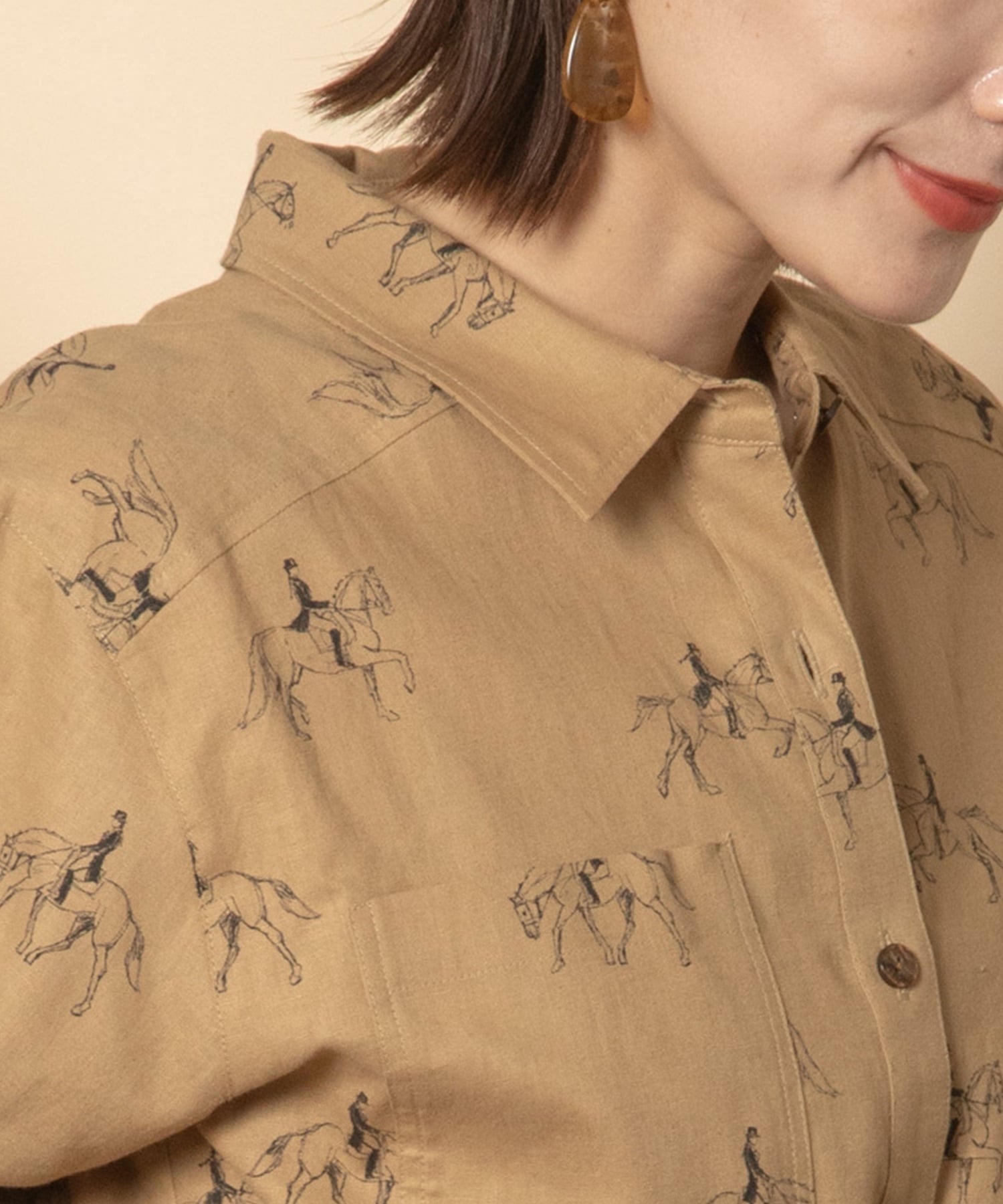 毎シーズン人気のオリジナルリネンシリーズ。今シーズンは繊細なタッチで描かれている馬術競技中の馬柄プリントを施したベーシックシャツ。
