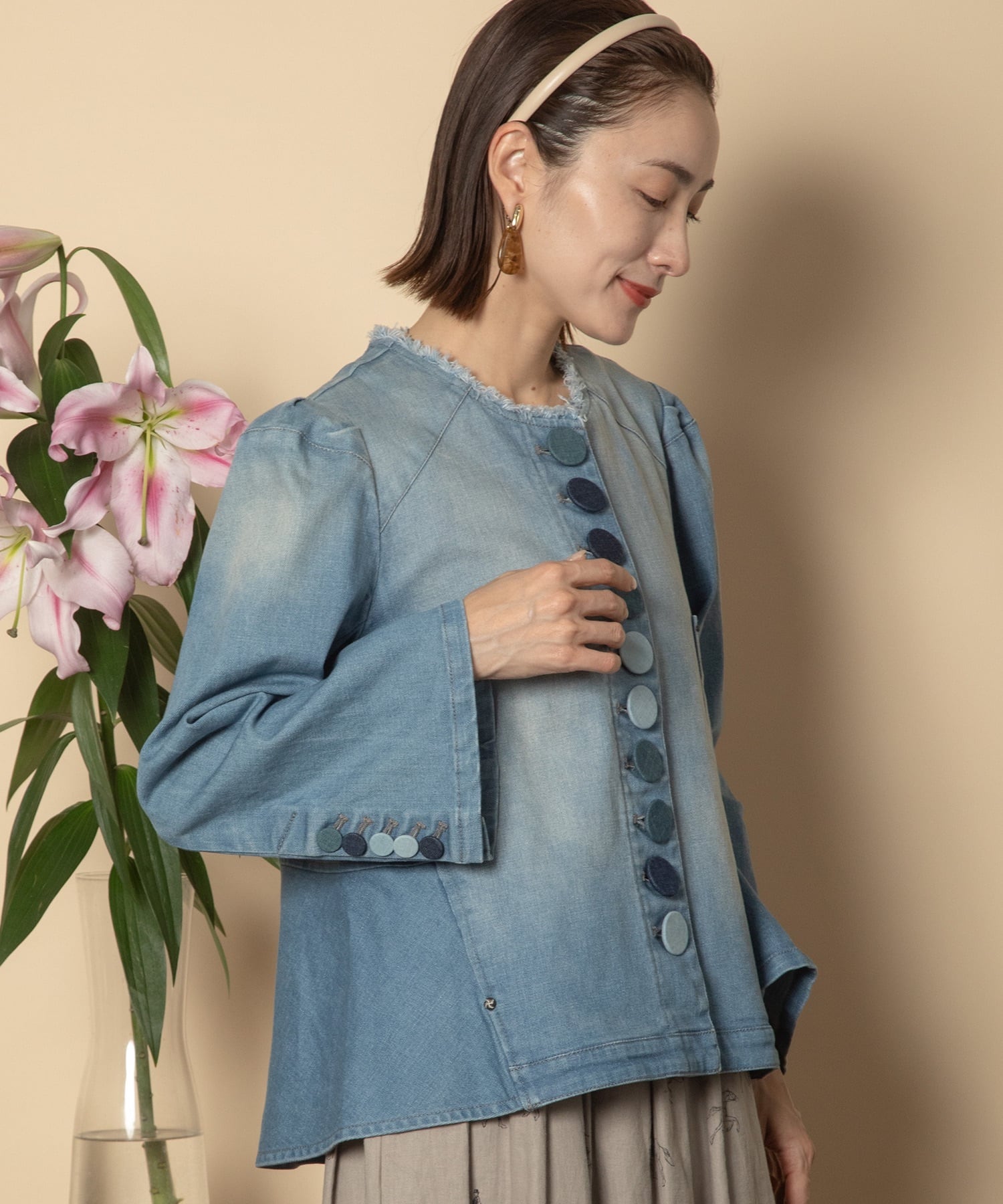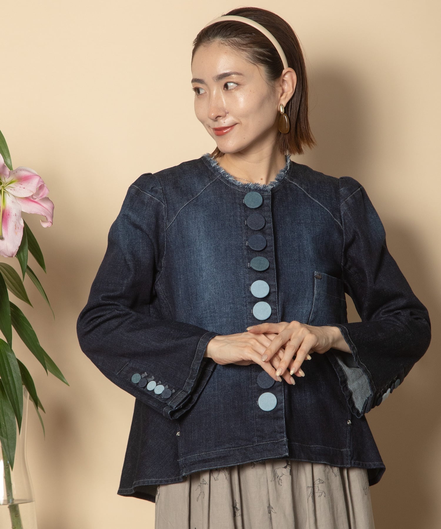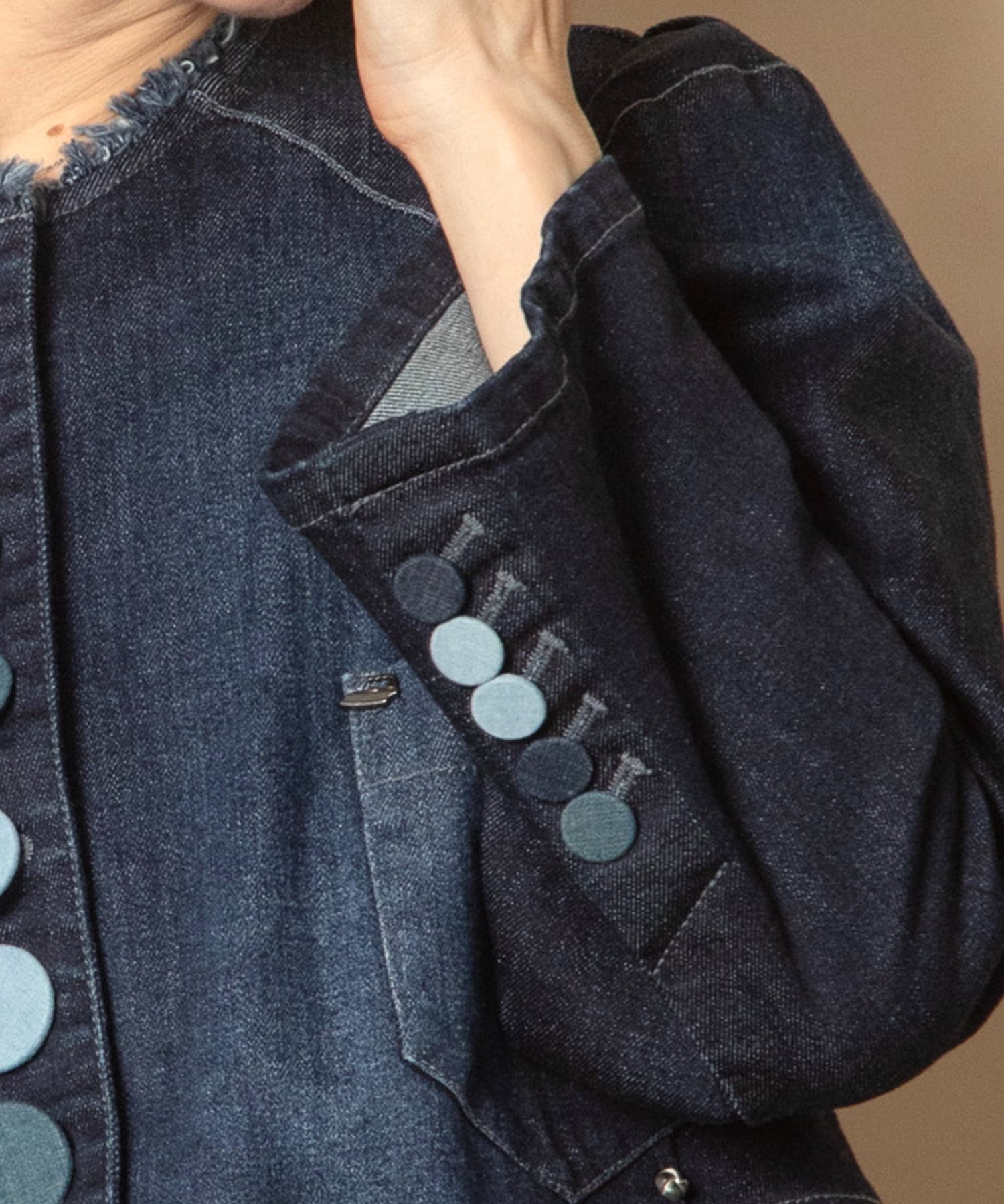 三種類のインディゴカラーのくるみボタンをランダムに並べたクラフト感あるデニムジャケット。ネックは断ち切り、肩がクッと入った立体的なショルダー、立体裁断と主役になるこだわりアイテム。