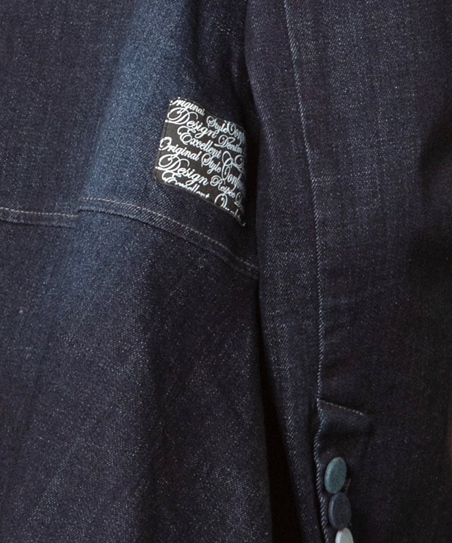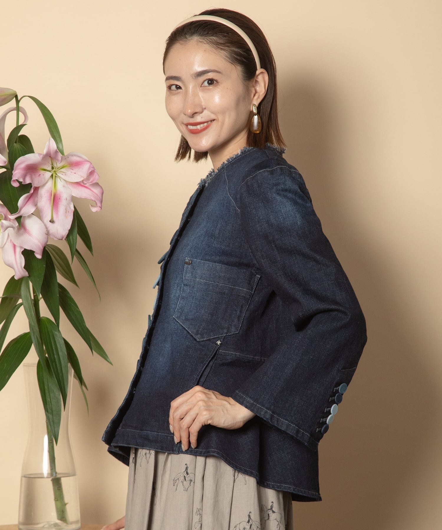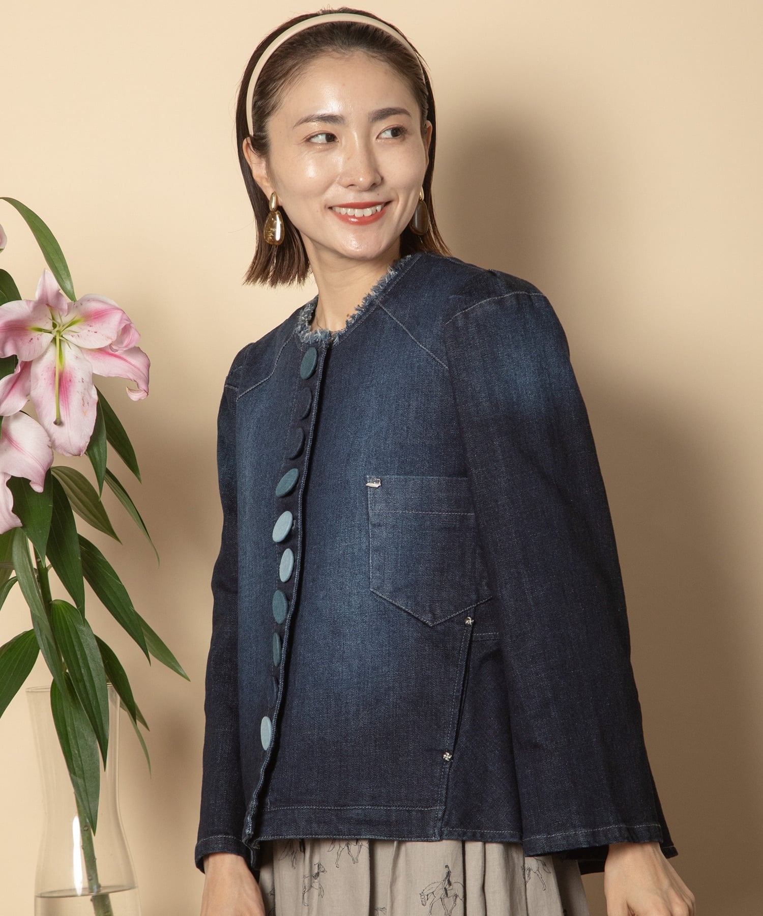 三種類のインディゴカラーのくるみボタンをランダムに並べたクラフト感あるデニムジャケット。ネックは断ち切り、肩がクッと入った立体的なショルダー、立体裁断と主役になるこだわりアイテム。