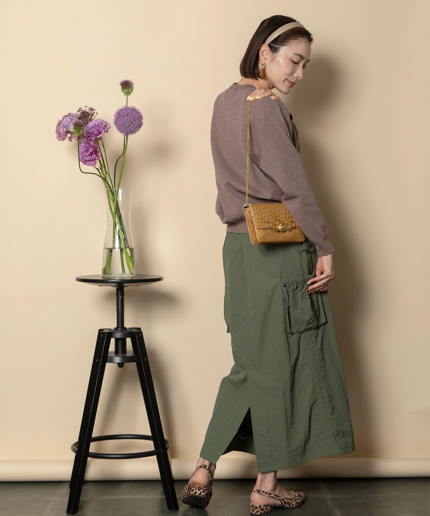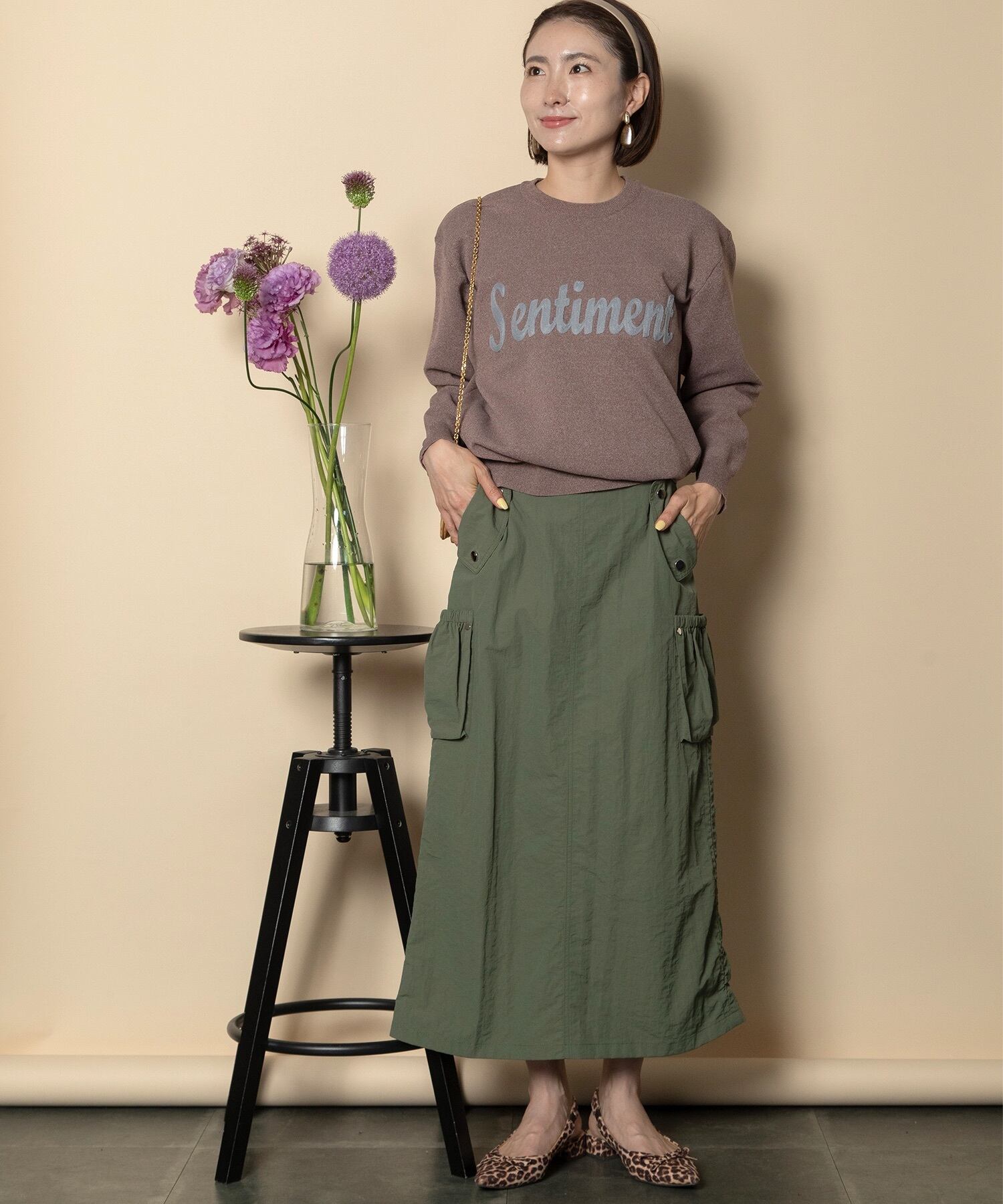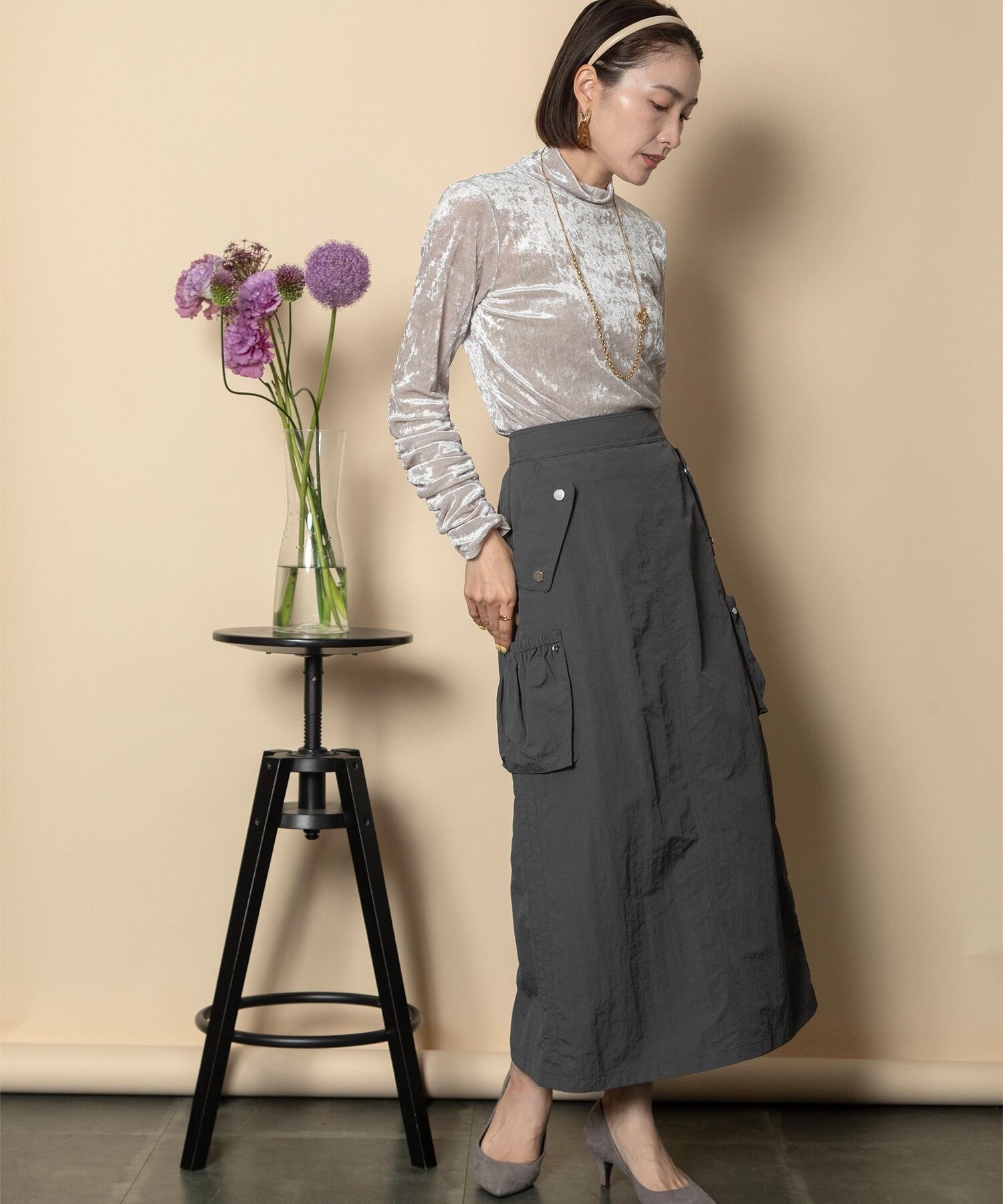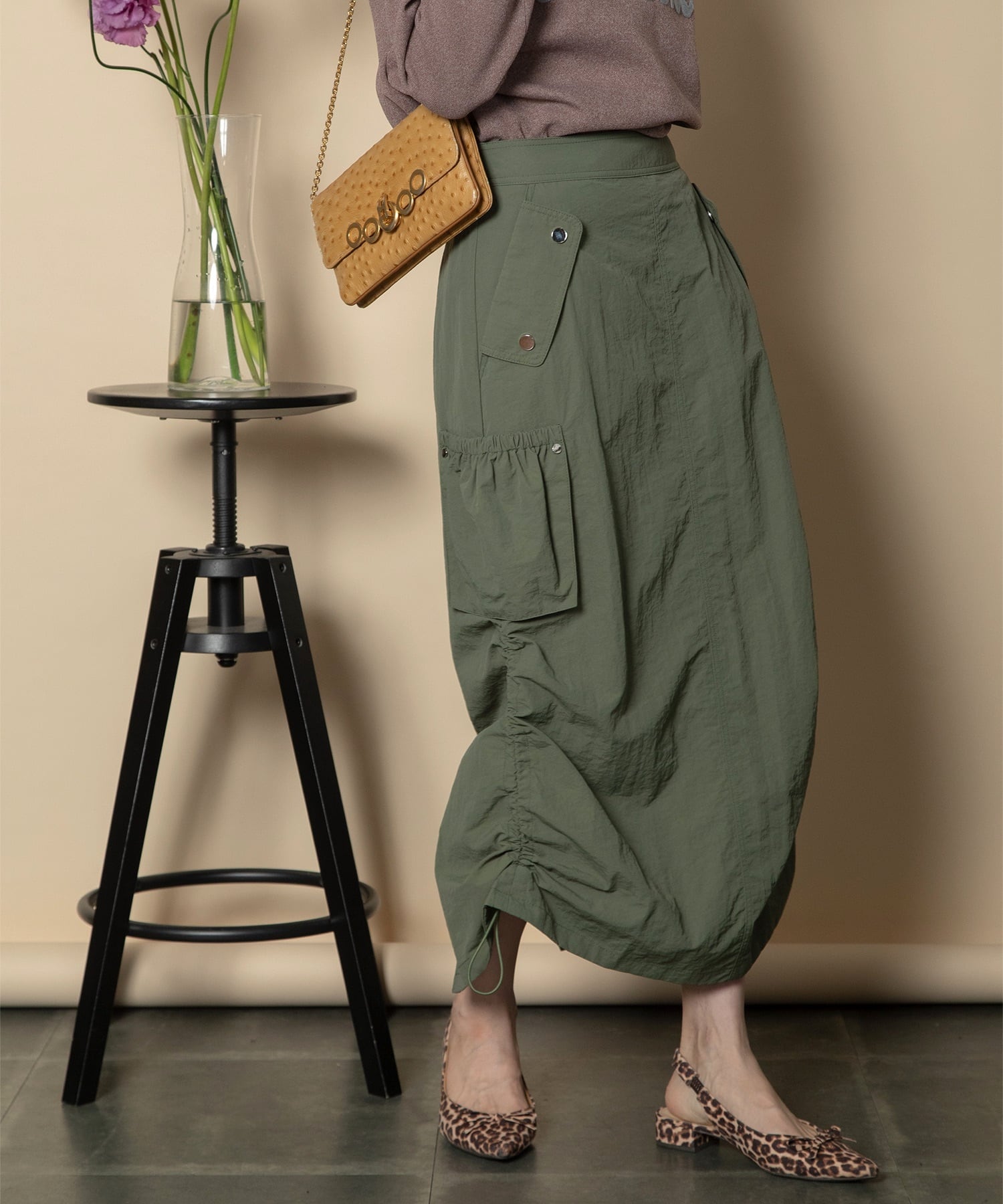 裾にドロストコードが付いており、タイトとバルーンの2WAYシルエットで楽しめるデザインカーゴスカート。ミリタリーテイストのマチ付きフラップポケットがポイント。