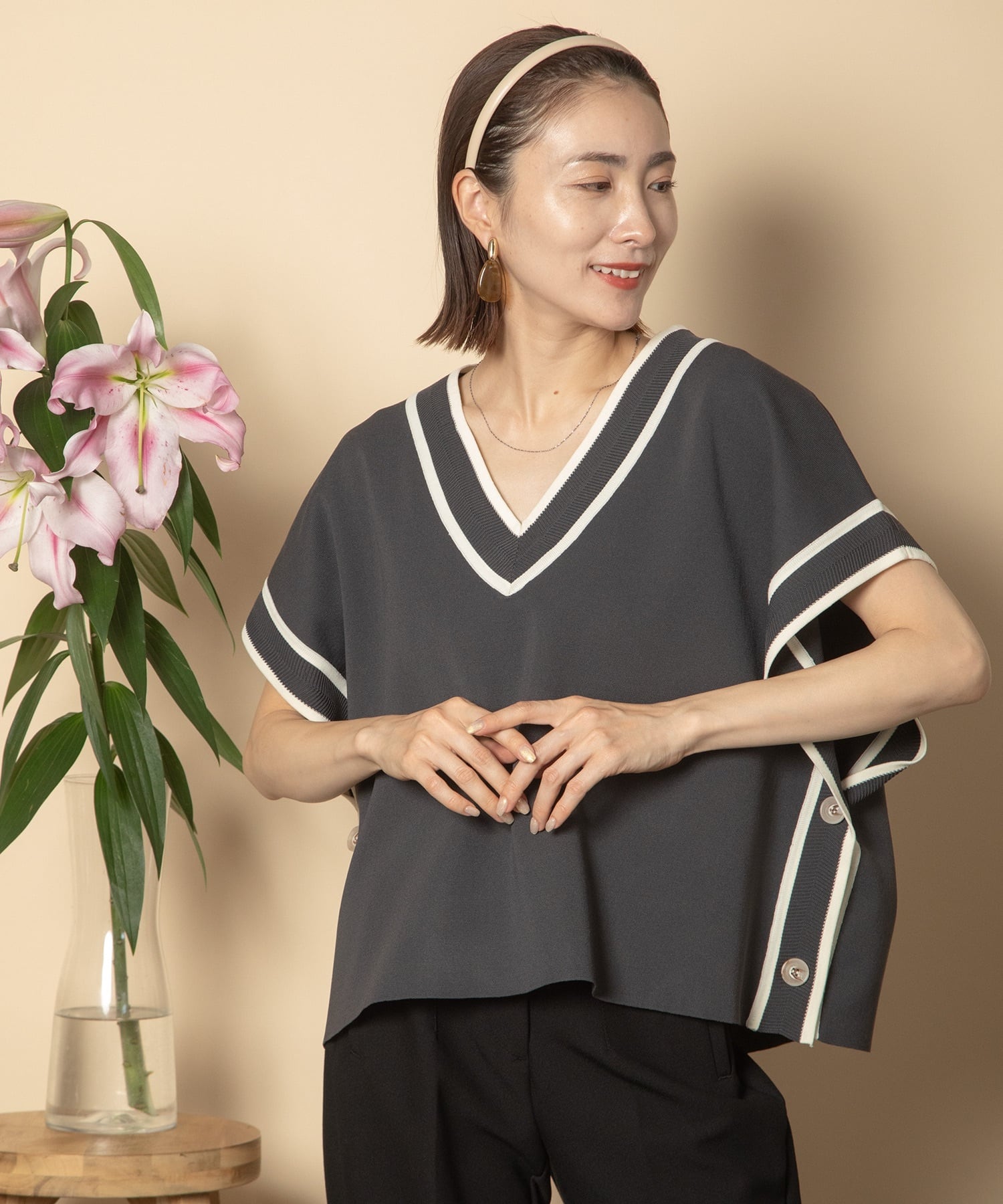 プラスワンアイテムで人気のニットベスト。今シーズンはトレンドのチルデンベスト。オーバーサイズのボックスシルエット。両脇はボタンで開閉ができるデザイン。
