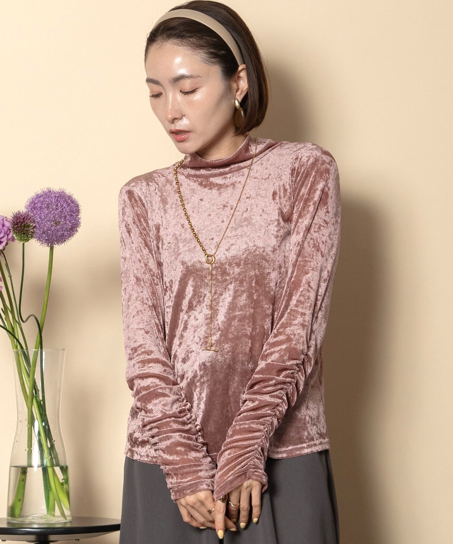 インナーの大本命。光沢感と着やすさで人気のクラッシュベロアタートル。長めの袖でクシュ袖がポイント。窮屈さのない程よいフィット感の万能インナー。1枚でもレイヤードでも大活躍間違いなし。
