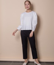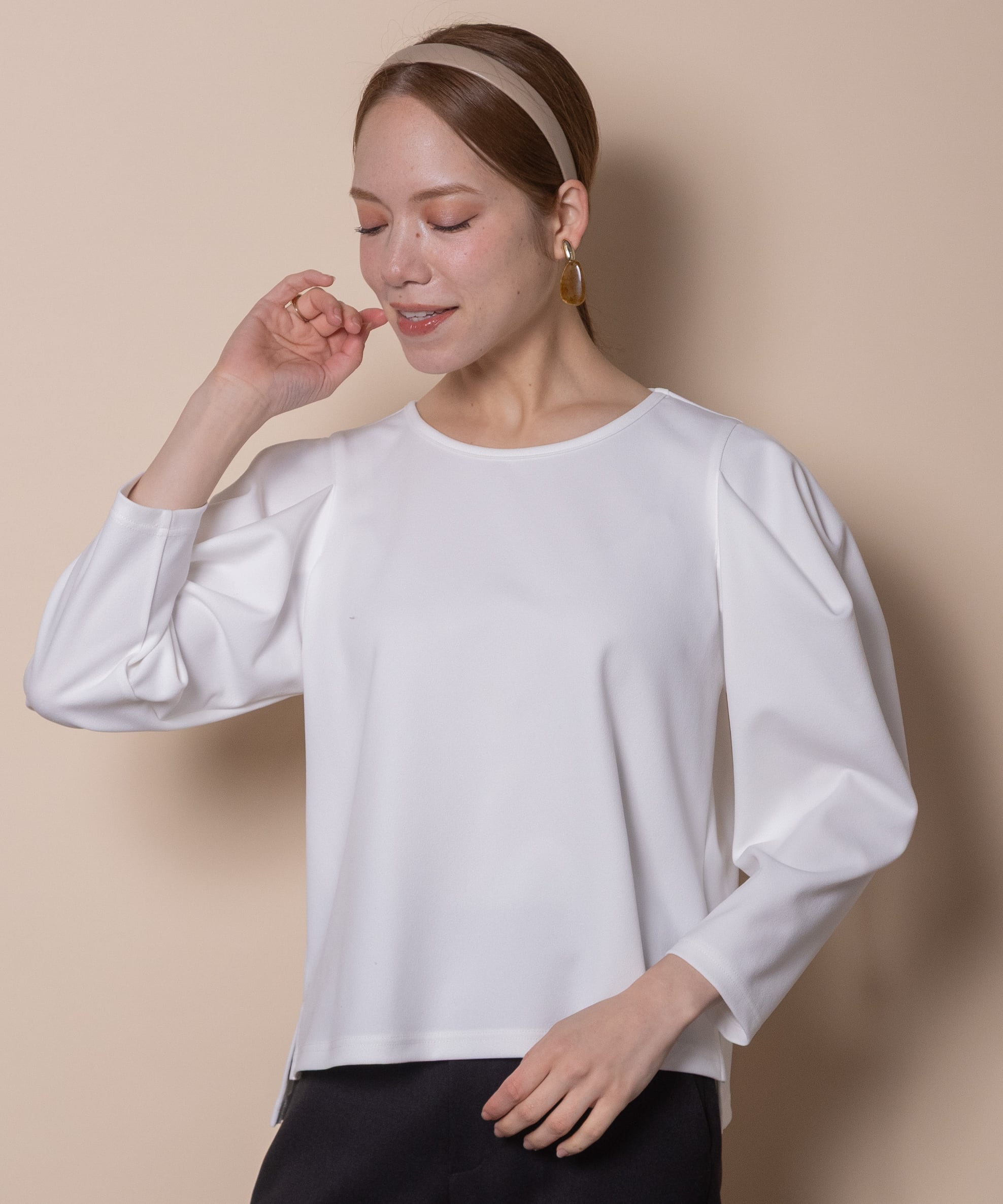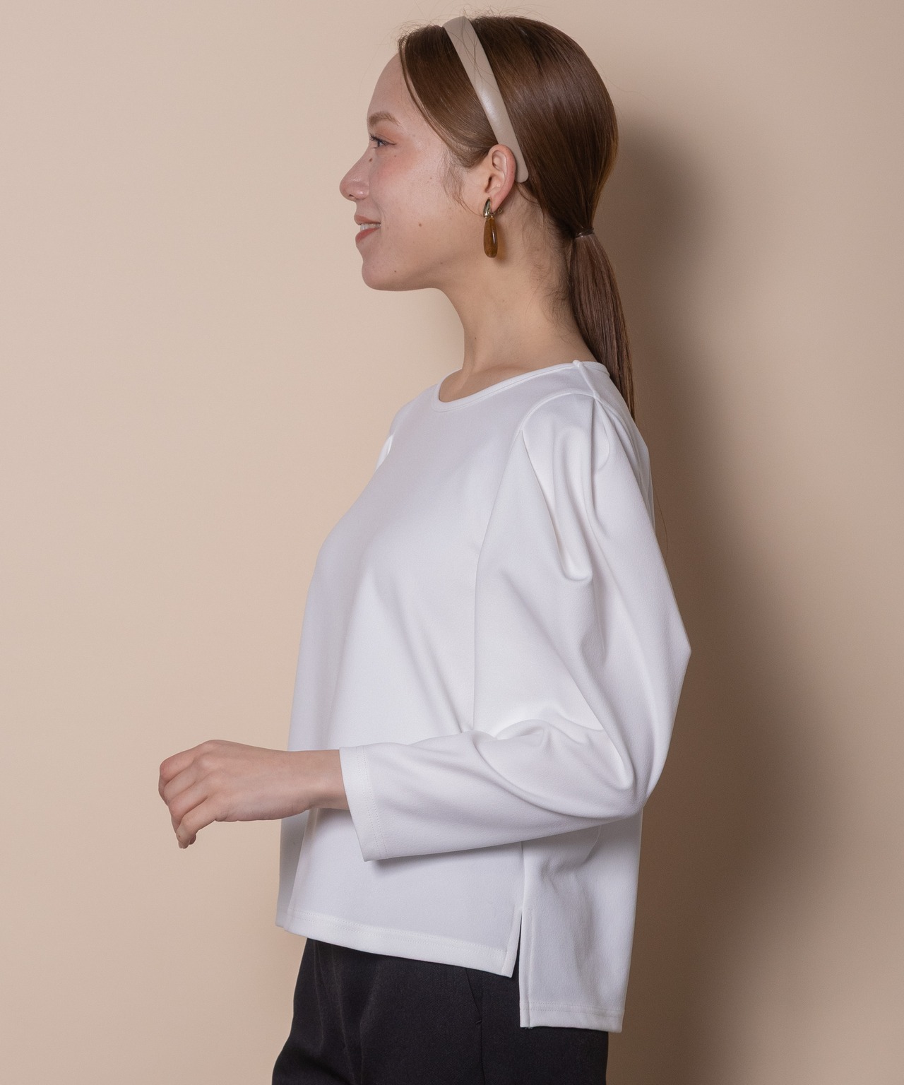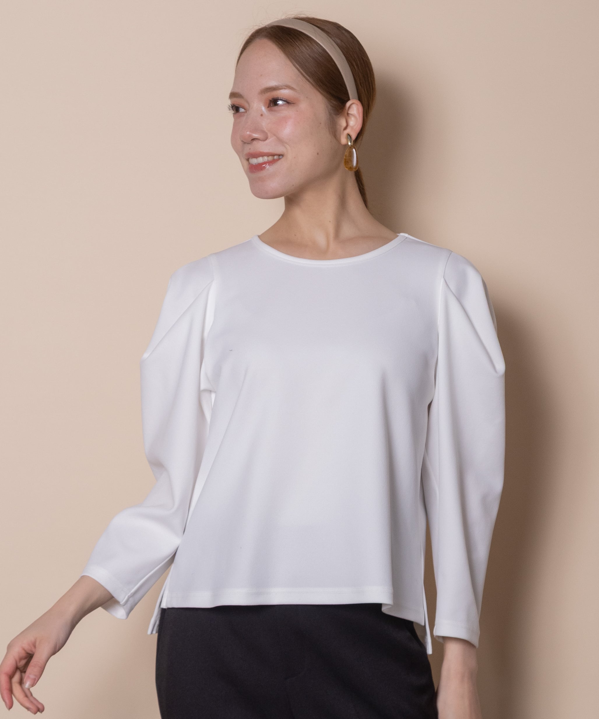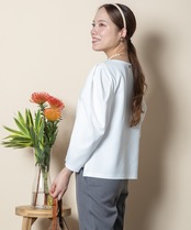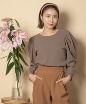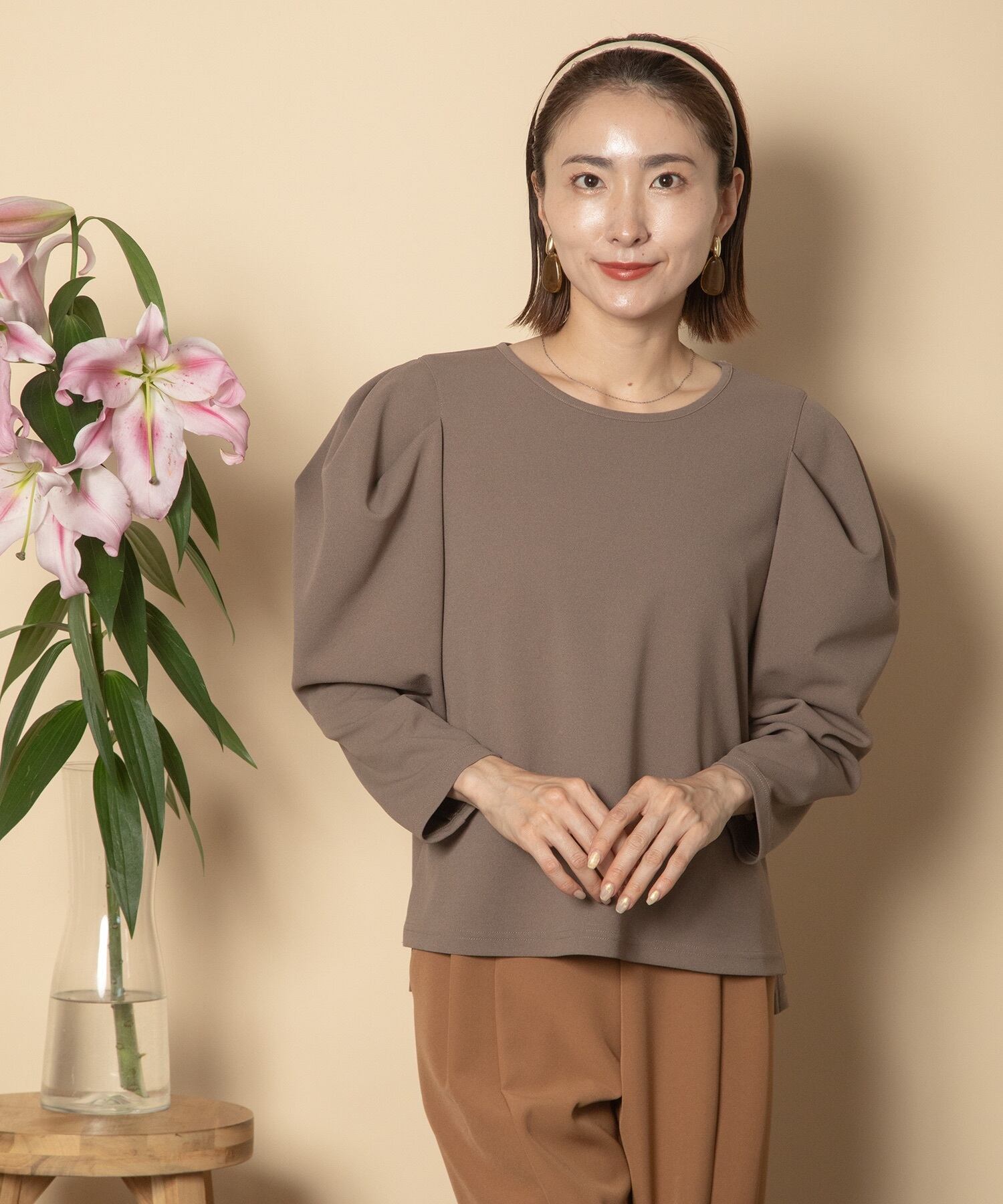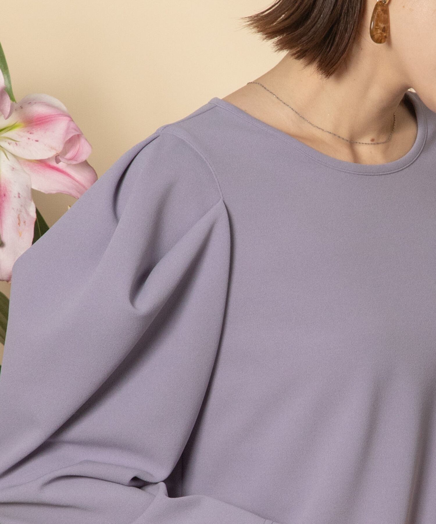 袖の立体感が魅力のパワーショルダートップス。シンプルな中にも華やかさのある人気デザイン。着心地の良いジャージ素材でモードな雰囲気のあるアイテムです。タックインでもアウトでも決まるサイドスリット入り。バックセンターにモチーフ付き。