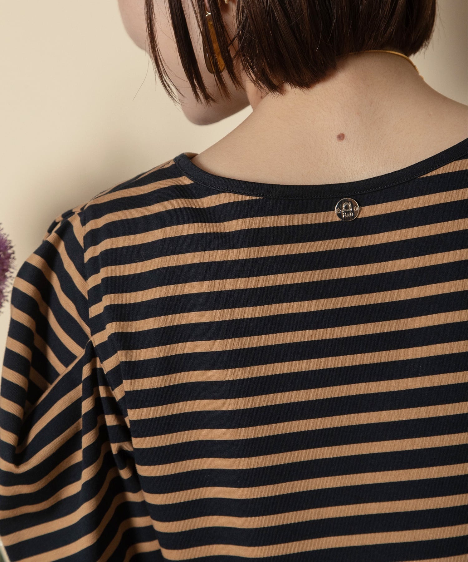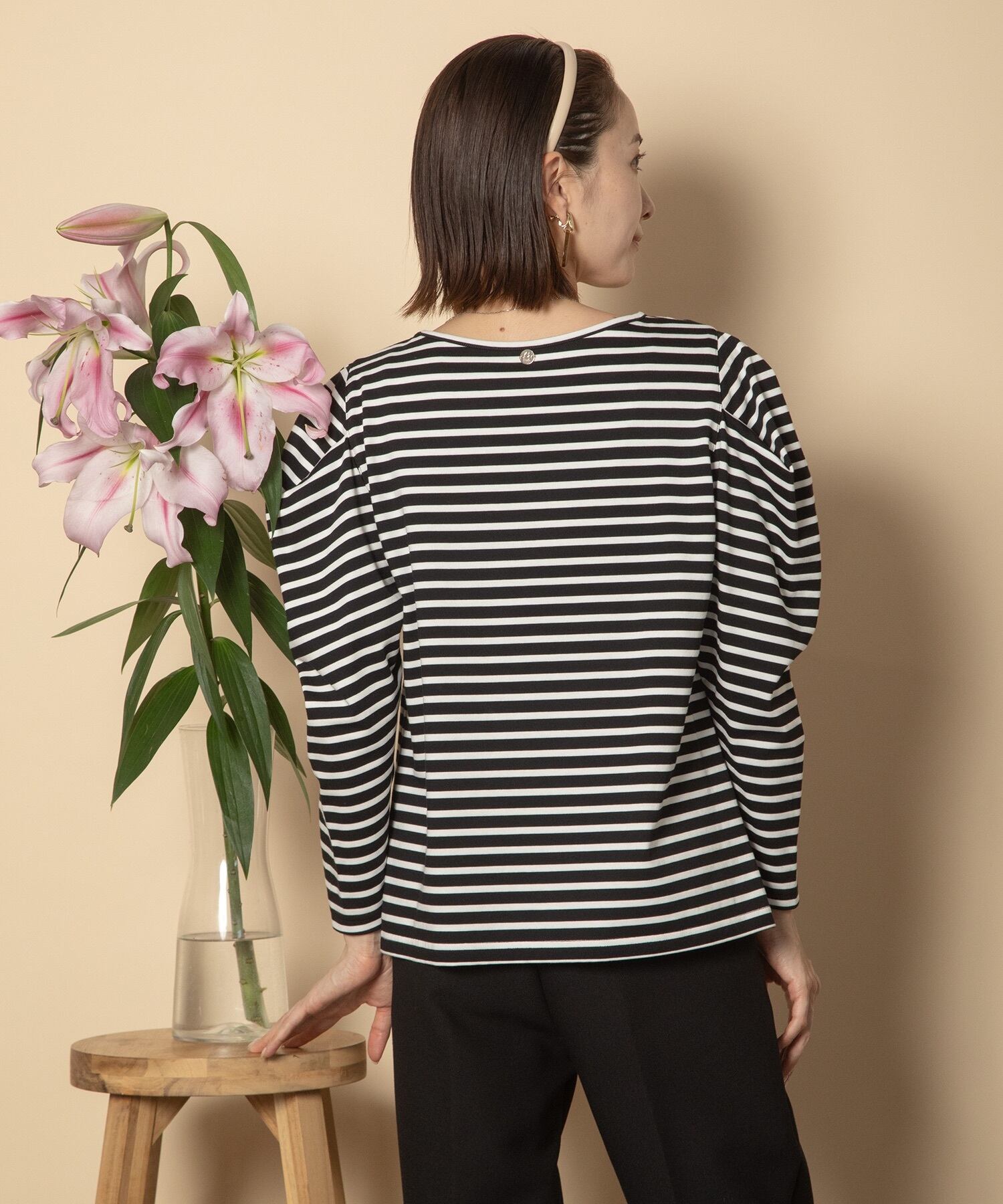 モードな印象のキレイめボーダーカットソー素材。着心地がよくシワにもなりにくく素材でお手入れが楽なところも魅力。