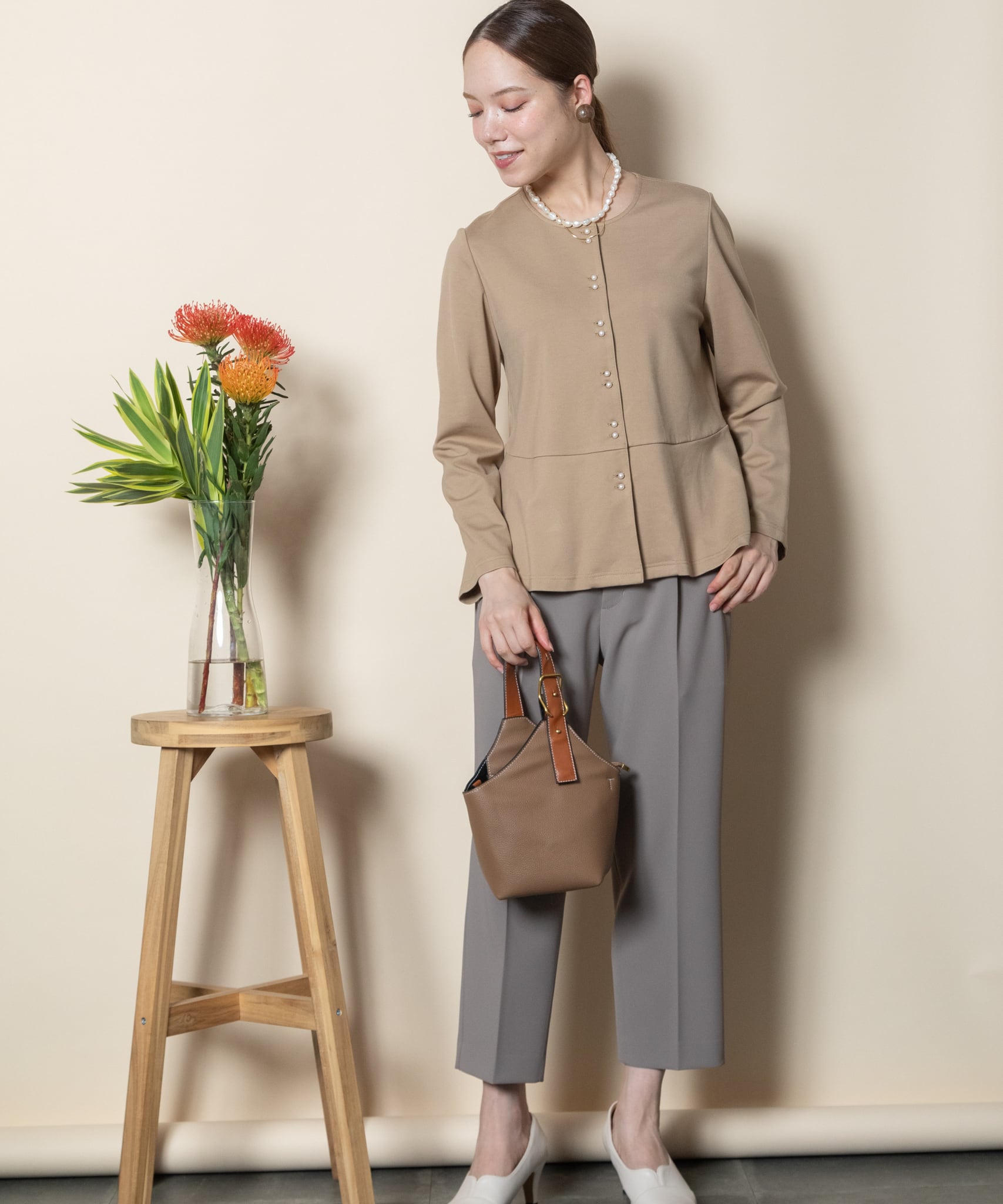 パンツスタイル・スカートスタイルと幅広いボトムとコーデ頂けます。お仕事シーンからカジュアルシーンまで幅広いシーンでご着用頂けます。