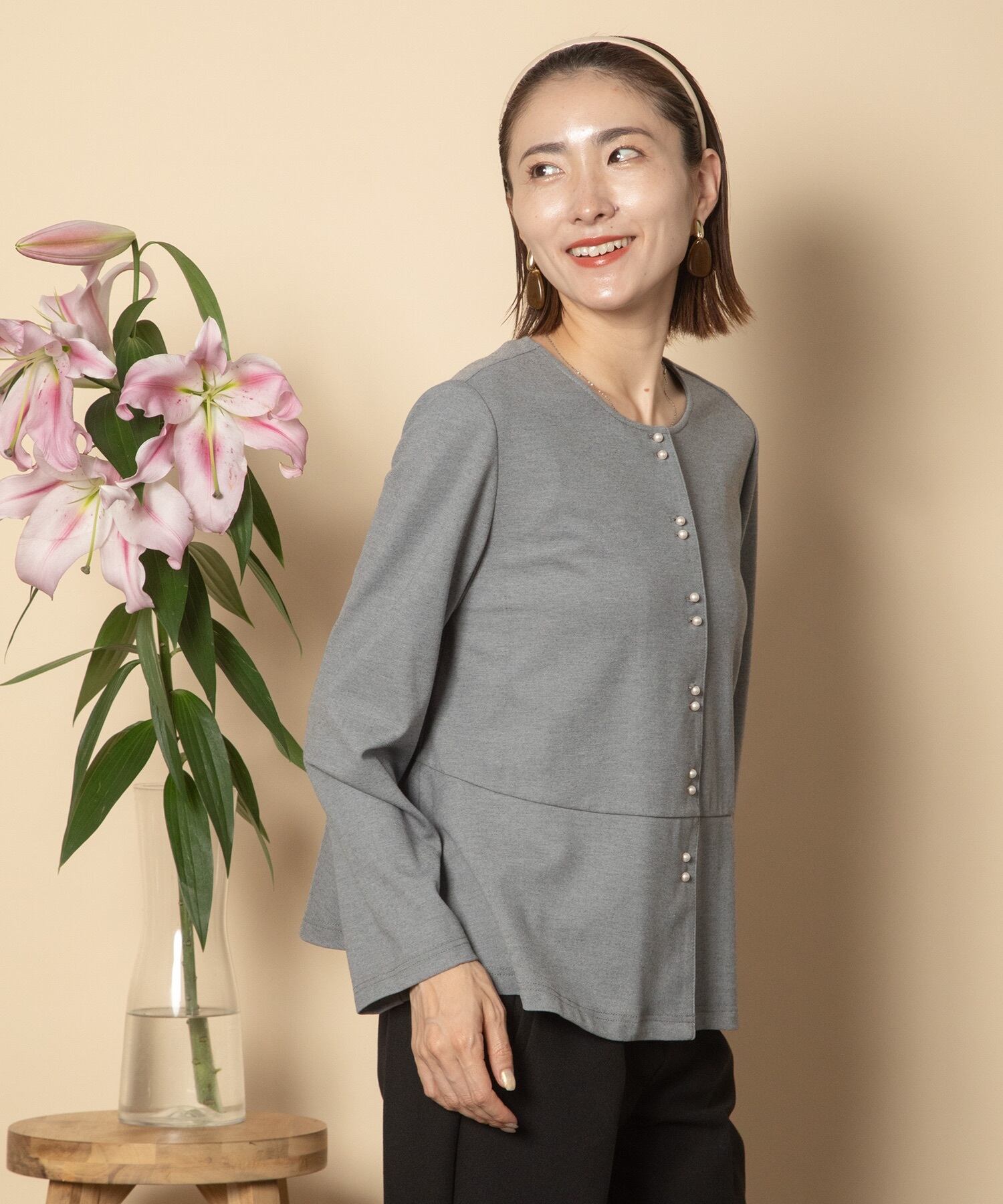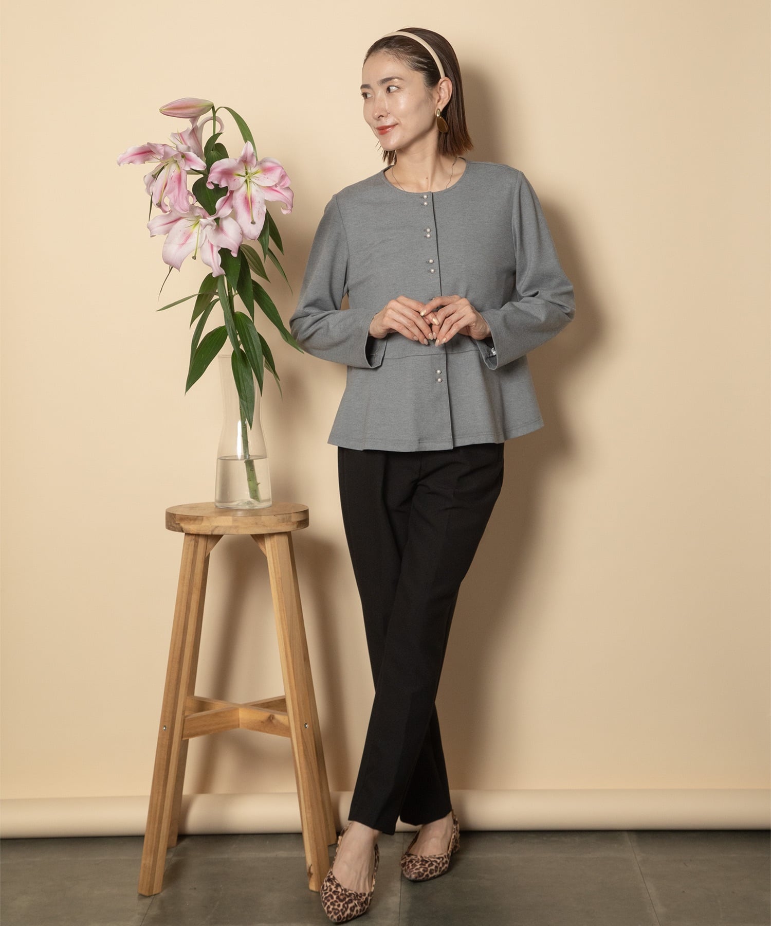 気軽に羽織れてカーデ感覚で着れるライトなノーカラージャケット。パールボタンにペプラムシルエットとフェミニンな雰囲気のアイテム。気軽に羽織って頂ける重宝するアイテム。