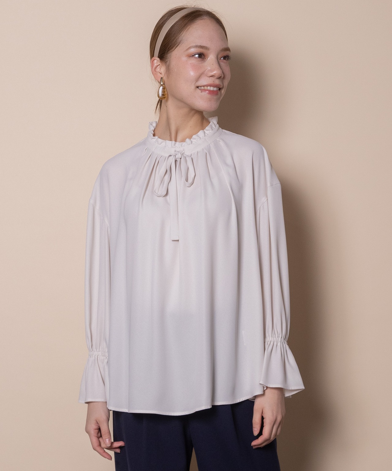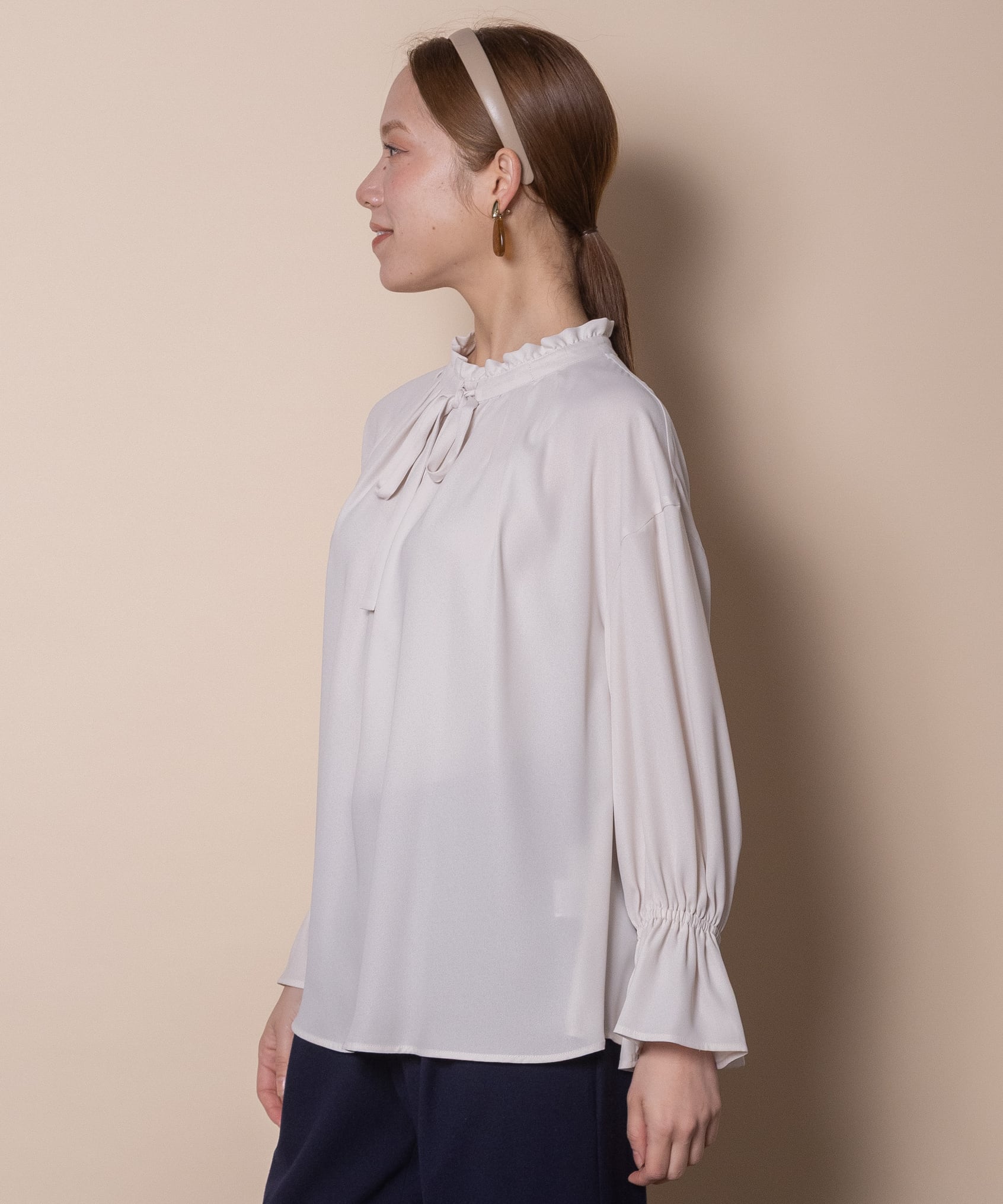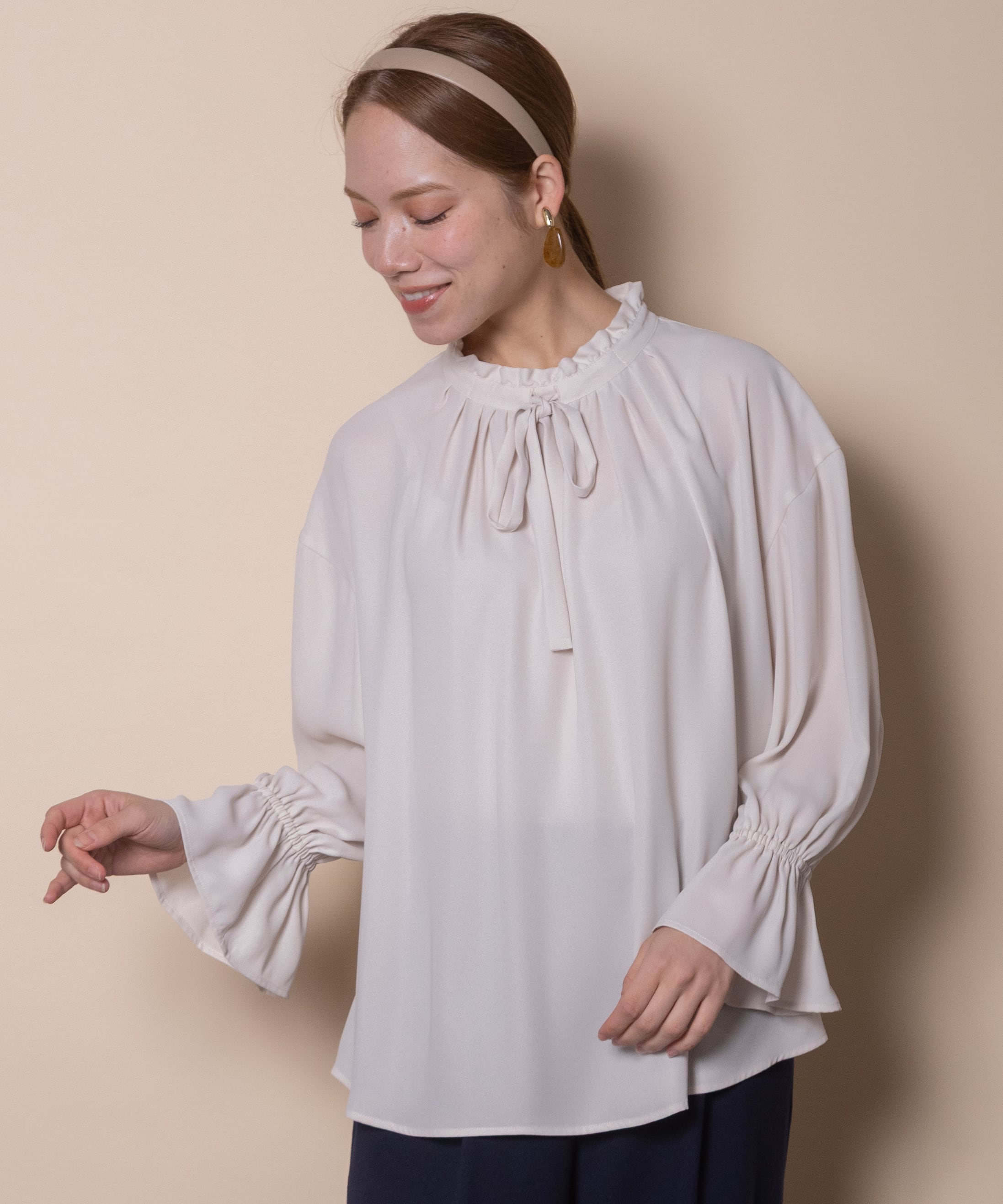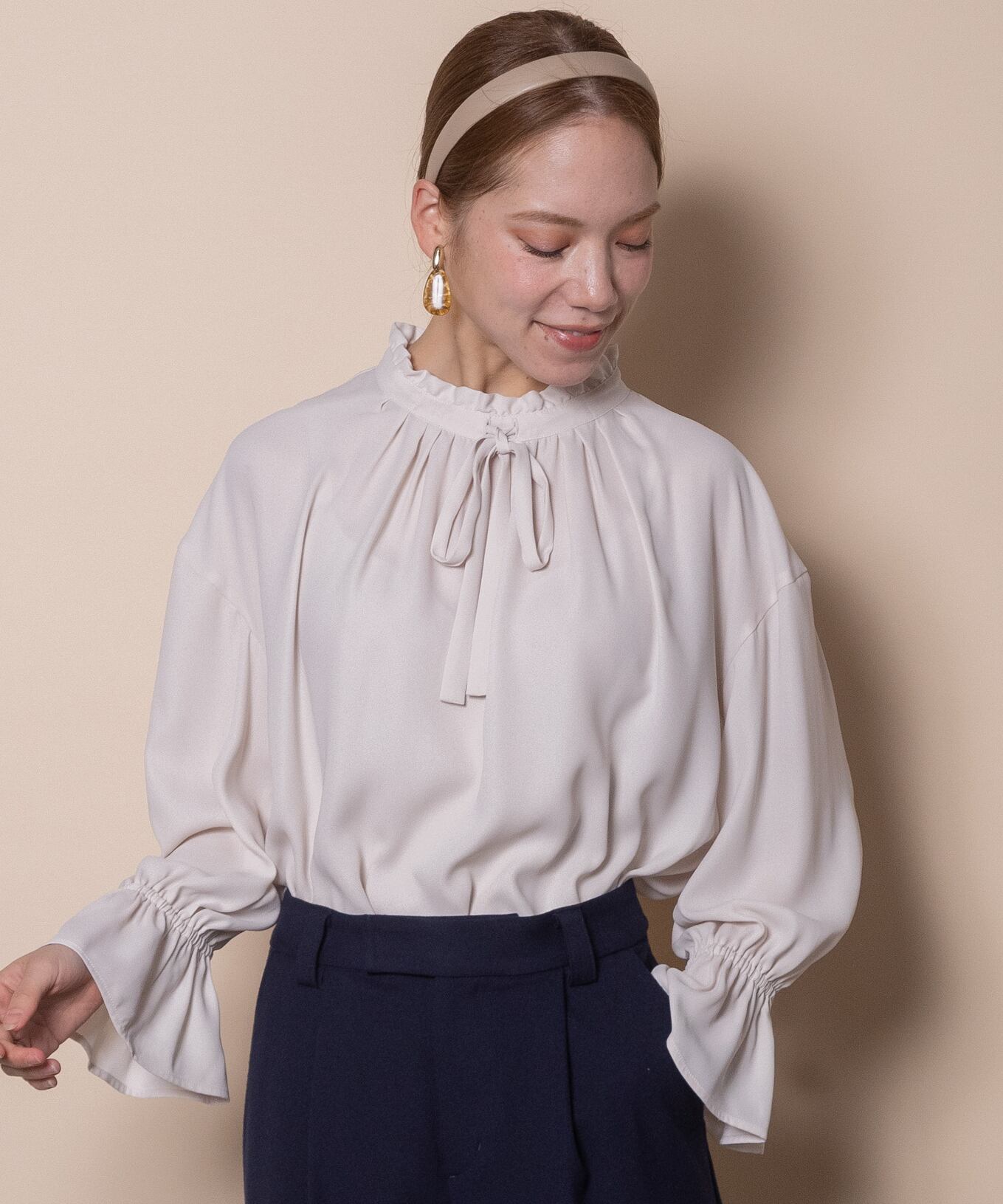 フェミニン派におすすめのフリルリボンブラウス。スタンドフリル襟にリボンタイ、袖口と身頃にたっぷり寄せたギャザーが特徴的なデザイン。袖口はゴムギャザー仕様。落ち着いた雰囲気でお仕事シーンやお出かけシーンにおすすめのコンサバティブなブラウスです。ジャケットのインにもおすすめ。