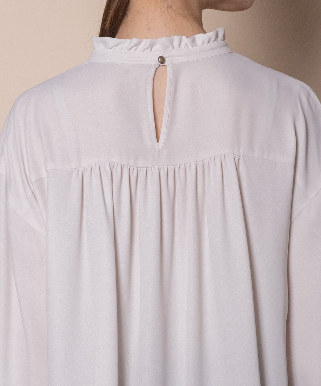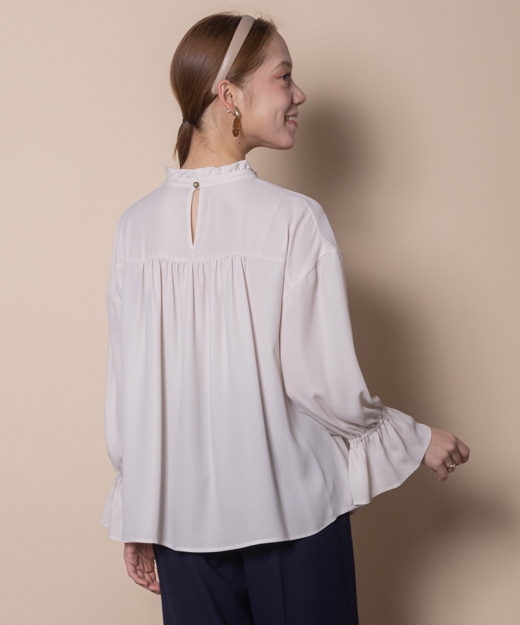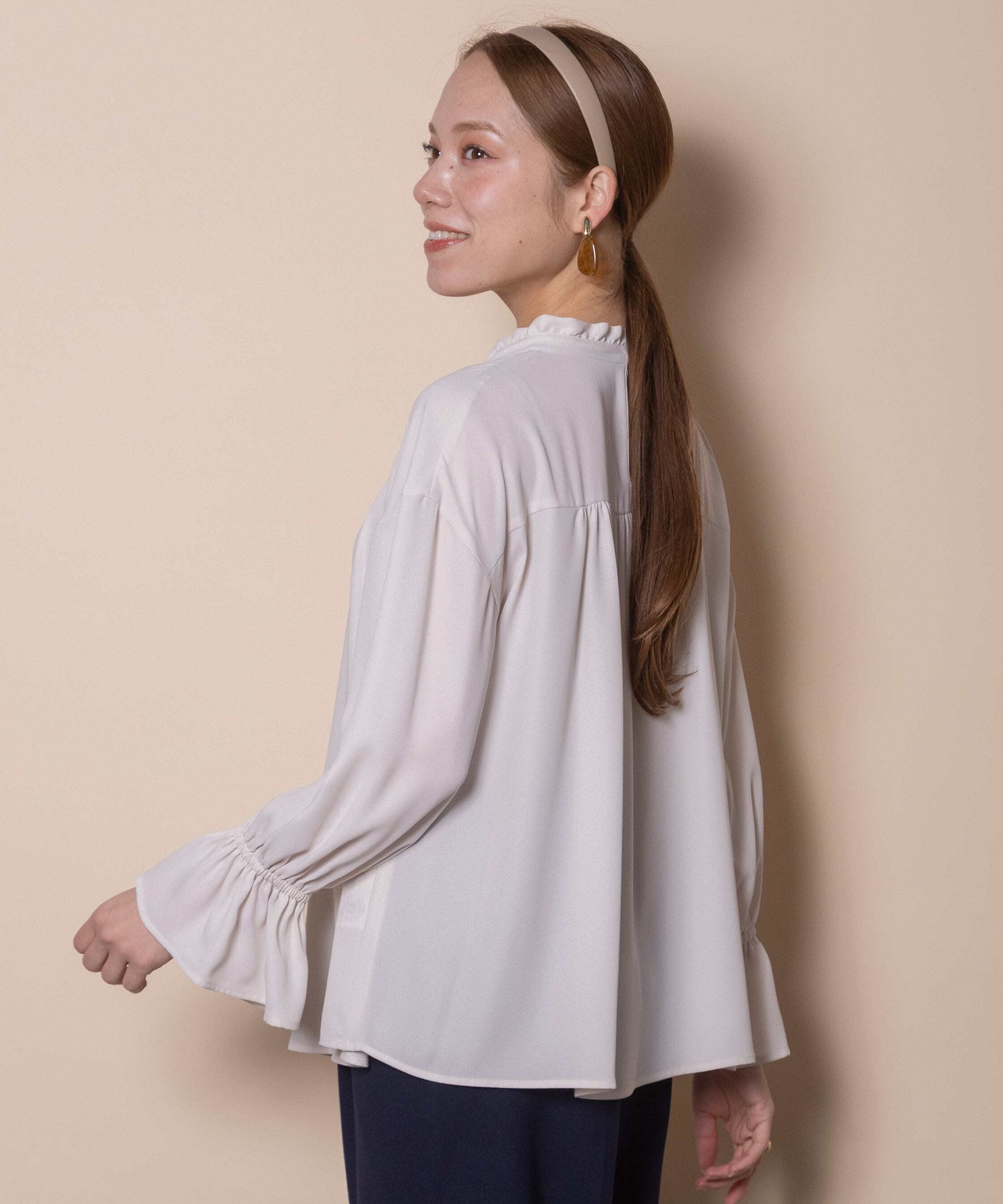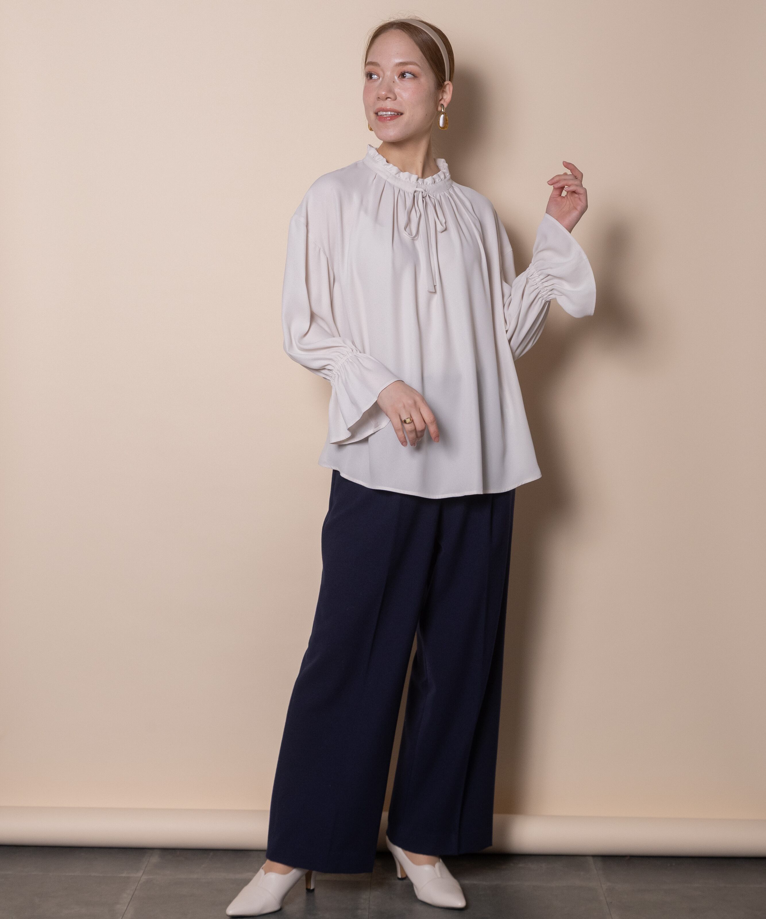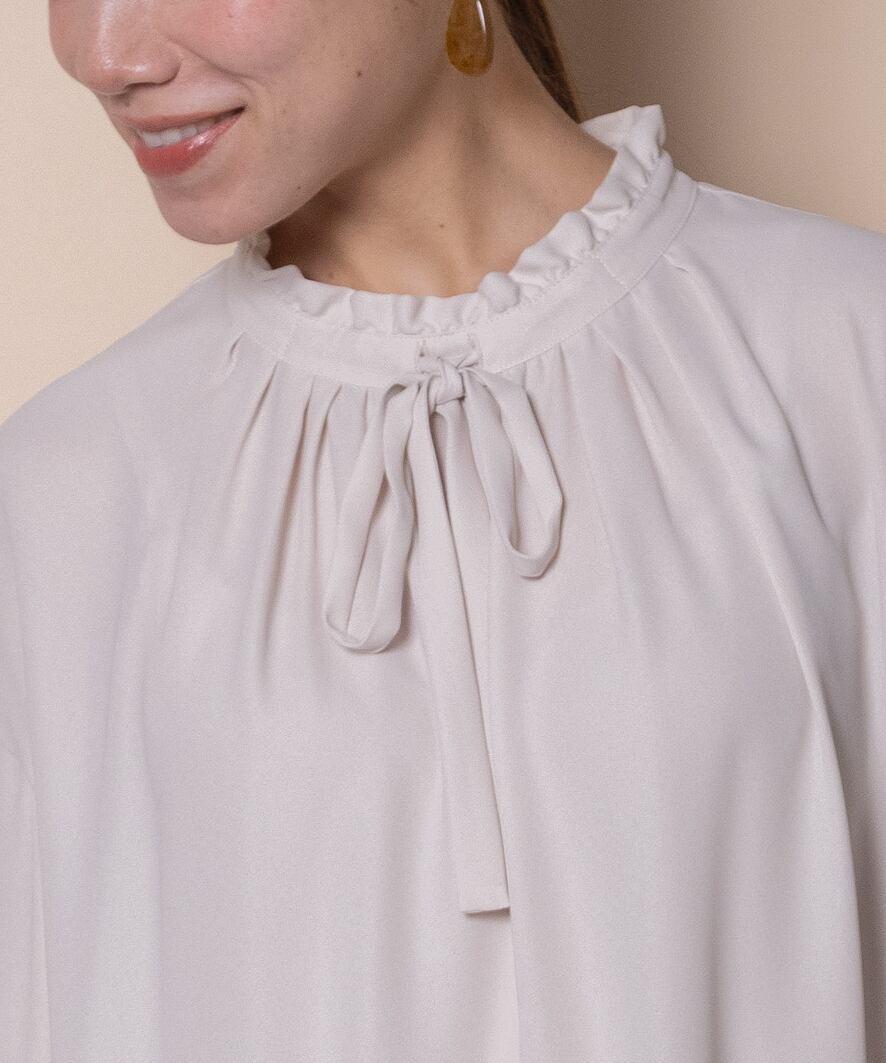 フェミニン派におすすめのフリルリボンブラウス。スタンドフリル襟にリボンタイ、袖口と身頃にたっぷり寄せたギャザーが特徴的なデザイン。袖口はゴムギャザー仕様。落ち着いた雰囲気でお仕事シーンやお出かけシーンにおすすめのコンサバティブなブラウスです。ジャケットのインにもおすすめ。
