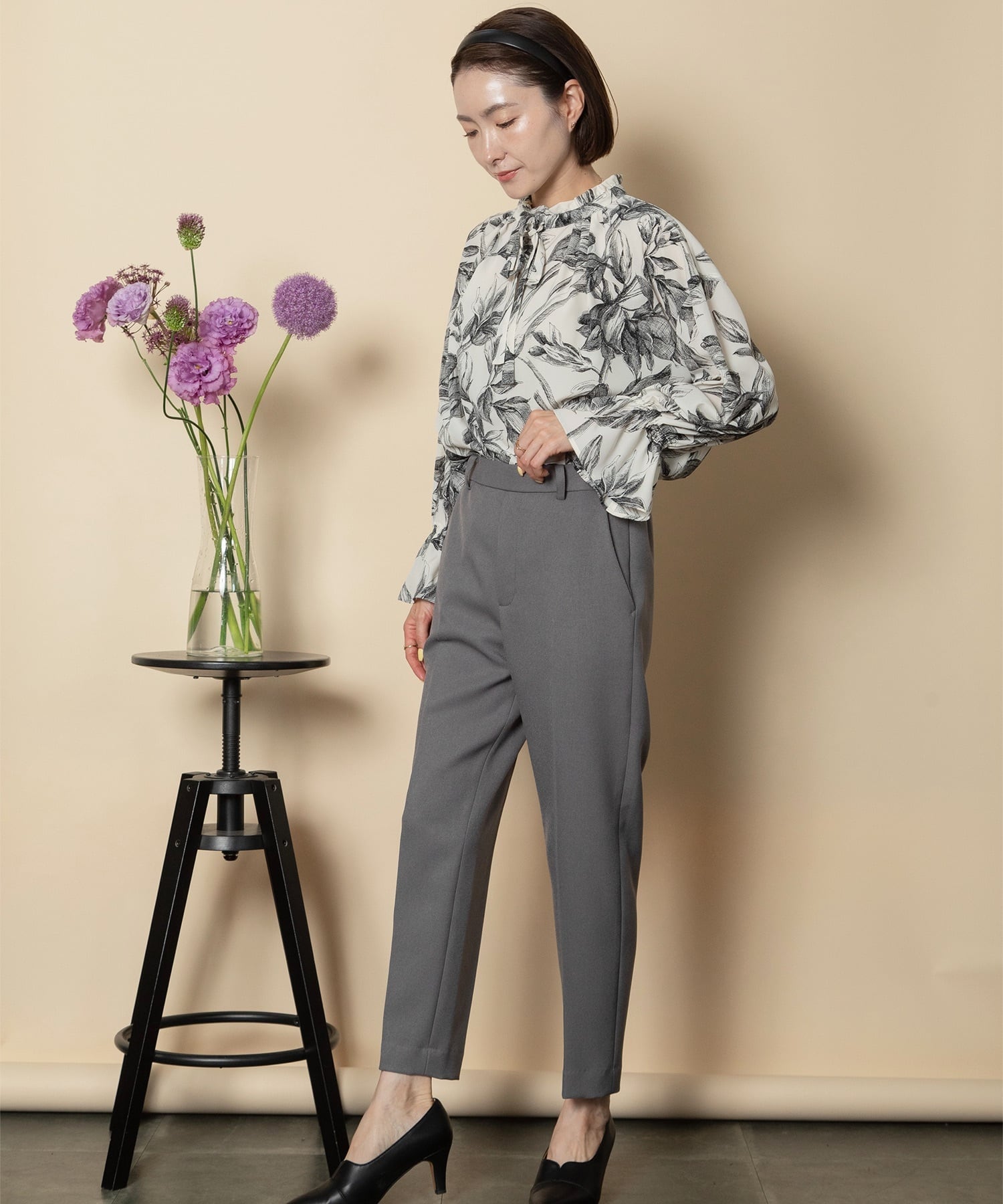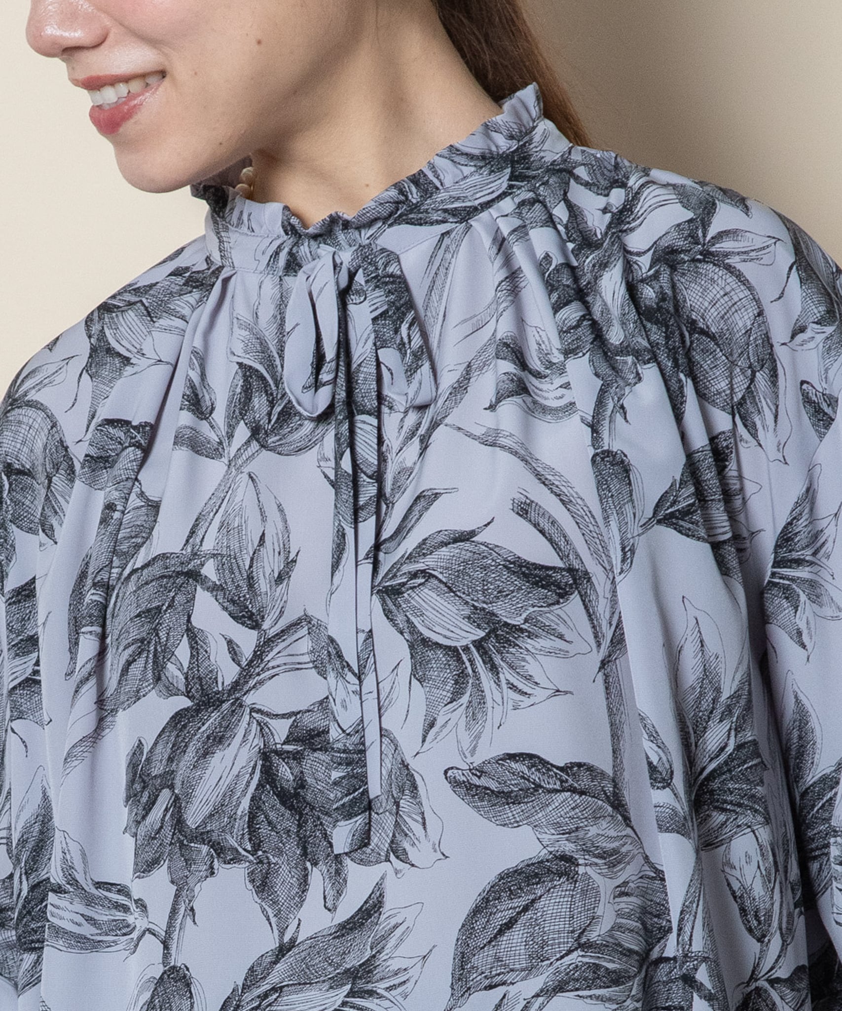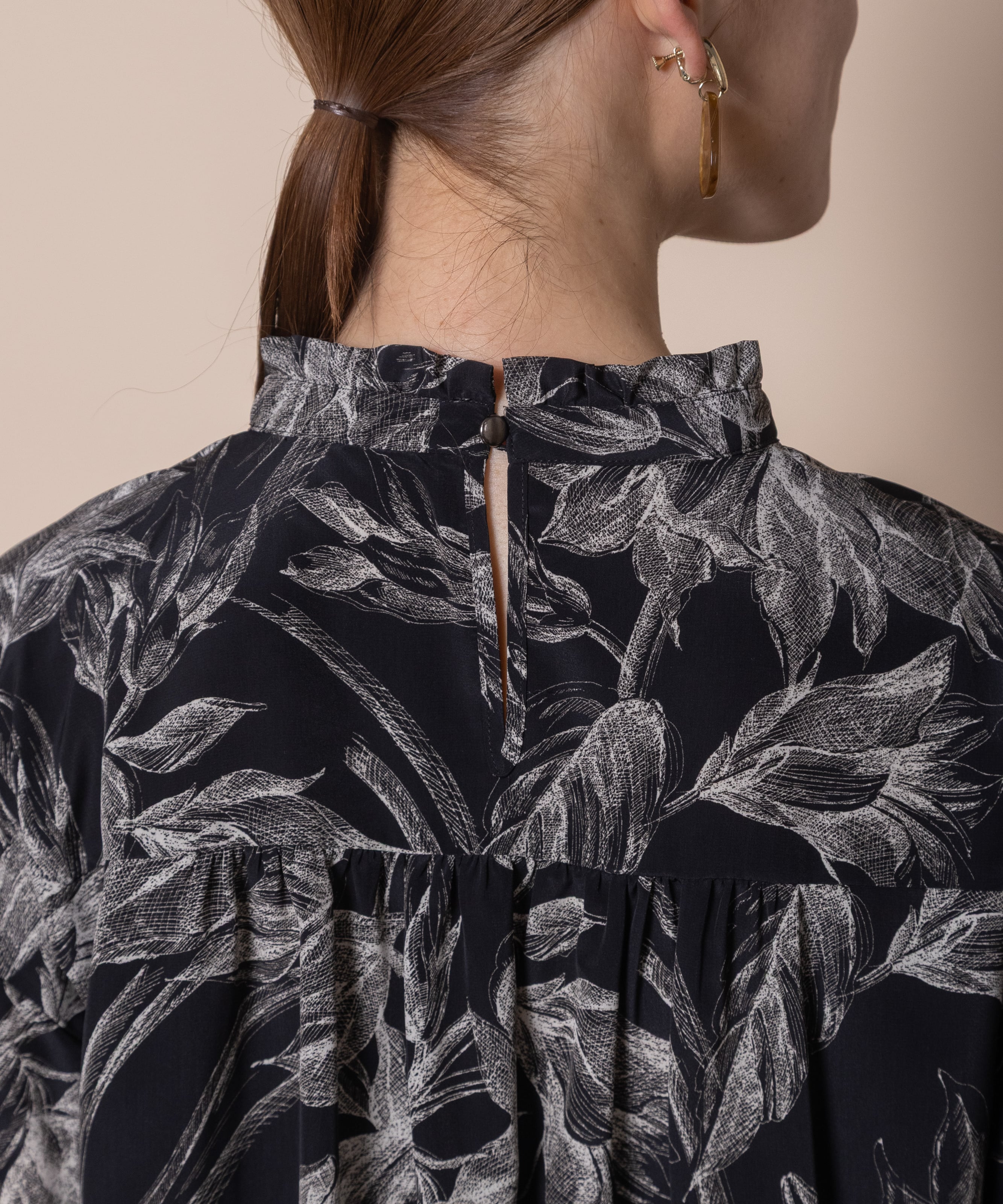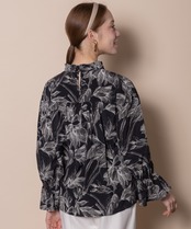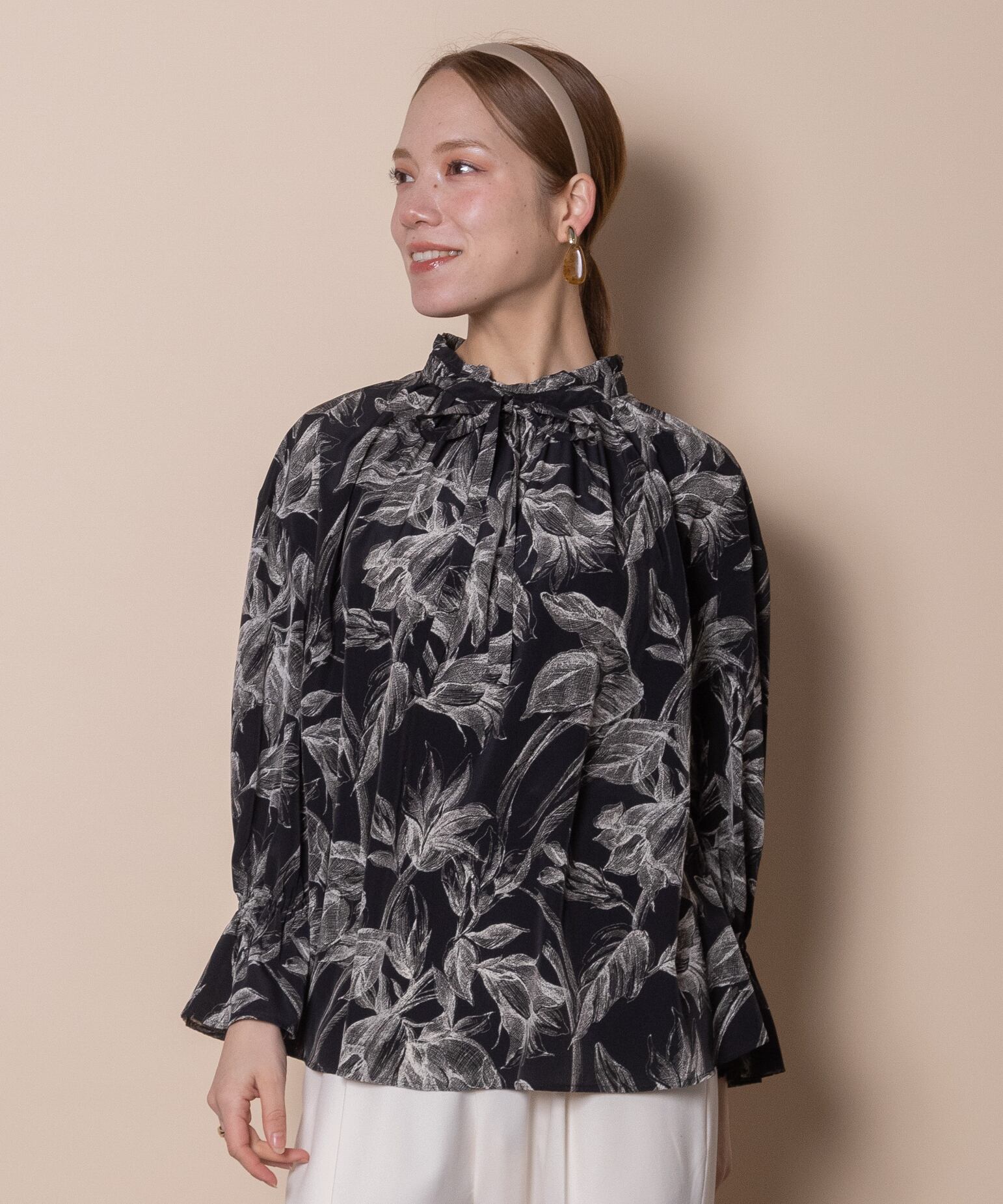 絵画風のボタニカル柄が雰囲気のあるリボンブラウス。スタンドフリル襟にリボンタイ、袖口と身頃にたっぷり寄せたギャザーが特徴的なデザイン。袖口はゴムギャザー仕様。落ち着いた雰囲気でお仕事シーンやお出かけシーンにおすすめのコンサバティブなブラウスです。