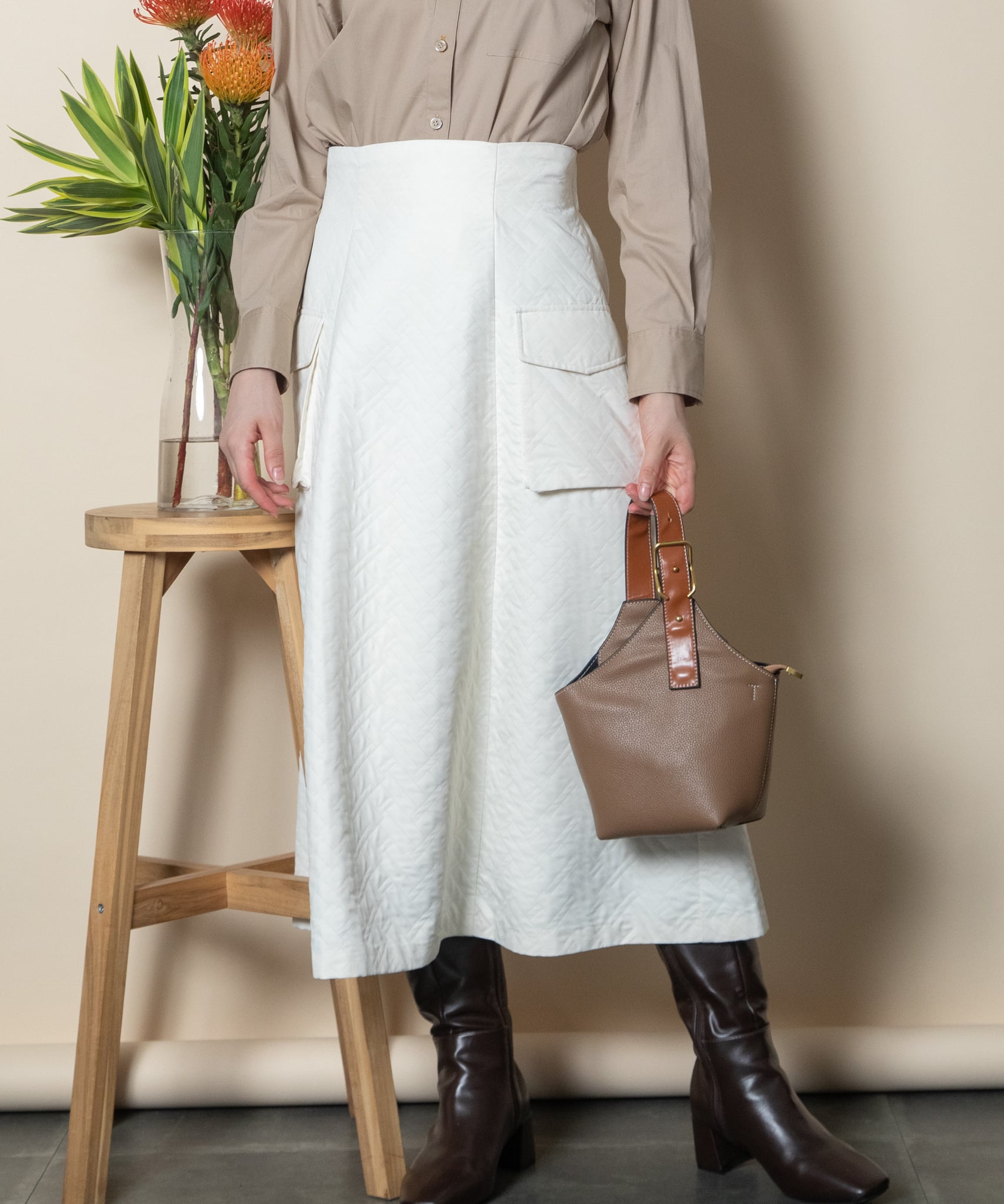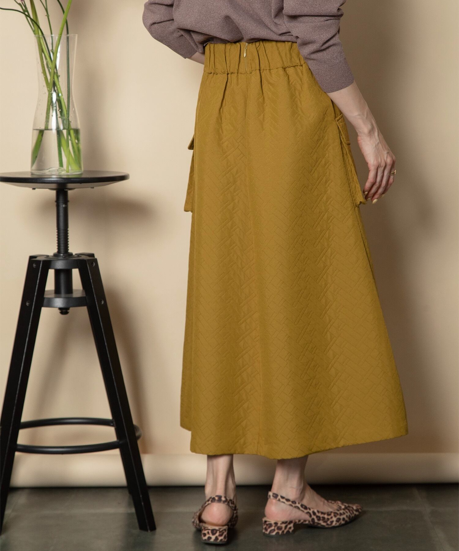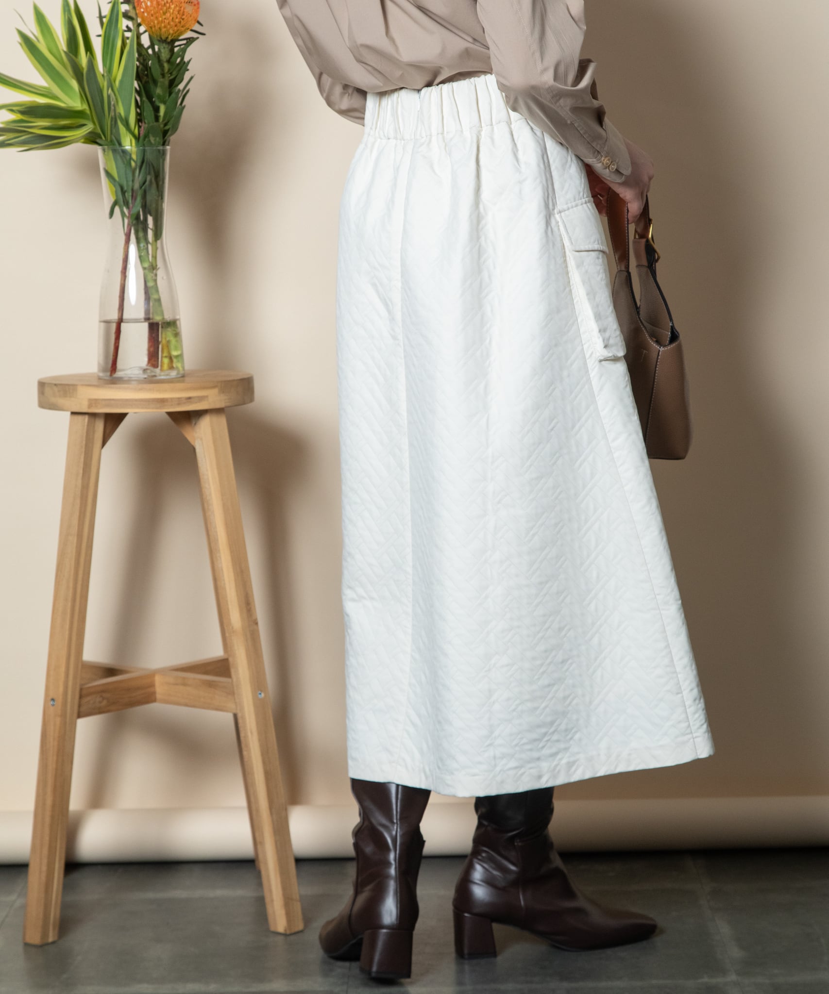 中綿キルトに見えるジャガードキルト素材。両サイドにマチ付きフラップポケットデザインのミリタリー風スカート。