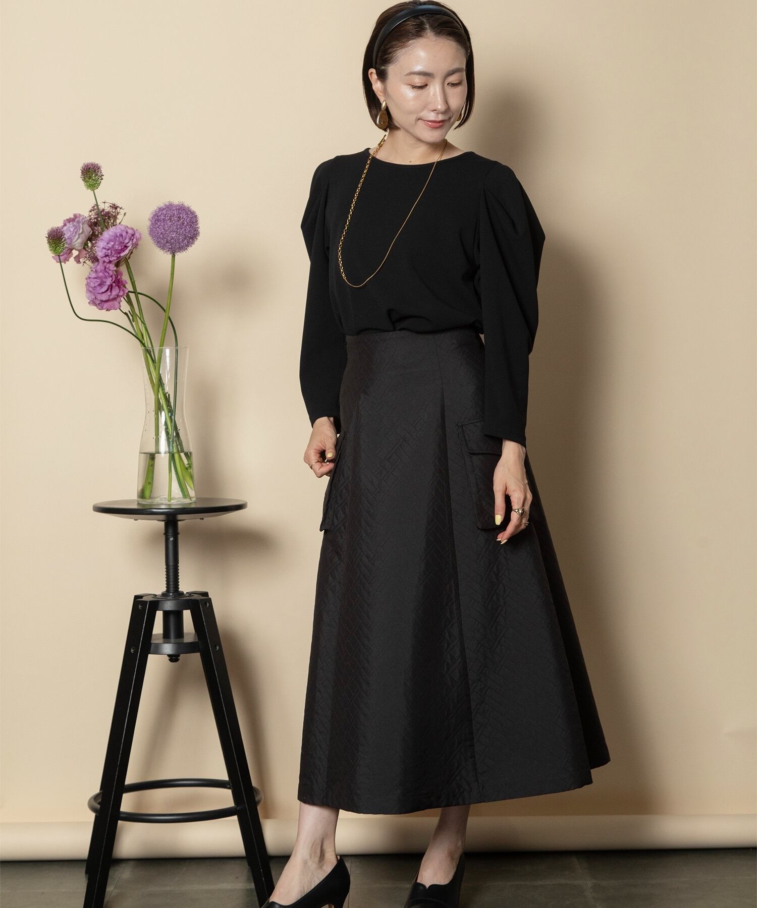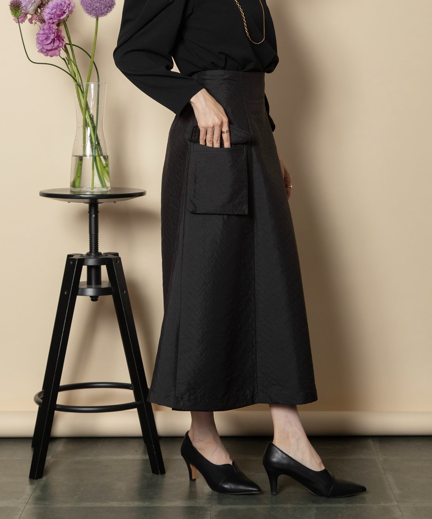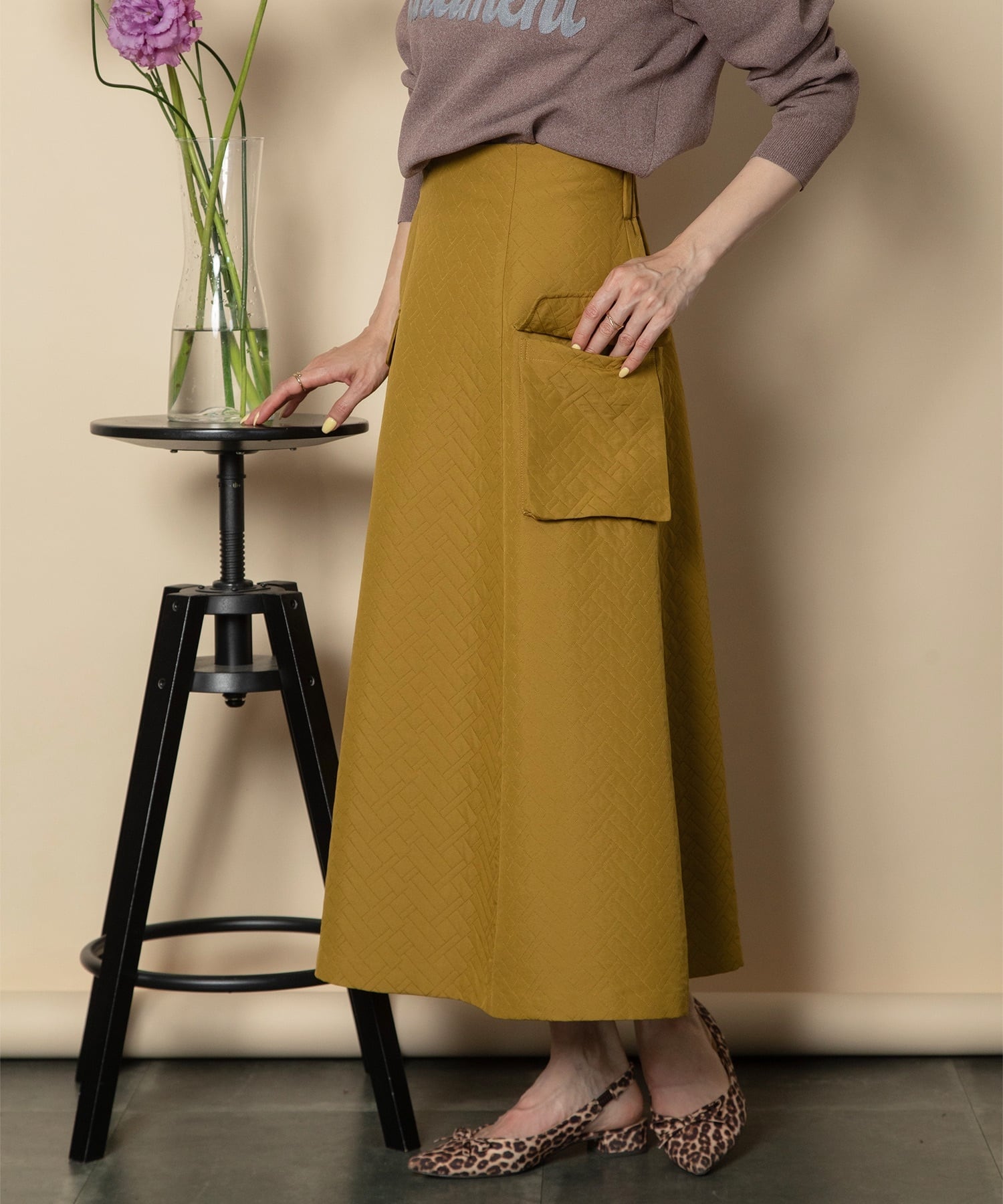 中綿キルトに見えるジャガードキルト素材。両サイドにマチ付きフラップポケットデザインのミリタリー風スカート。