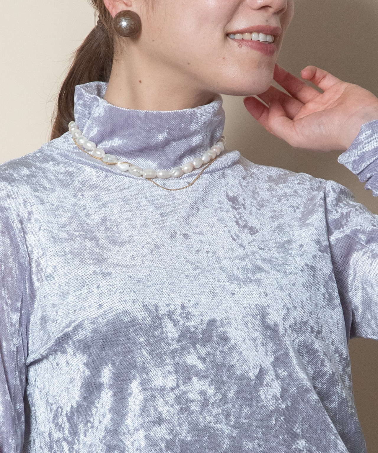 インナーの大本命。光沢感と着やすさで人気のクラッシュベロアタートル。長めの袖でクシュ袖がポイント。窮屈さのない程よいフィット感の万能インナー。1枚でもレイヤードでも大活躍間違いなし。