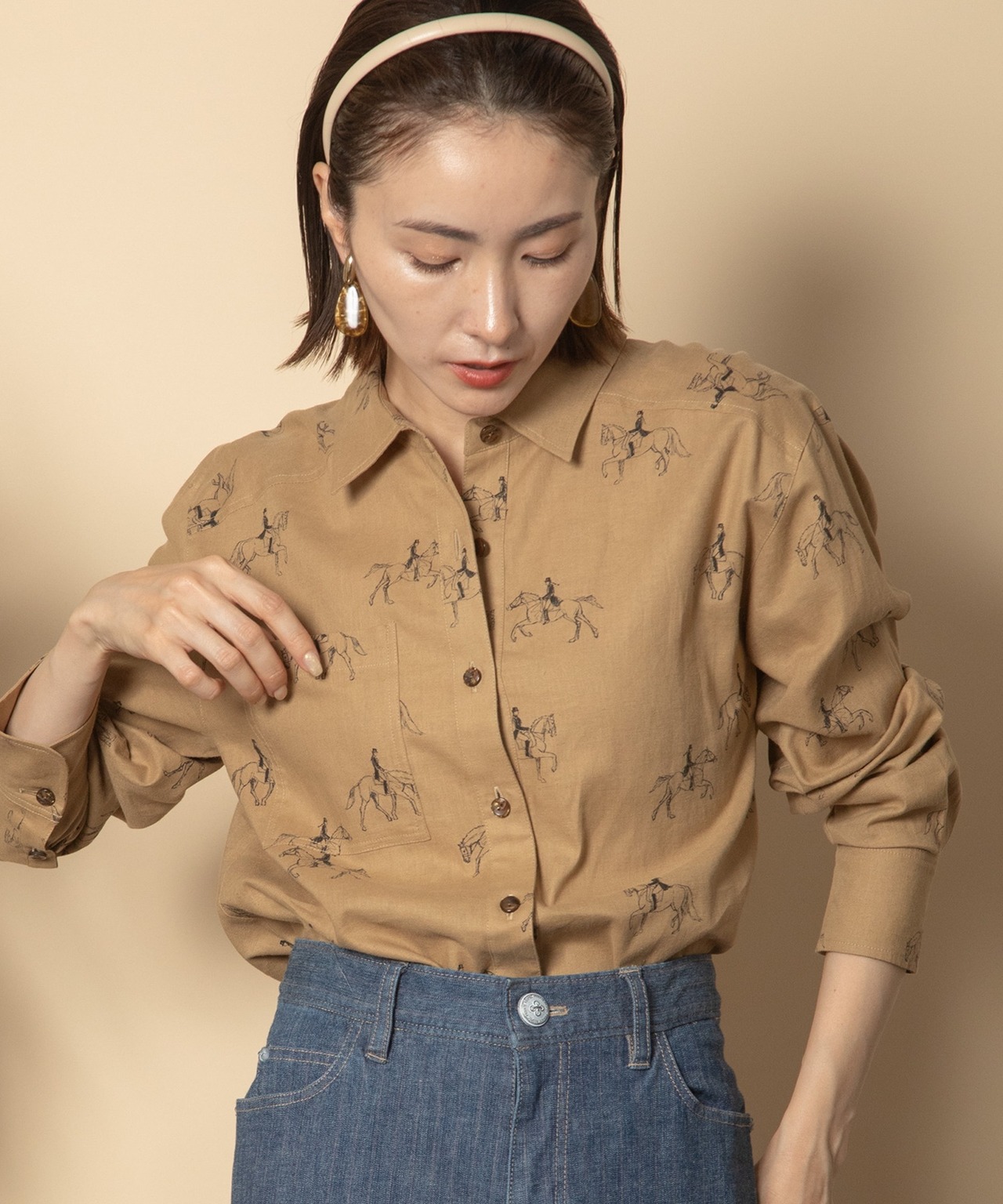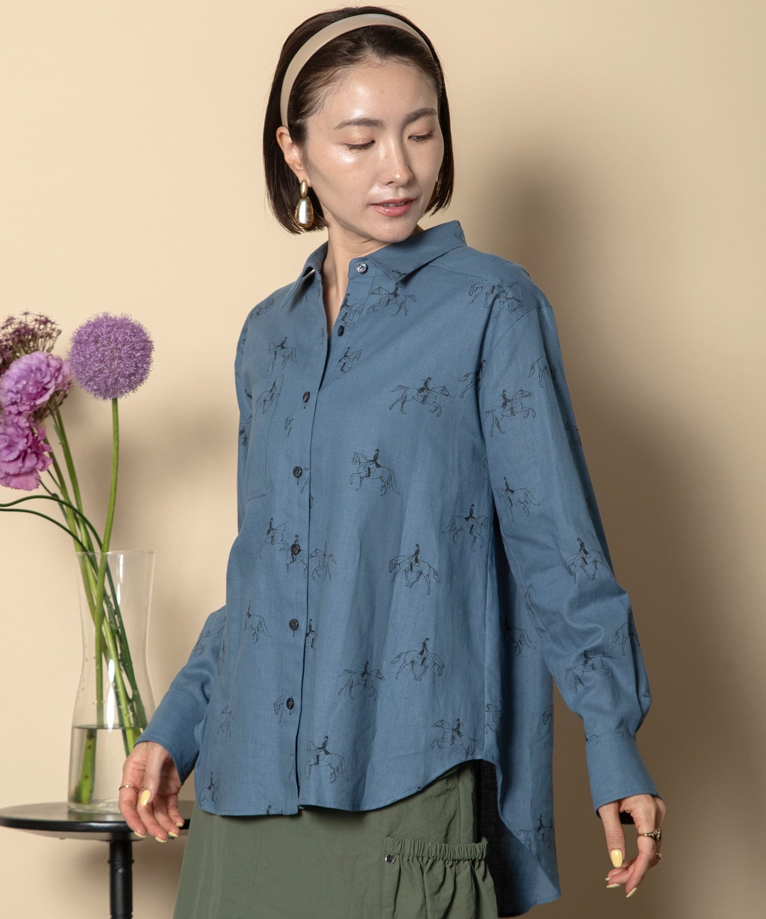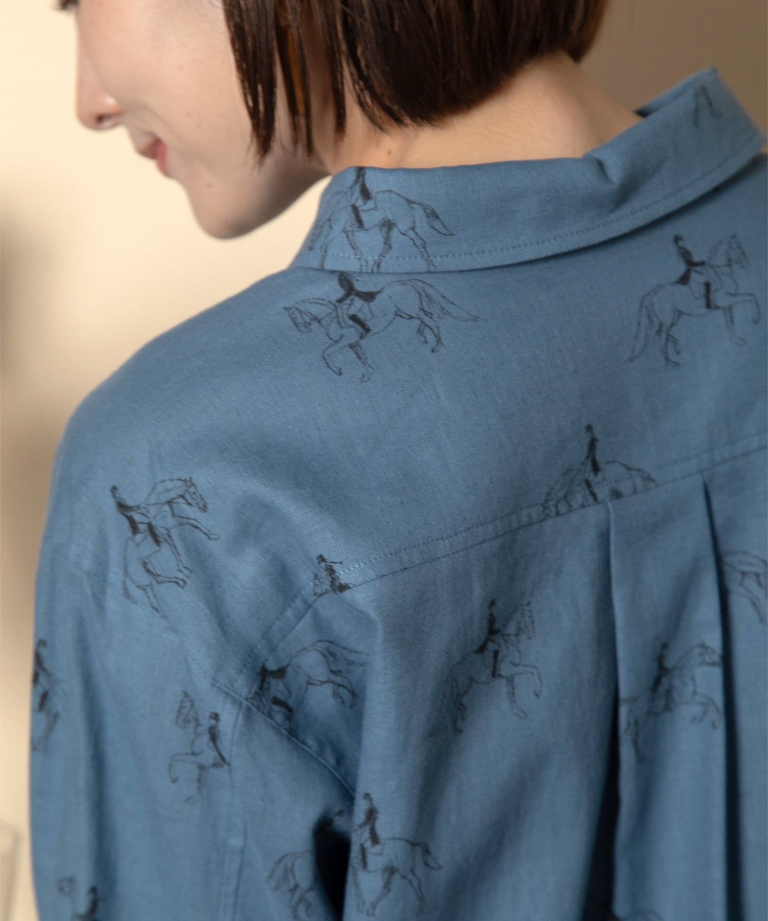 毎シーズン人気のオリジナルリネンシリーズ。今シーズンは繊細なタッチで描かれている馬術競技中の馬柄プリントを施したベーシックシャツ。