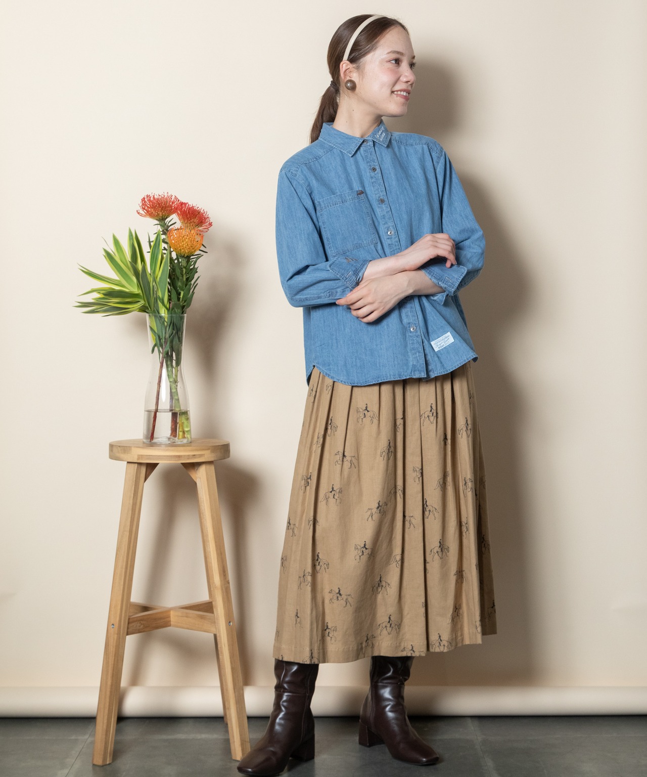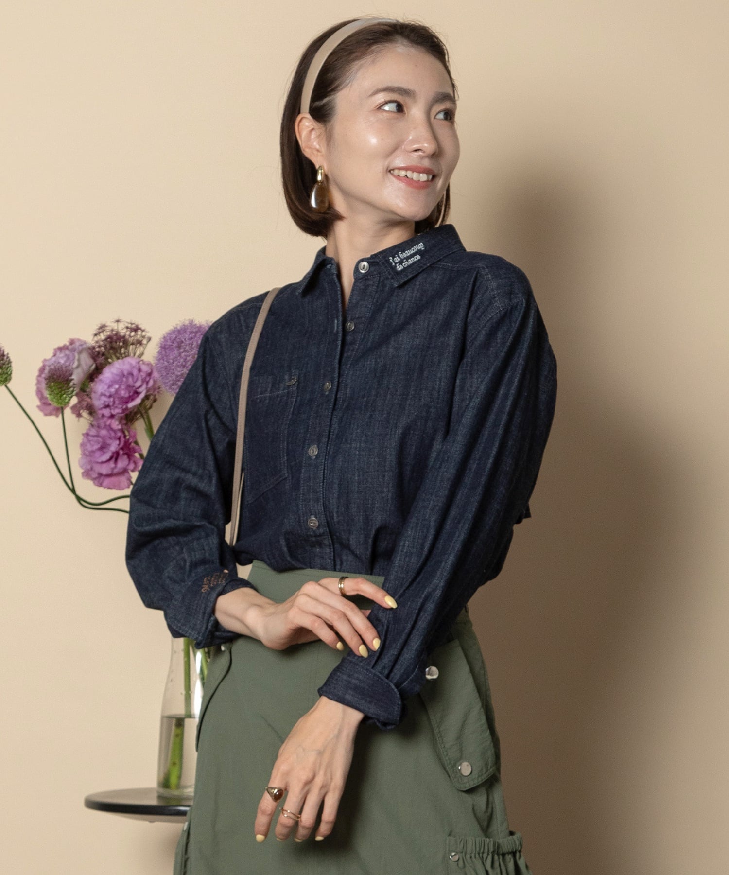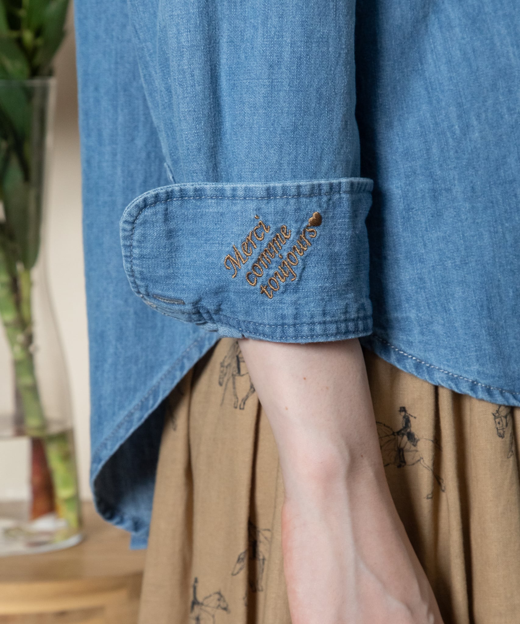 左襟元にテキスト刺繍のシャンブレーデニムシャツ