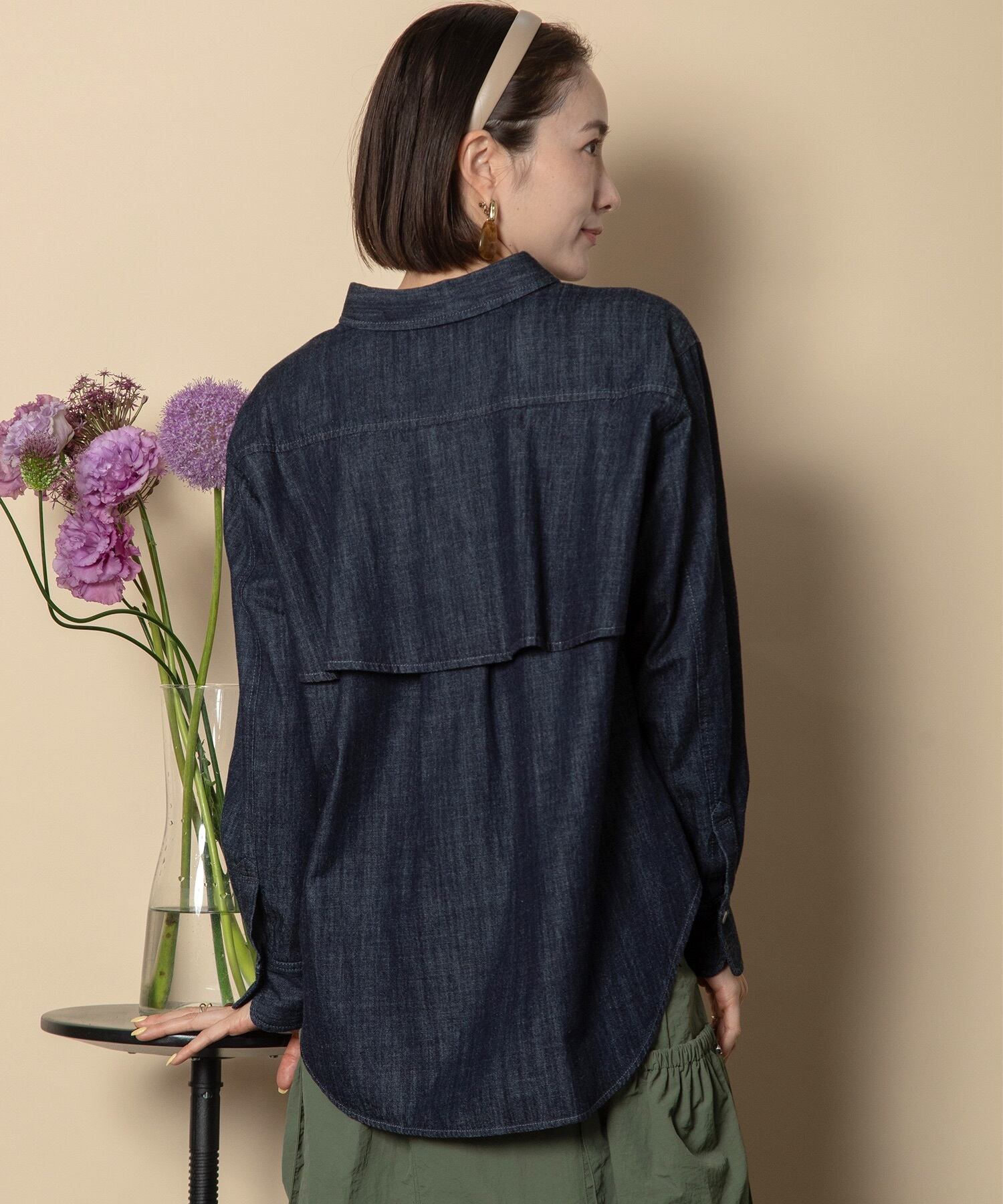 左襟元と右カフス裏にテキスト刺繍が施されたシャンブレーデニムシャツ。程よいオーバーシルエットで気軽に羽織れるアイテム。バックは大きなラッフルフリルデザイン。