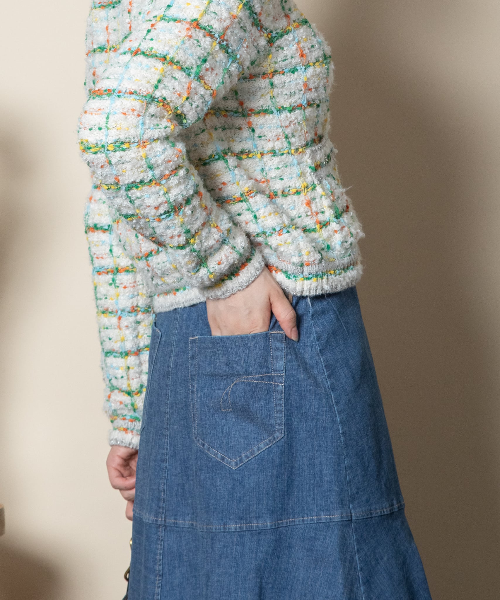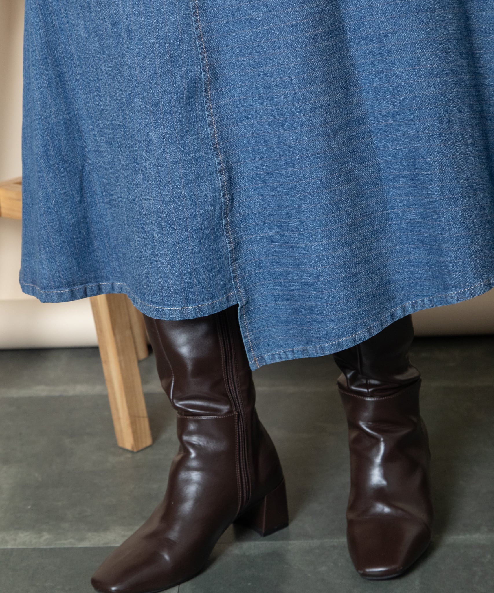 ヴィンテージな雰囲気のイレギュラーヘムのデニムスカート。クラシカルなローウエストデザイン、ヒップ下切り替えの程よいフレアシルエットがオシャレなミディ丈スカート。バックにオリジナルパッチ、さりげなく左サイドにリスペックオリジナルのハサミモチーフ付き。