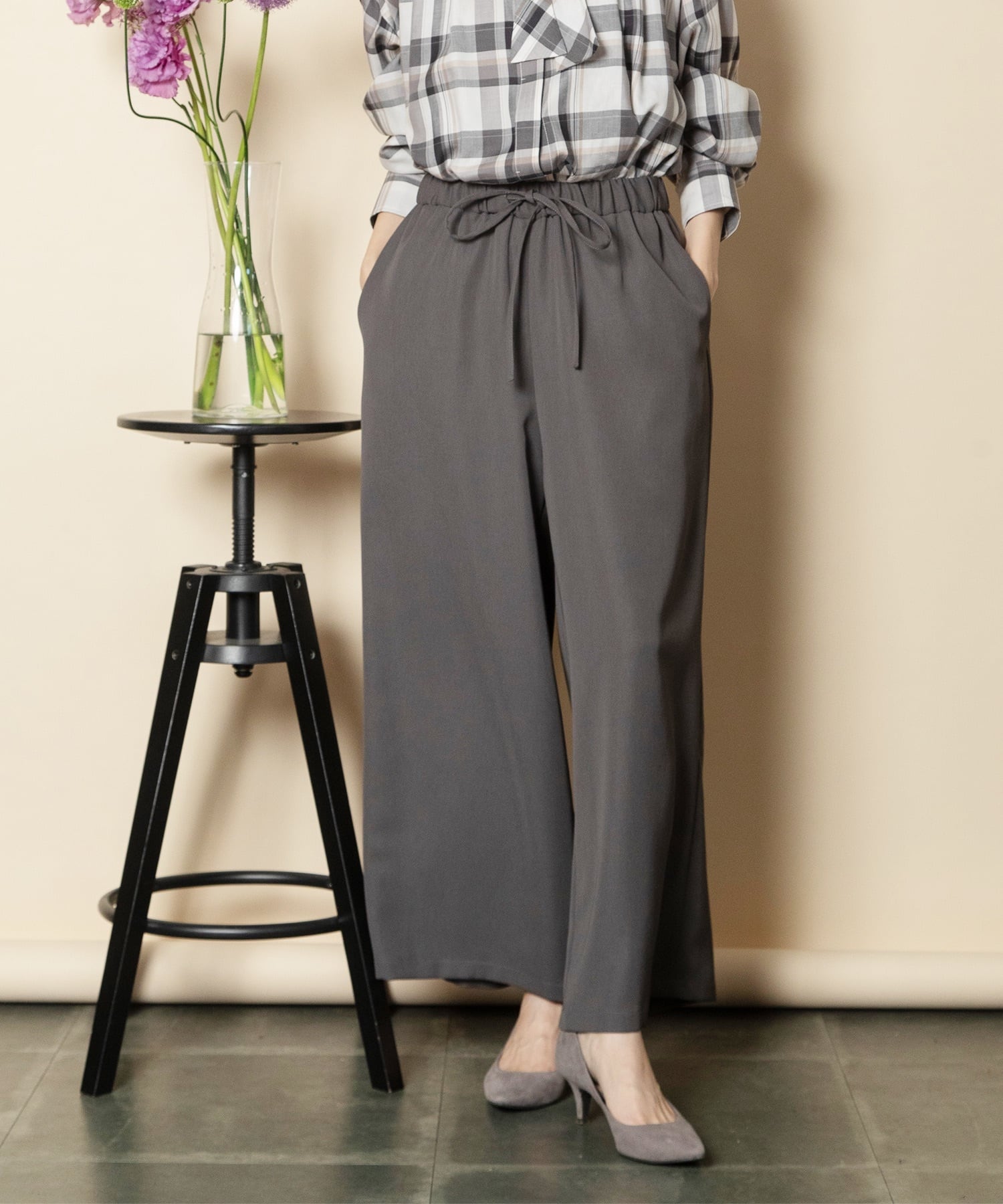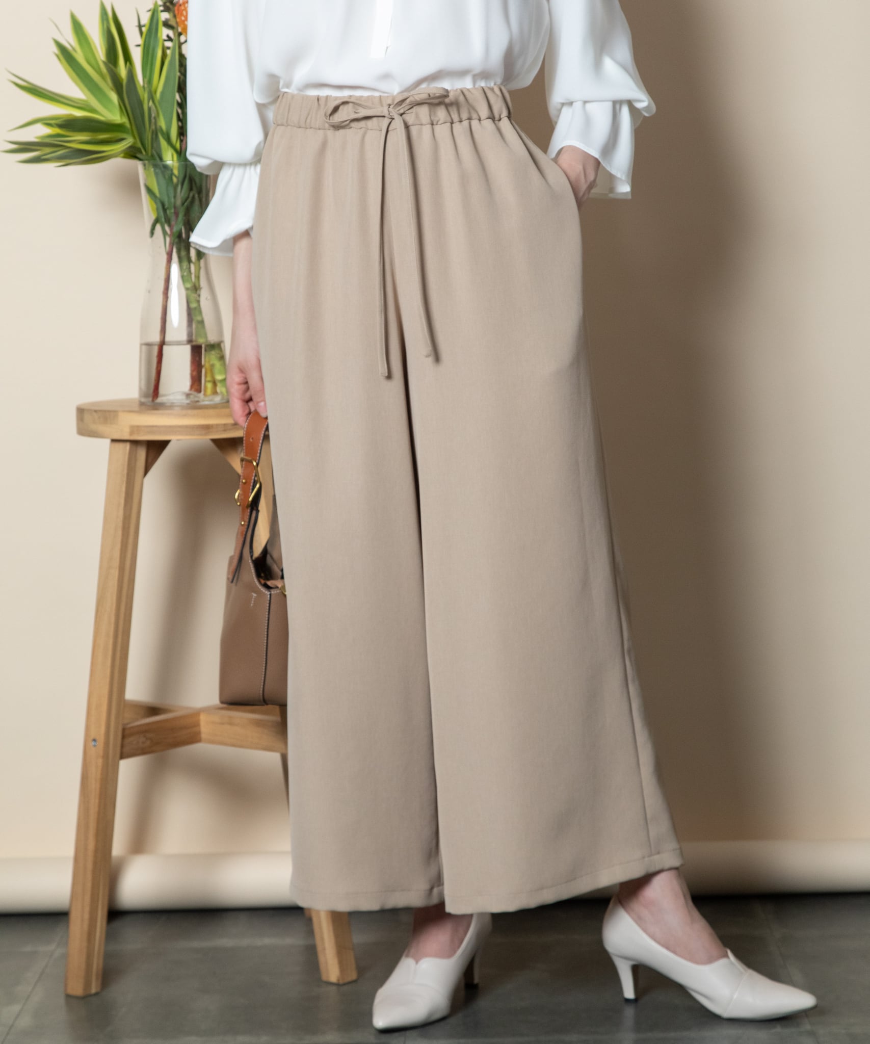 一枚あると重宝するキレイめのワイドイージーパンツ。ウエストはリボンゴム仕様、裾にかけて広がる美しいスーパーワイドフレアライン。