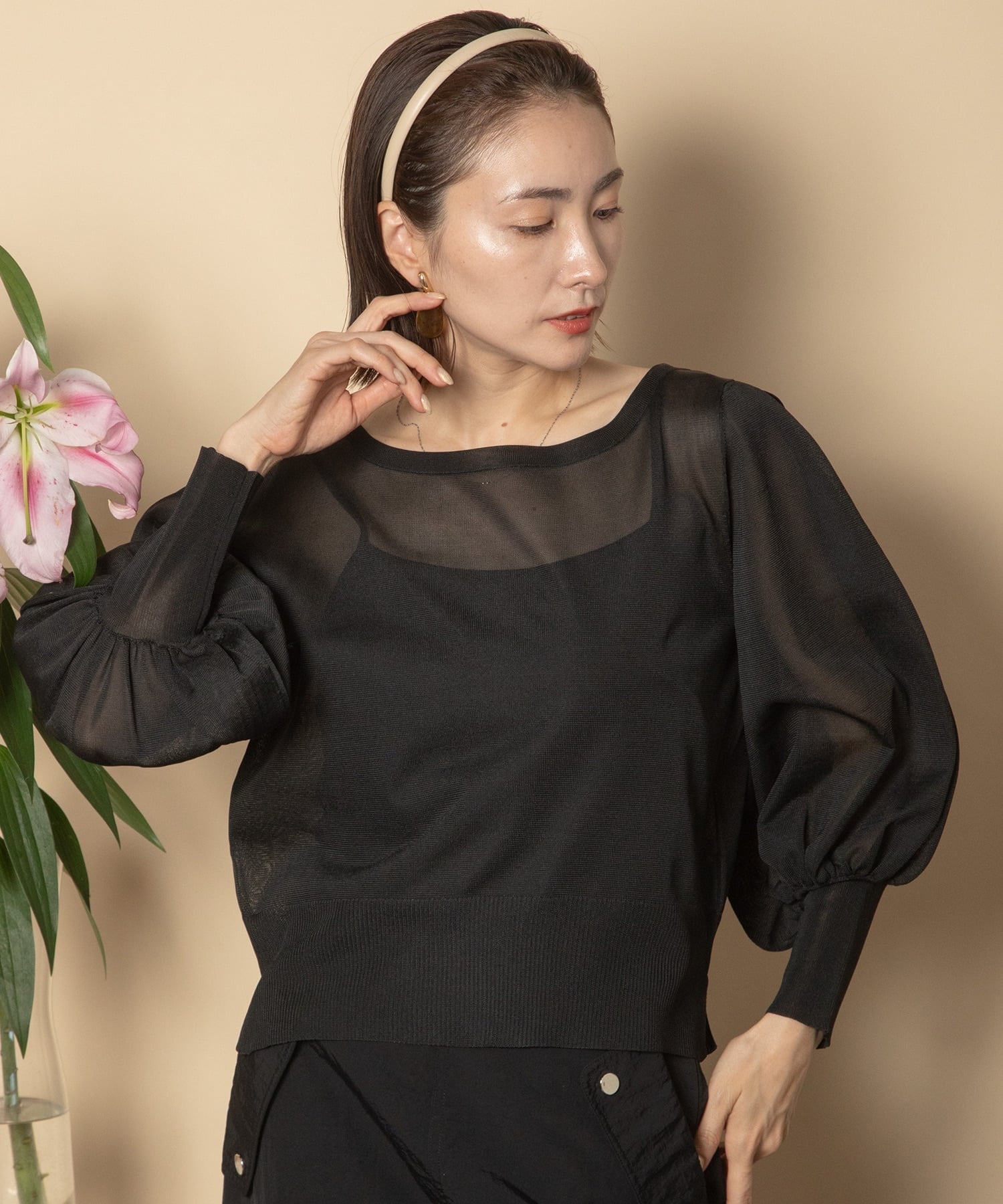 大人の透け感が魅力の定番シアーニット。トレンドのショート丈に立体的なパフスリーブ、袖口は長めのリブとモードな雰囲気のアイテム。
