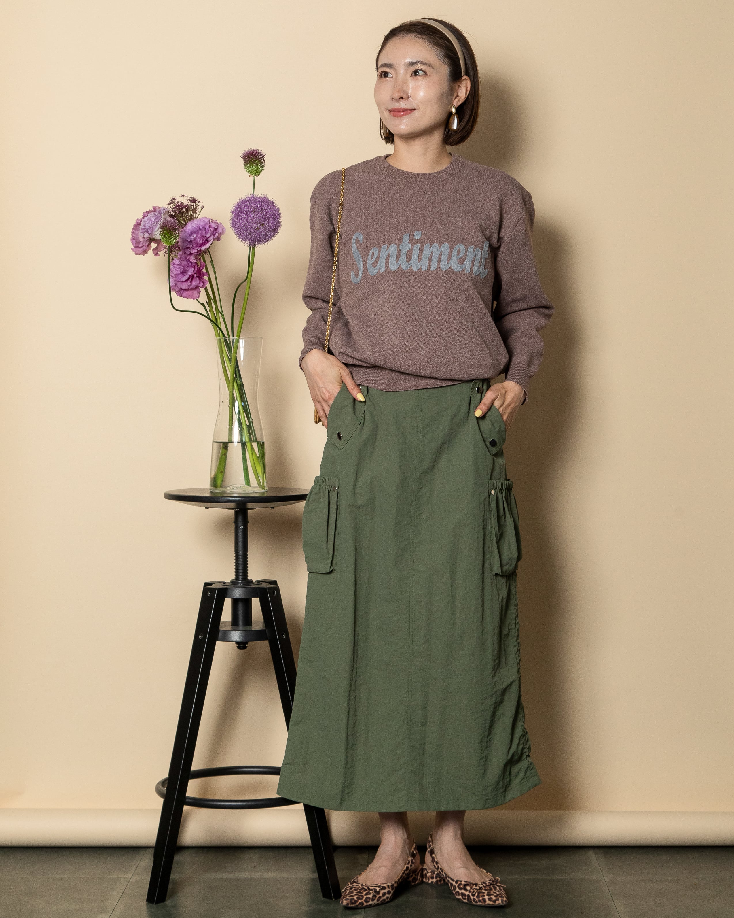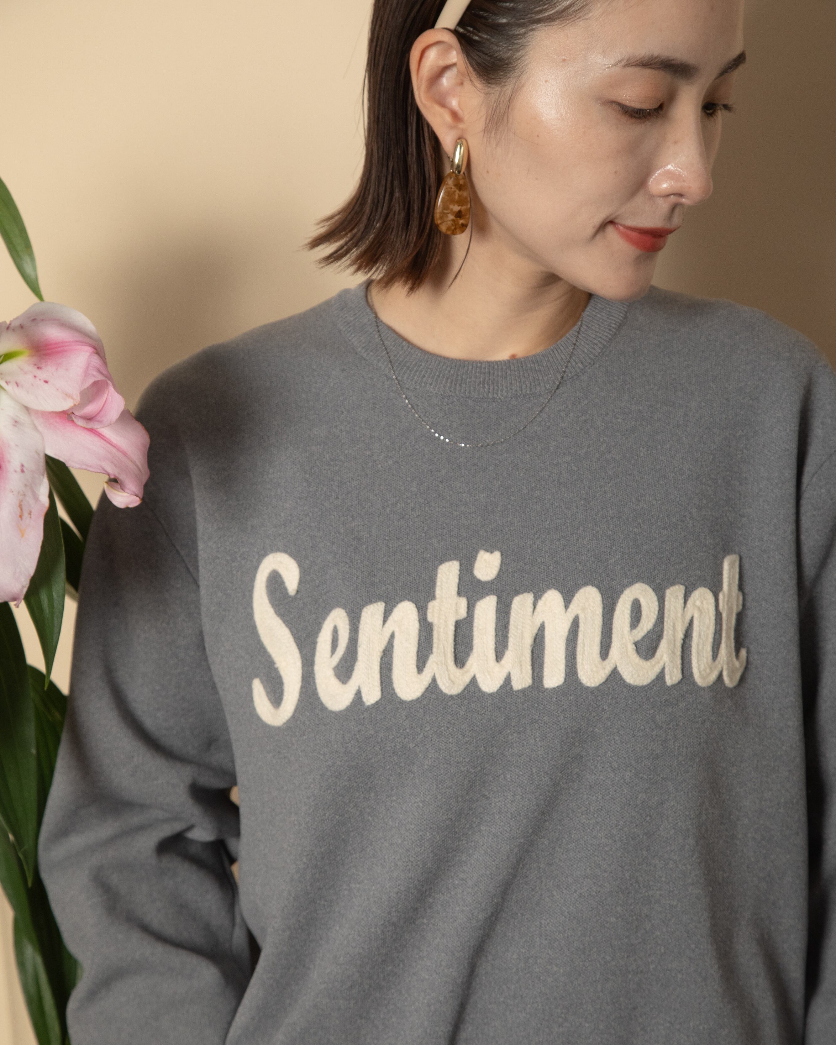 フロント部分にSentiment-繊細な-ロゴテキスト刺繍が施されたリラックスニット。スウェット感覚で着れるデイリーに大活躍間違いなしのニット。