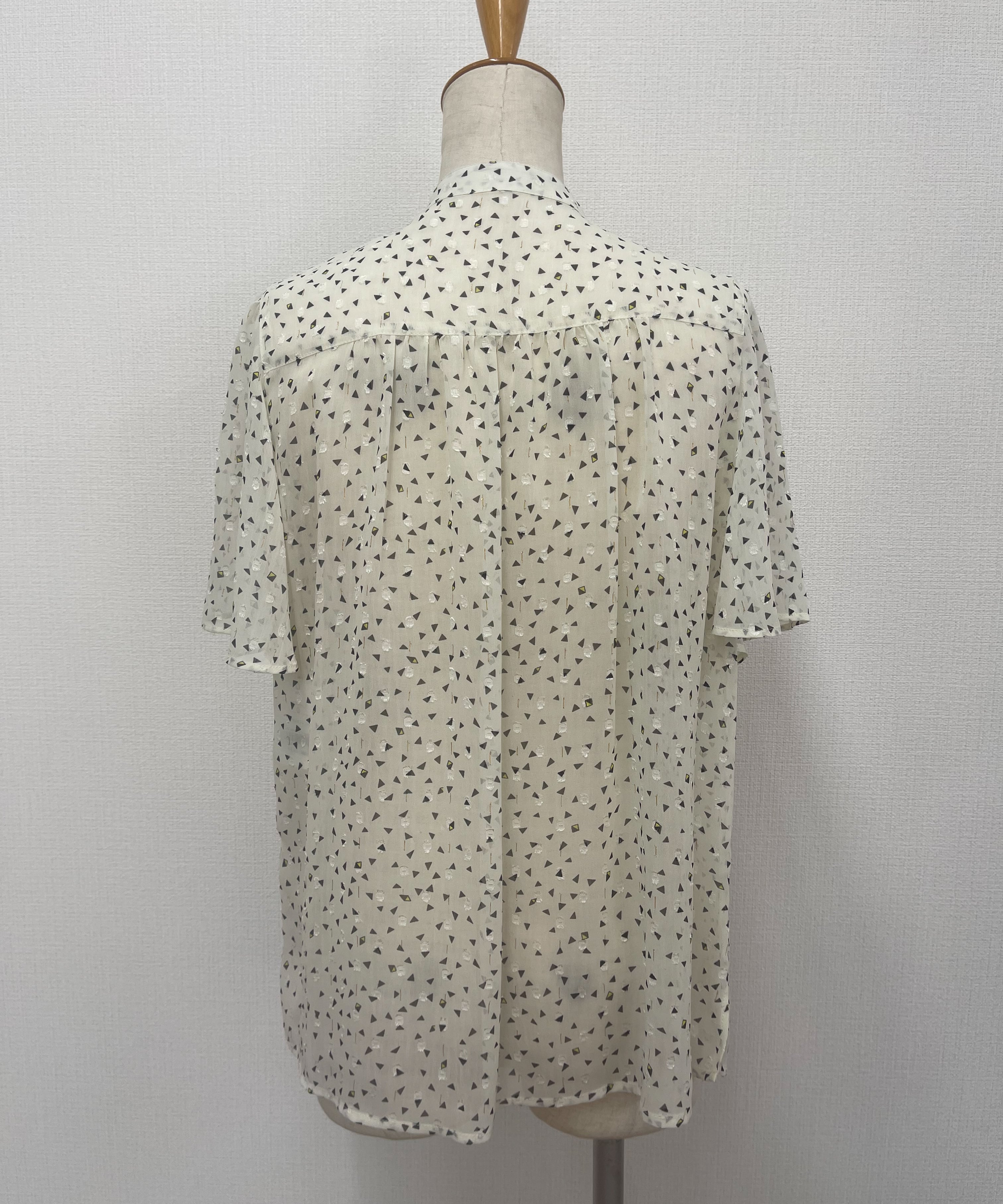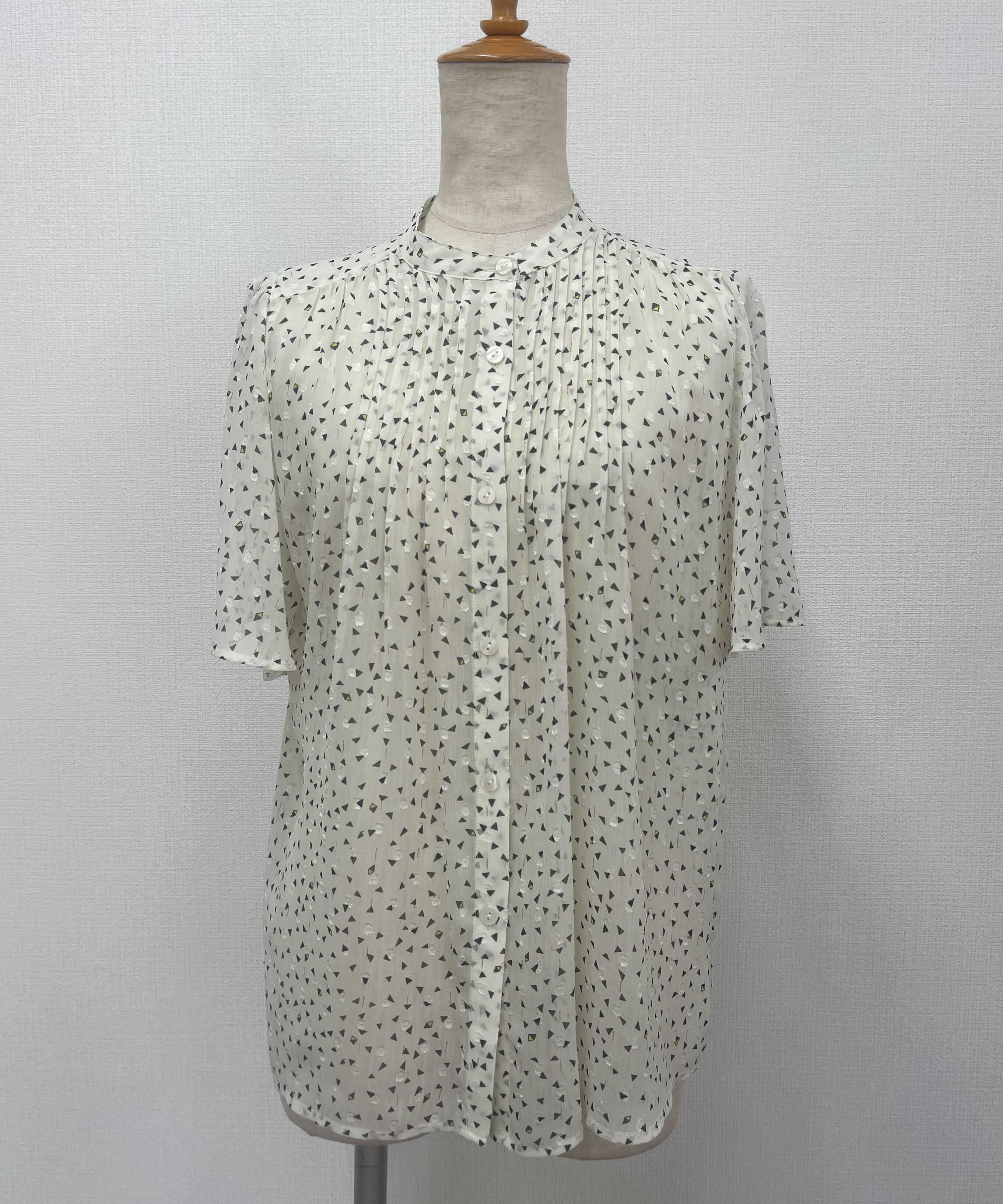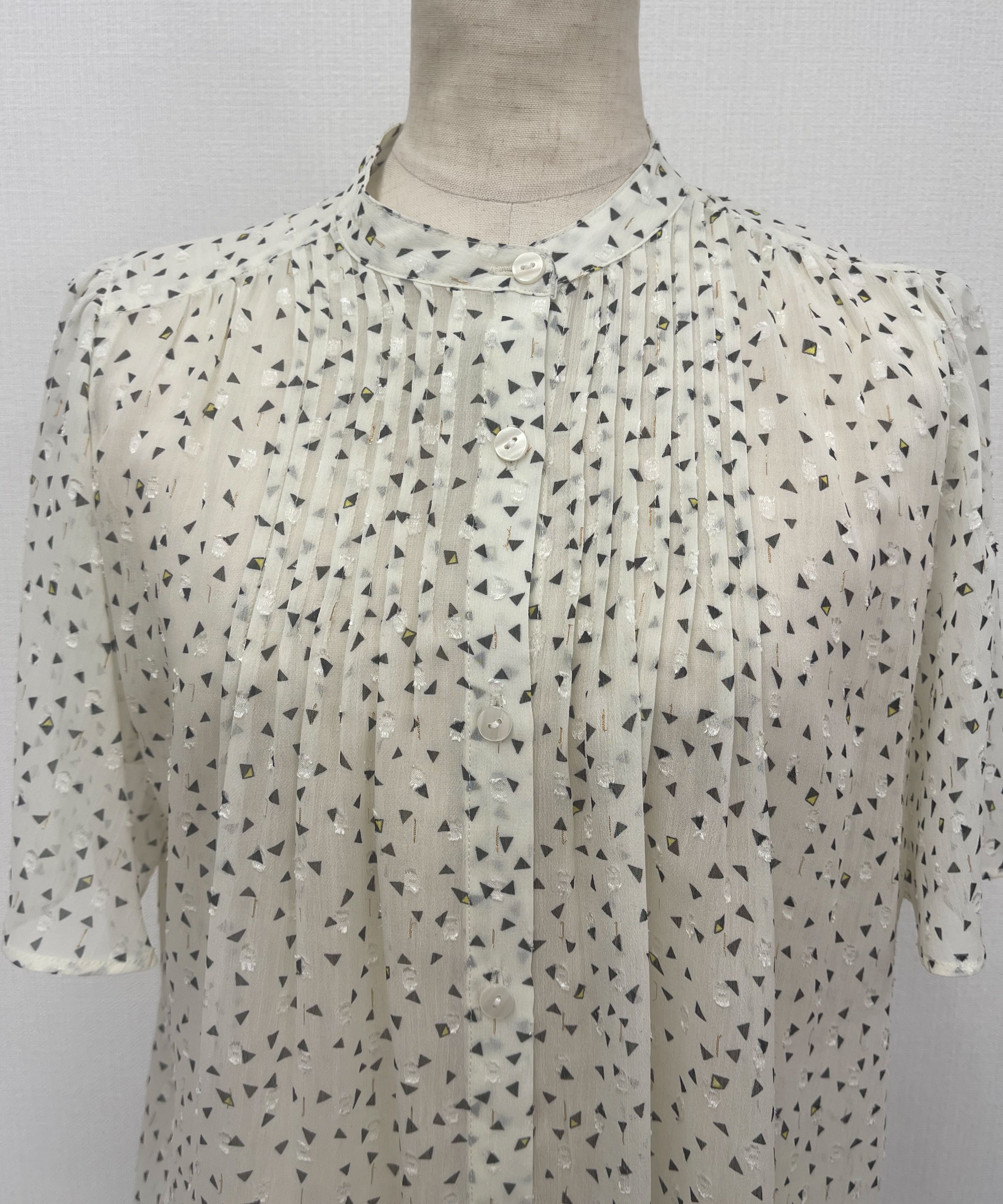 細かな幾何柄がドット風に散りばめられたプリントに揺れるフレア袖と肩タックからのフレアシルエットが魅力のフェミニンなブラウス。前ボタン開き仕様