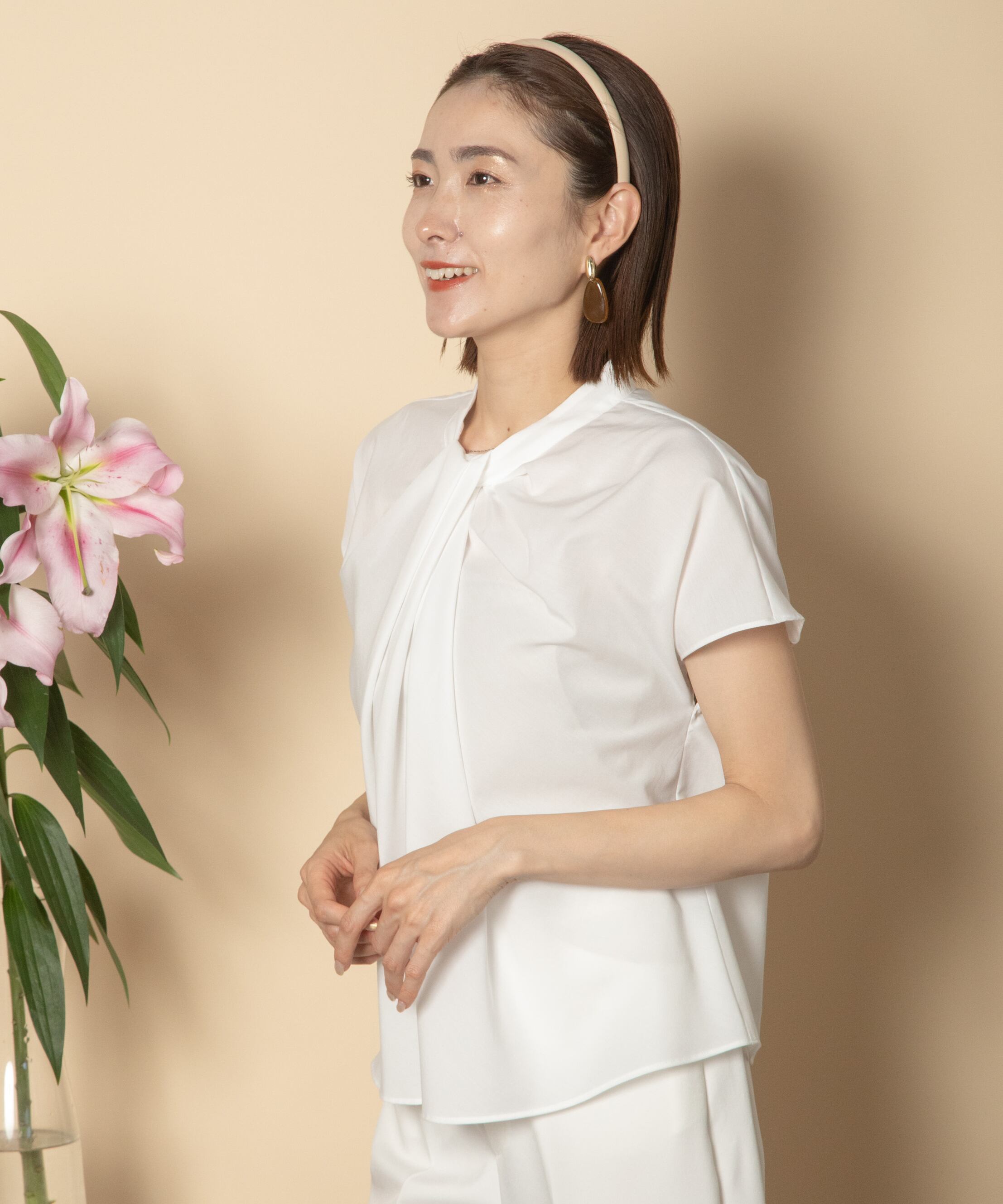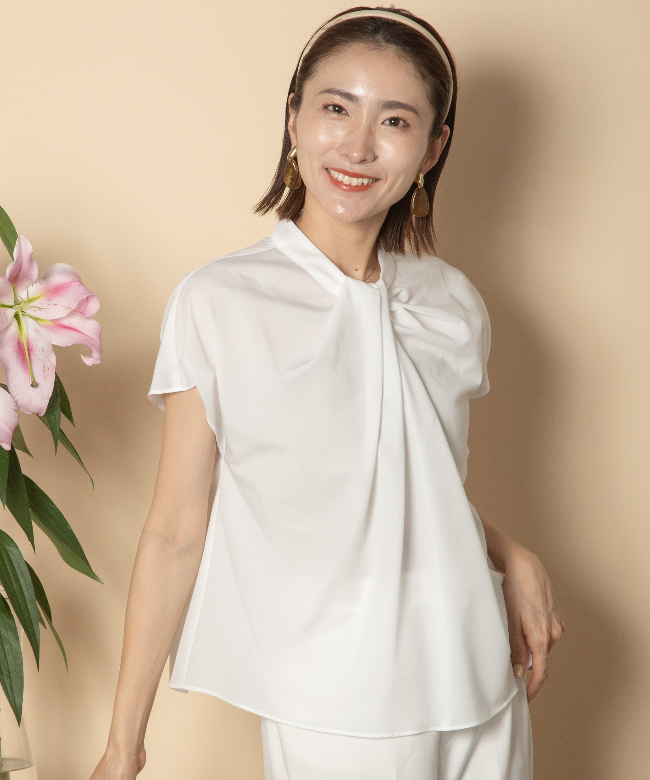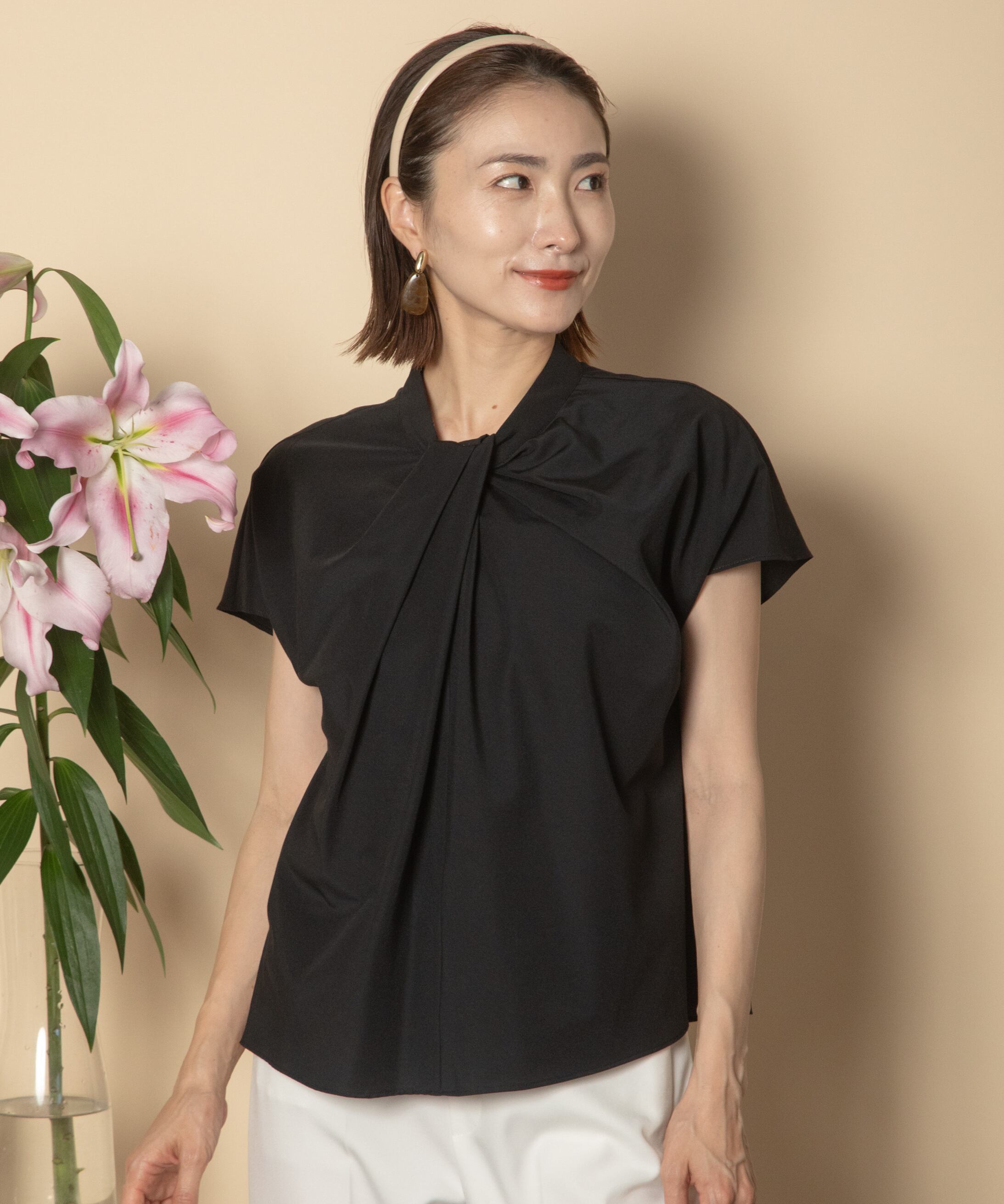 アニープラス定番のネックデザインブラウス。首元の捻りから美しいドレープのデザイン。1枚でももちろんジャケットのインにも相性の良いキレイめブラウス。タックインでもアウトでもバランス良いショート着丈です。