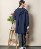 季節の端境期に大活躍間違いなし気軽に羽織れるライトアウター。フェミニンな雰囲気の胸元にギャザーが入ったAラインのフードタイプのコート。裏地は配色、ダブルジップで下からも開閉可能と細部までこだわりあるデザイン。
