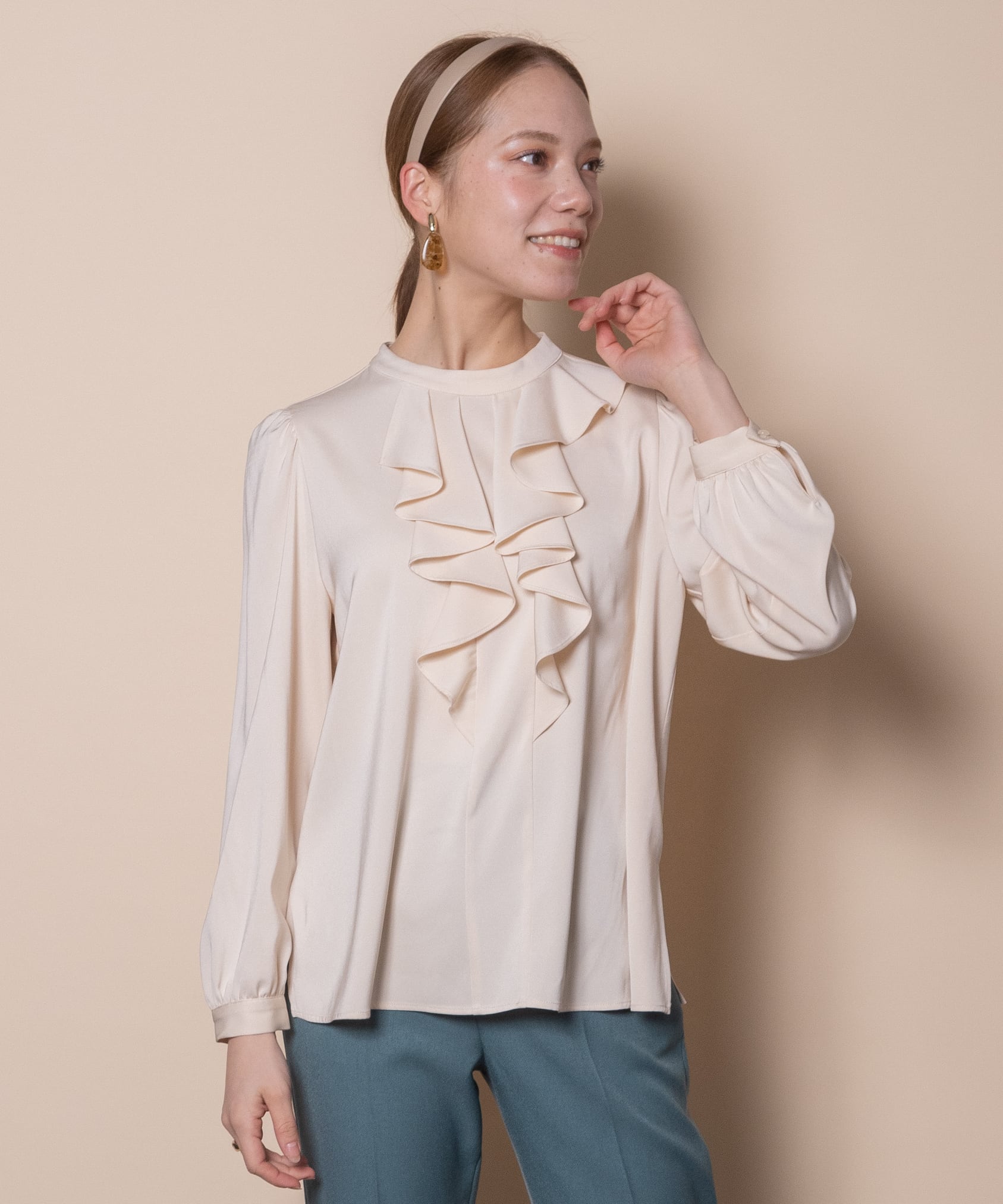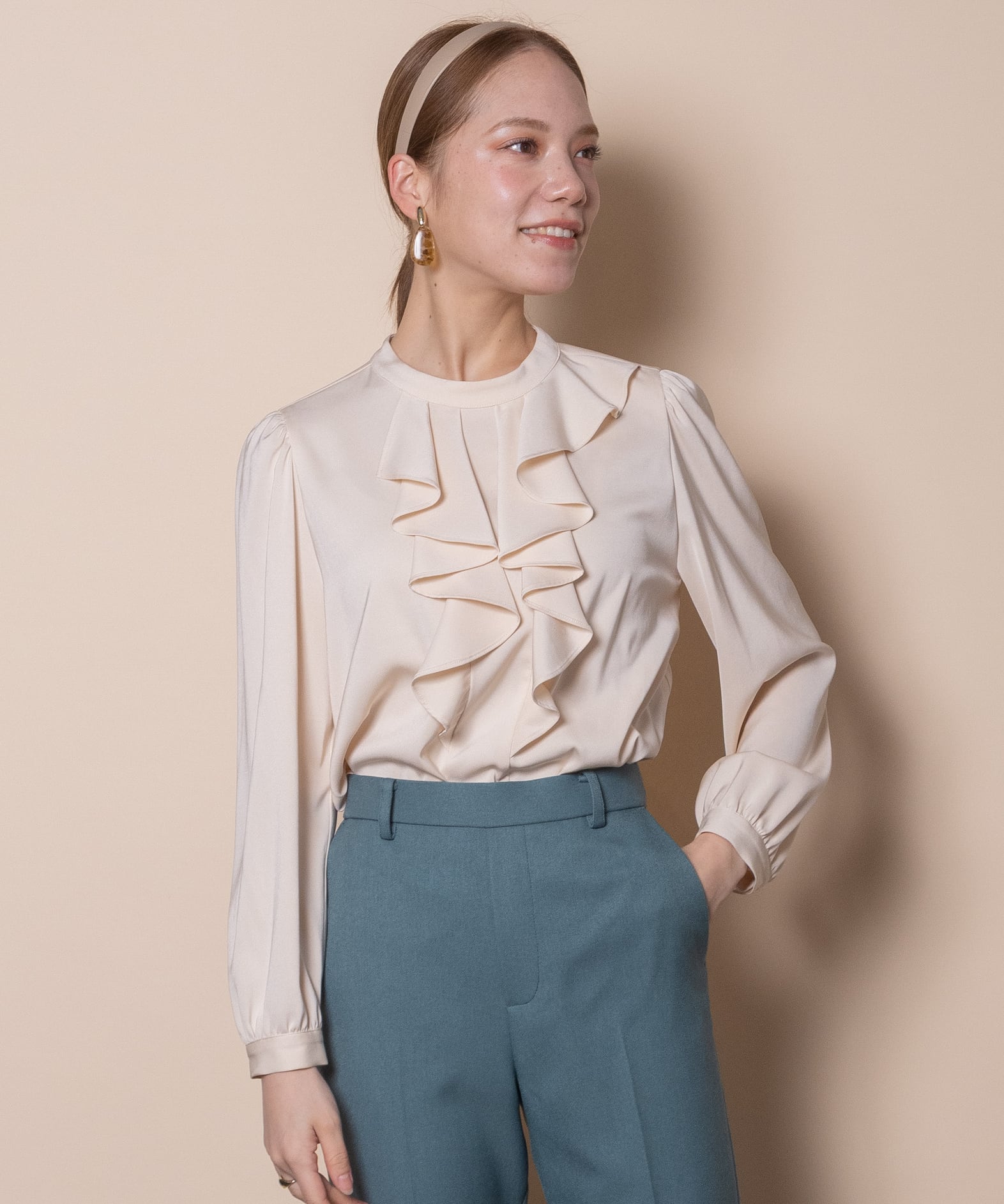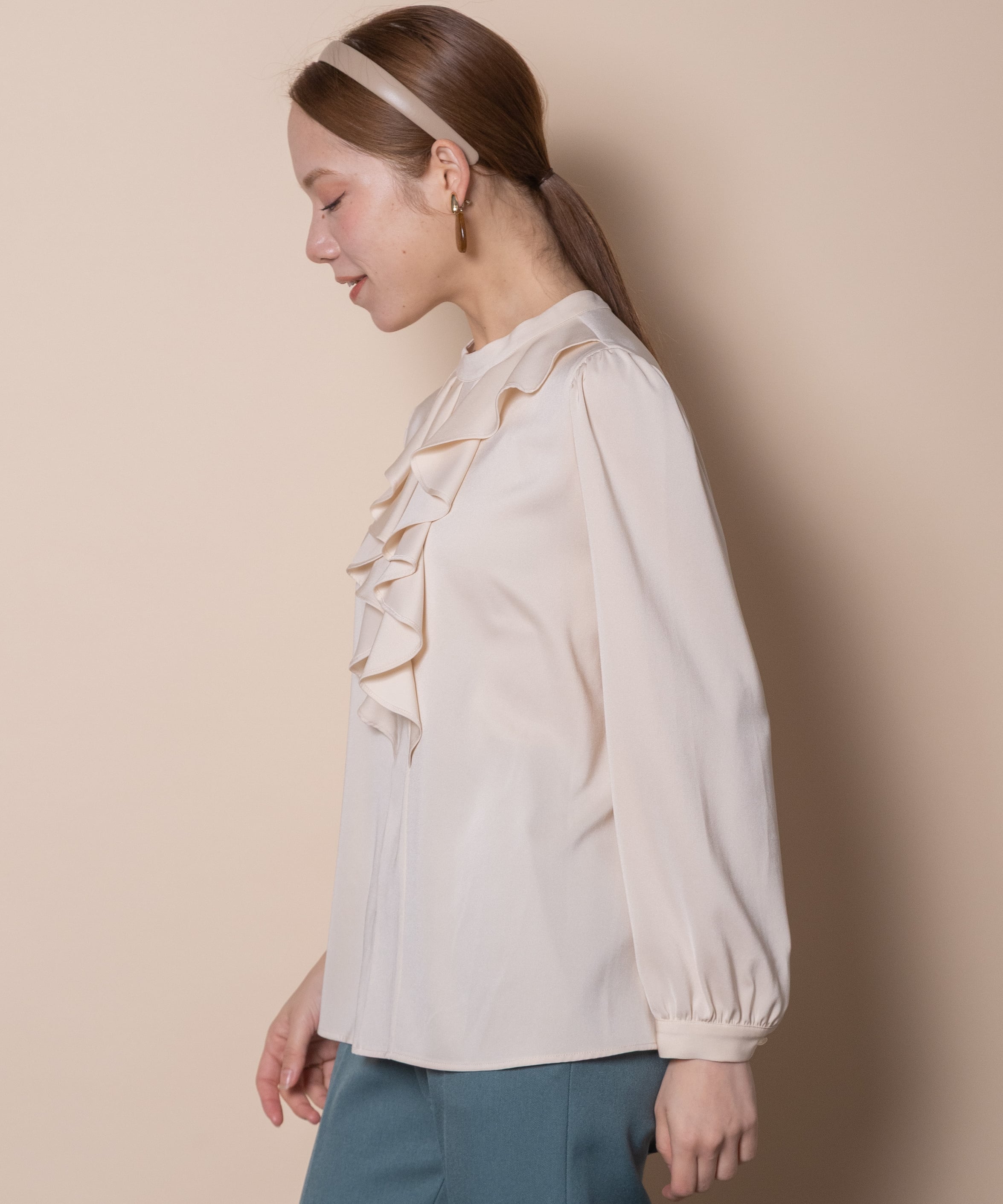 エレガントでクラシカルな雰囲気のサテンフリルブラウス。フロントのゴージャスなラッフルフリルが魅力。フリルはさりげなく左右がアシンメトリーデザイン。サイドスリット入りのショート丈でアウトでもインでも決まります。胸元フリル部分がジャケットと相性もよく、お仕事シーンやお出かけシーンにおすすめのブラウスです。