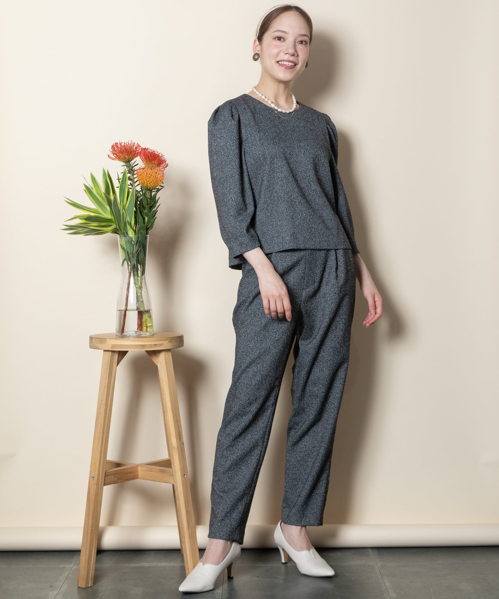同素材のパンツとセットアップもおすすめ。お仕事シーンから式典やパーティ、食事会などのシーンでもご着用頂るセットアップスタイル。