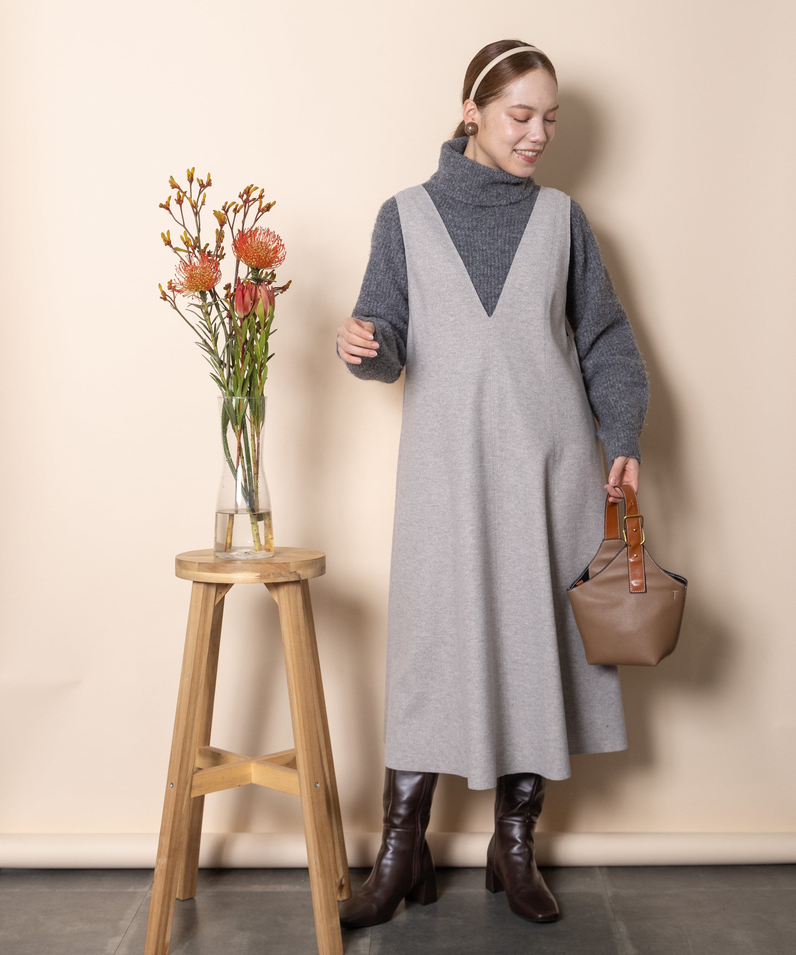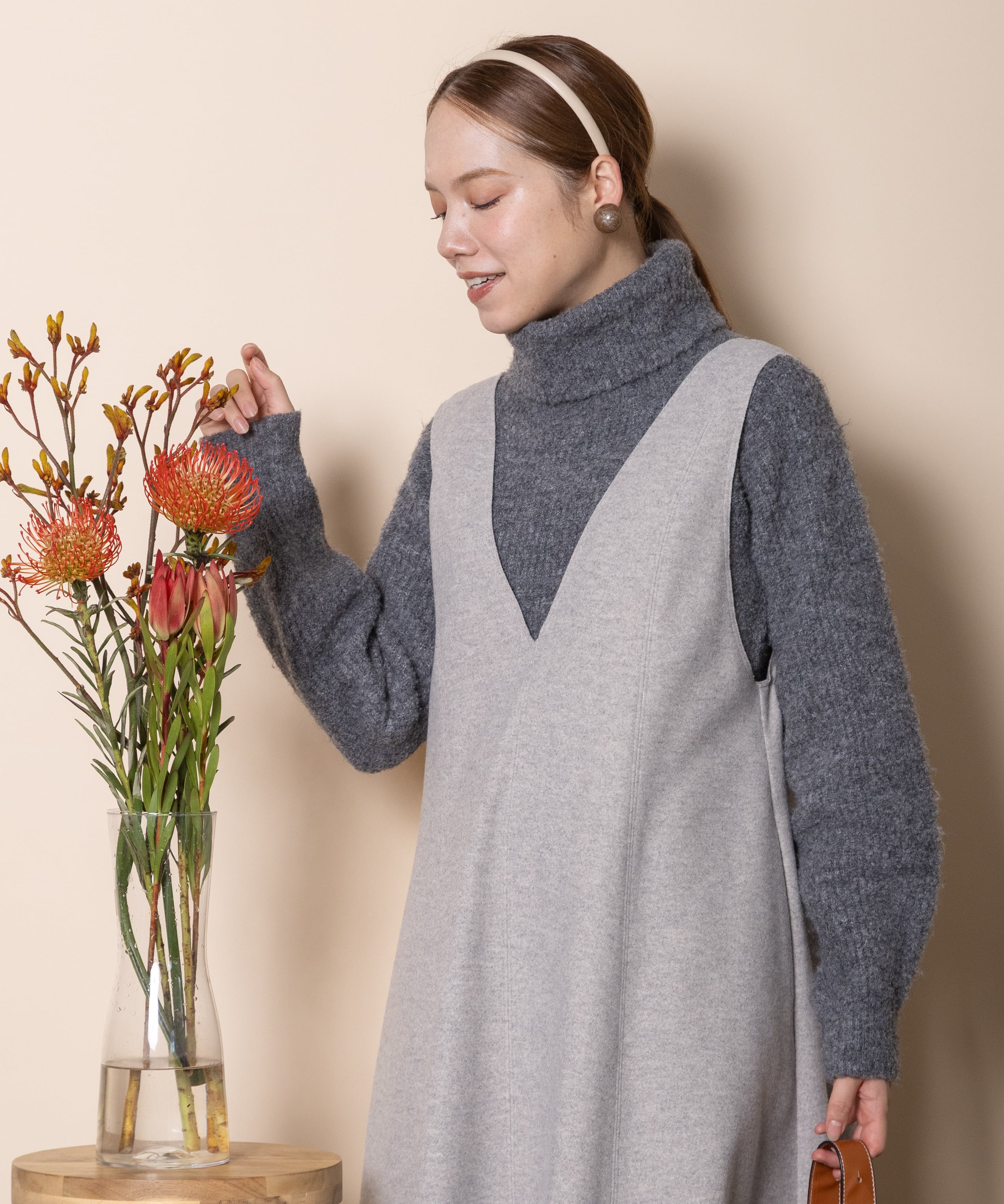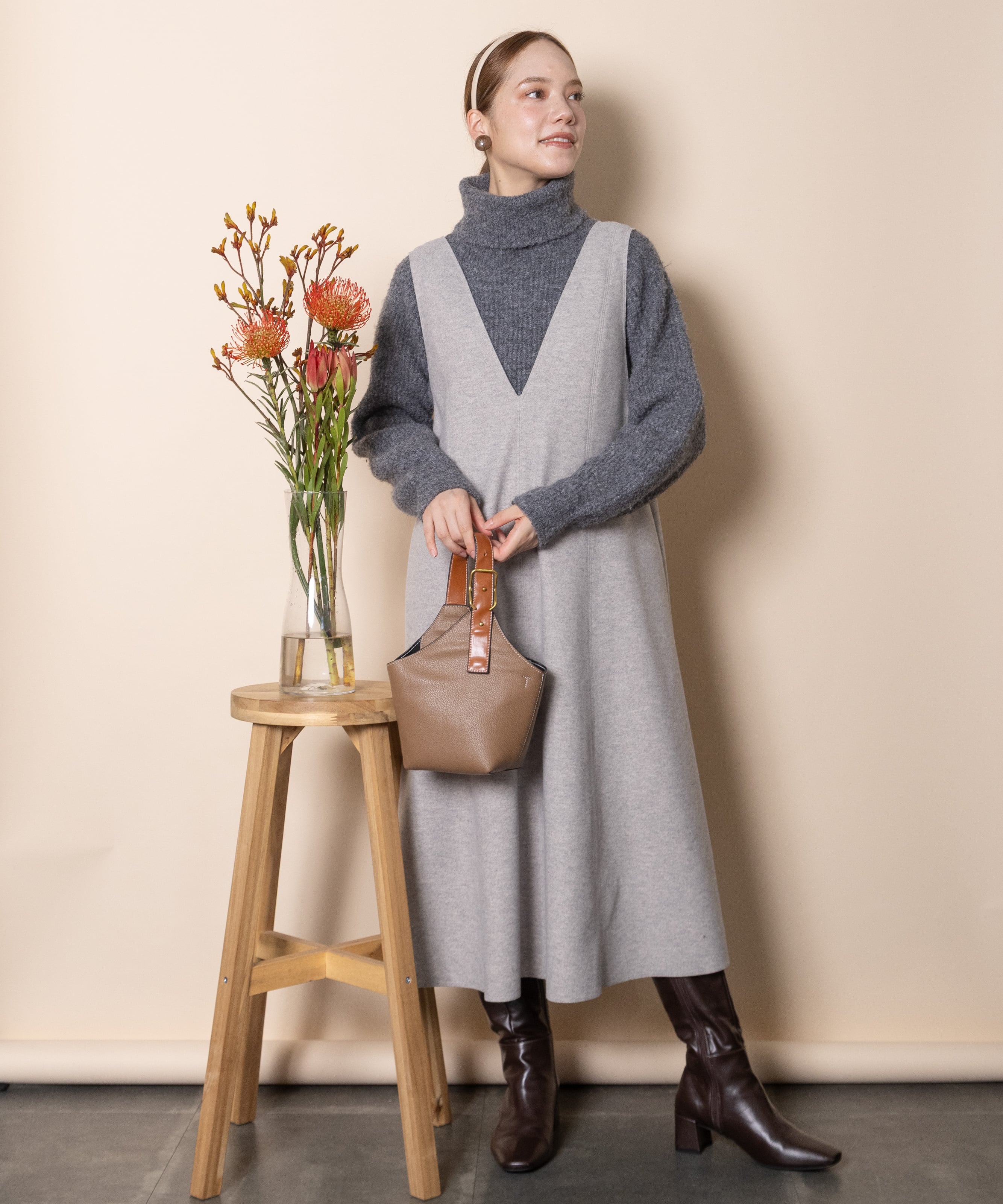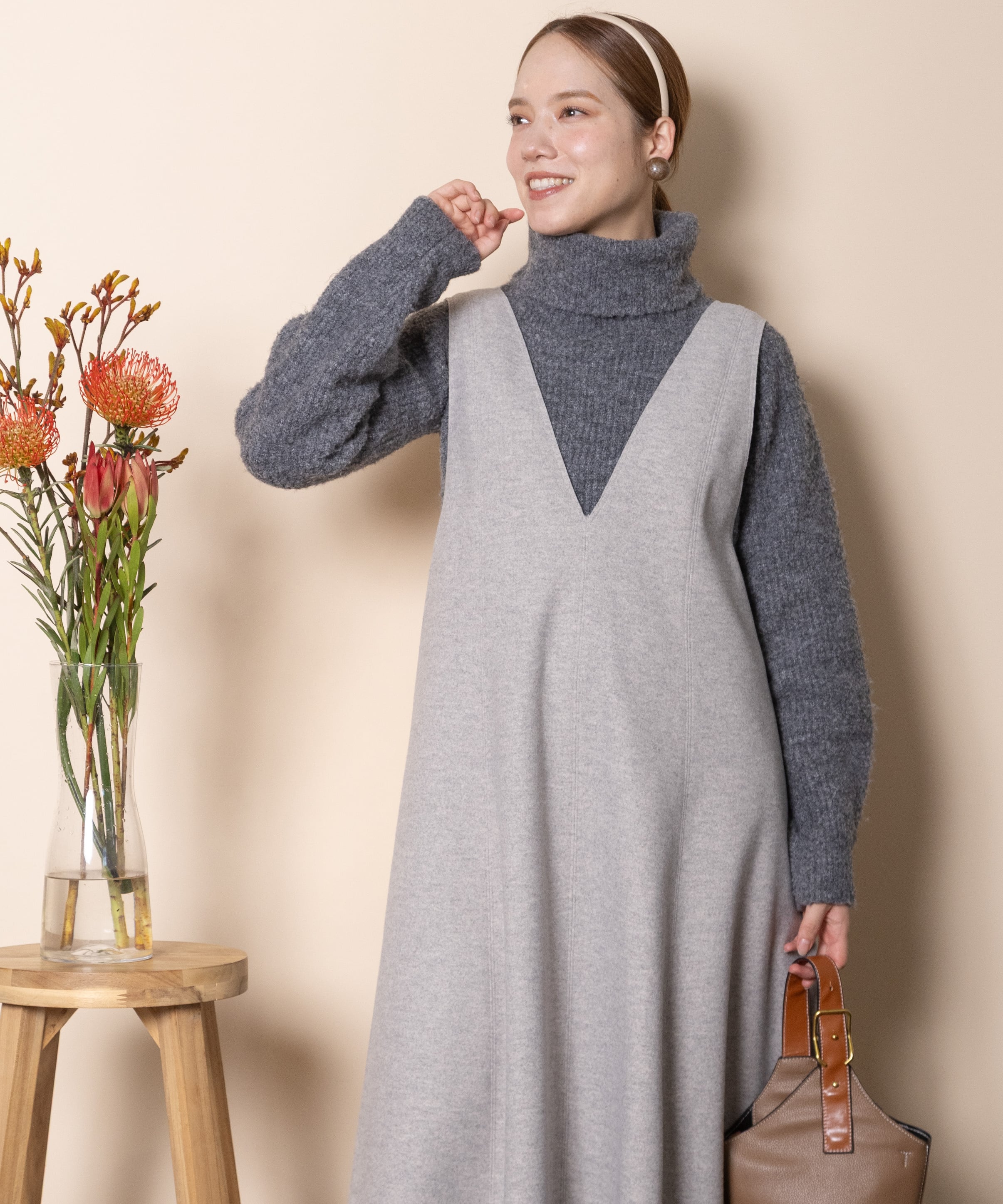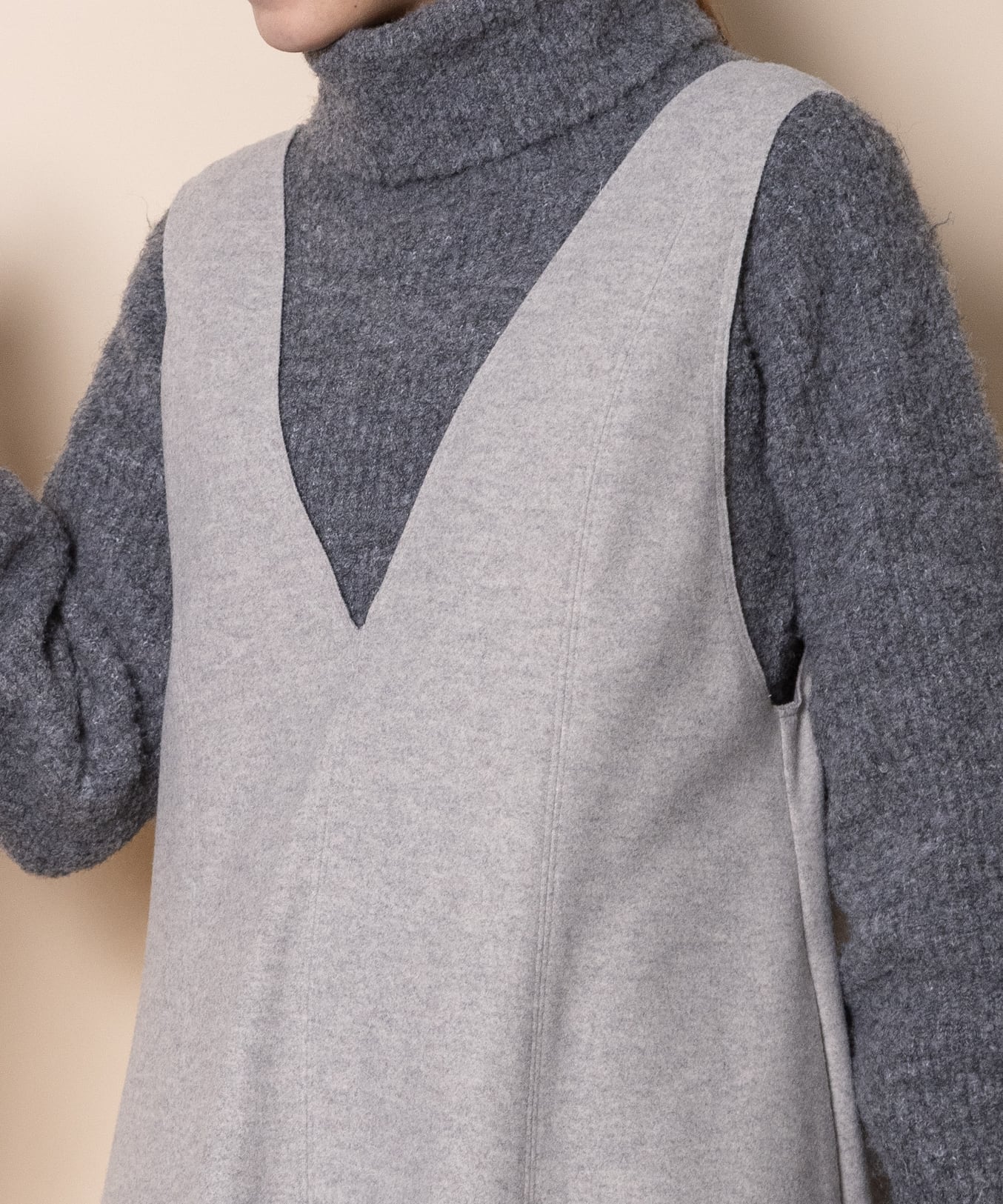 ウールのような柔らかいタッチのニードルジャージ素材を使用したジャンスカ。おしゃれなカットオフ、Aラインのフレアシルエット美しいシンプルデザイン。大人カジュアル派、エレガント派どちらにもおすすめ。