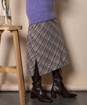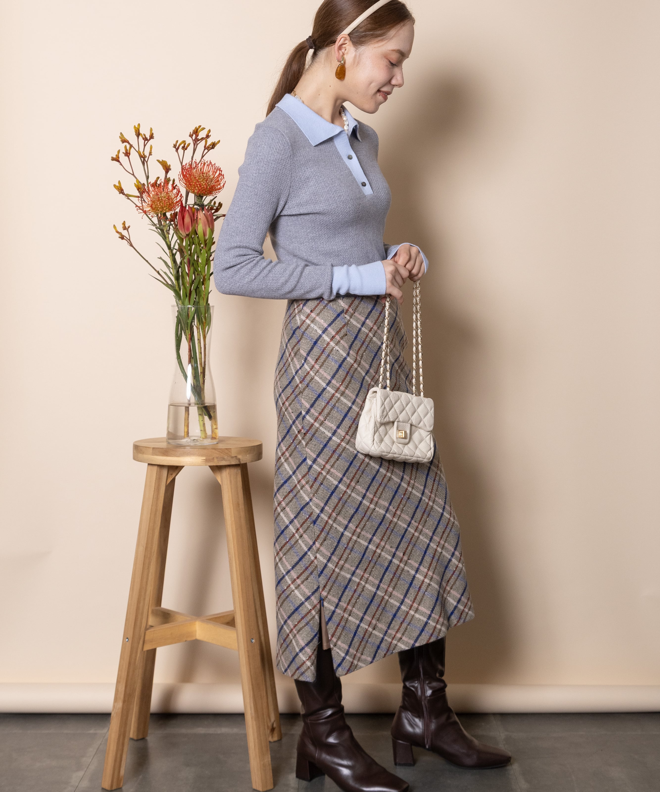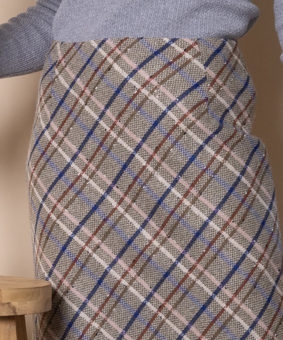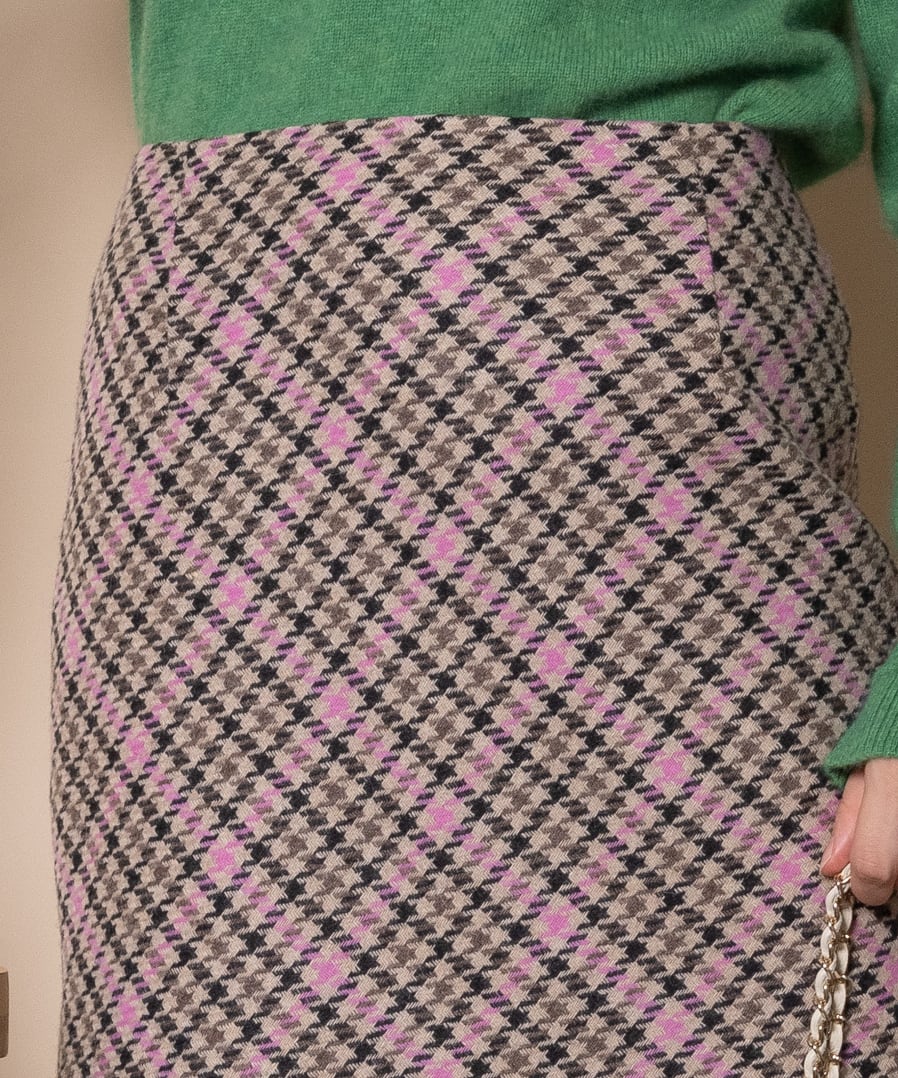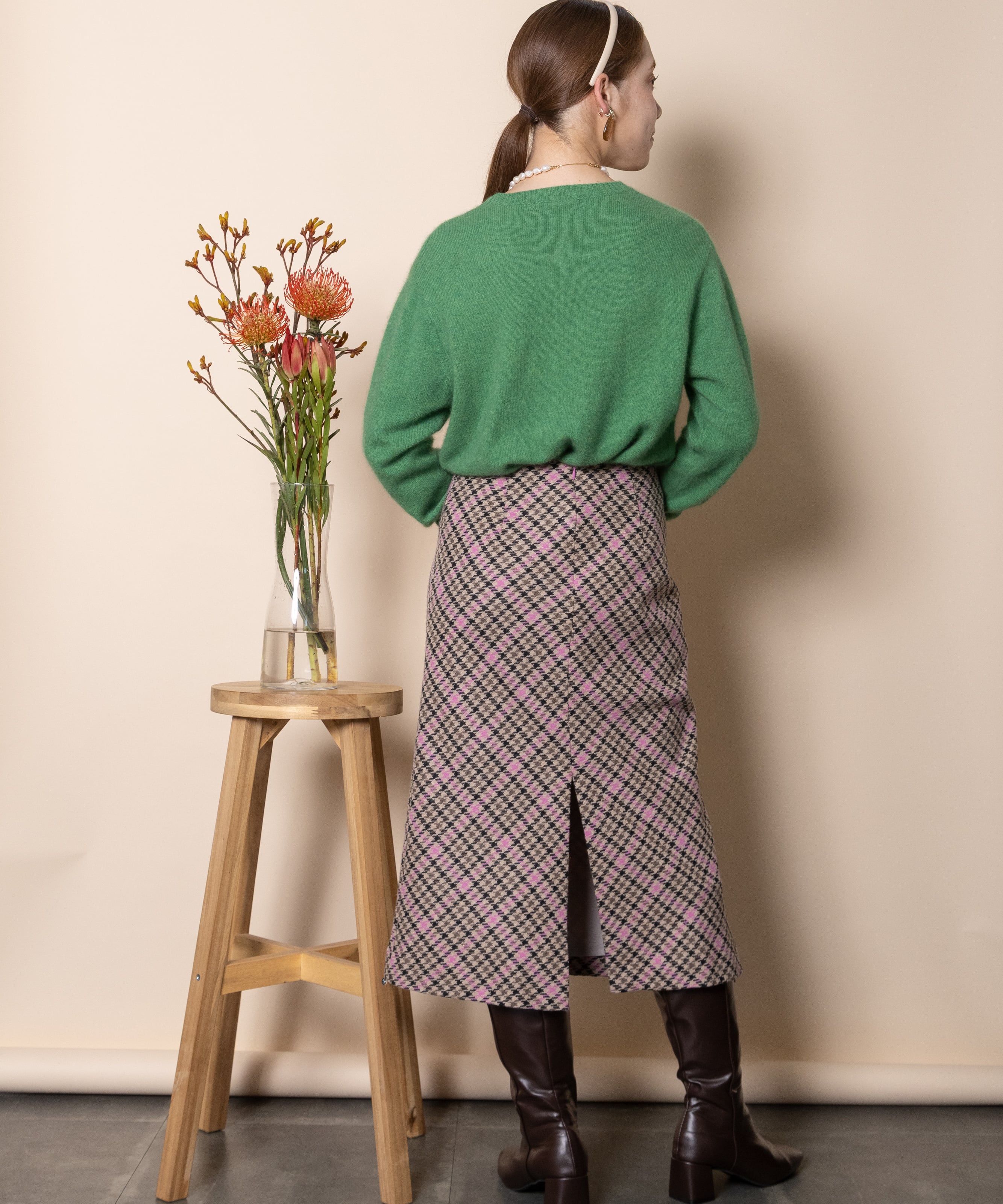 セットアップ派におすすめの上質な先染めチェックのタイトスカート。おしゃれな腰履きタイトシルエット。同素材のプルオーバーとあわせればセットアップスタイルが完成。お仕事にお出かけにおすすめのきっちりしたセットアップスーツ。もちろん単品でもおしゃれに決まります。バックファスナー、バックスリット仕様。