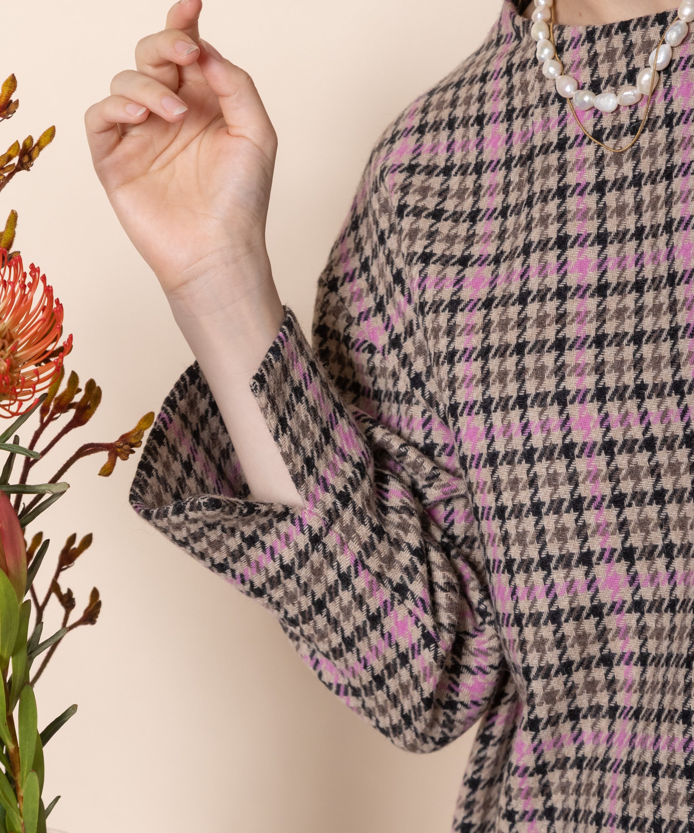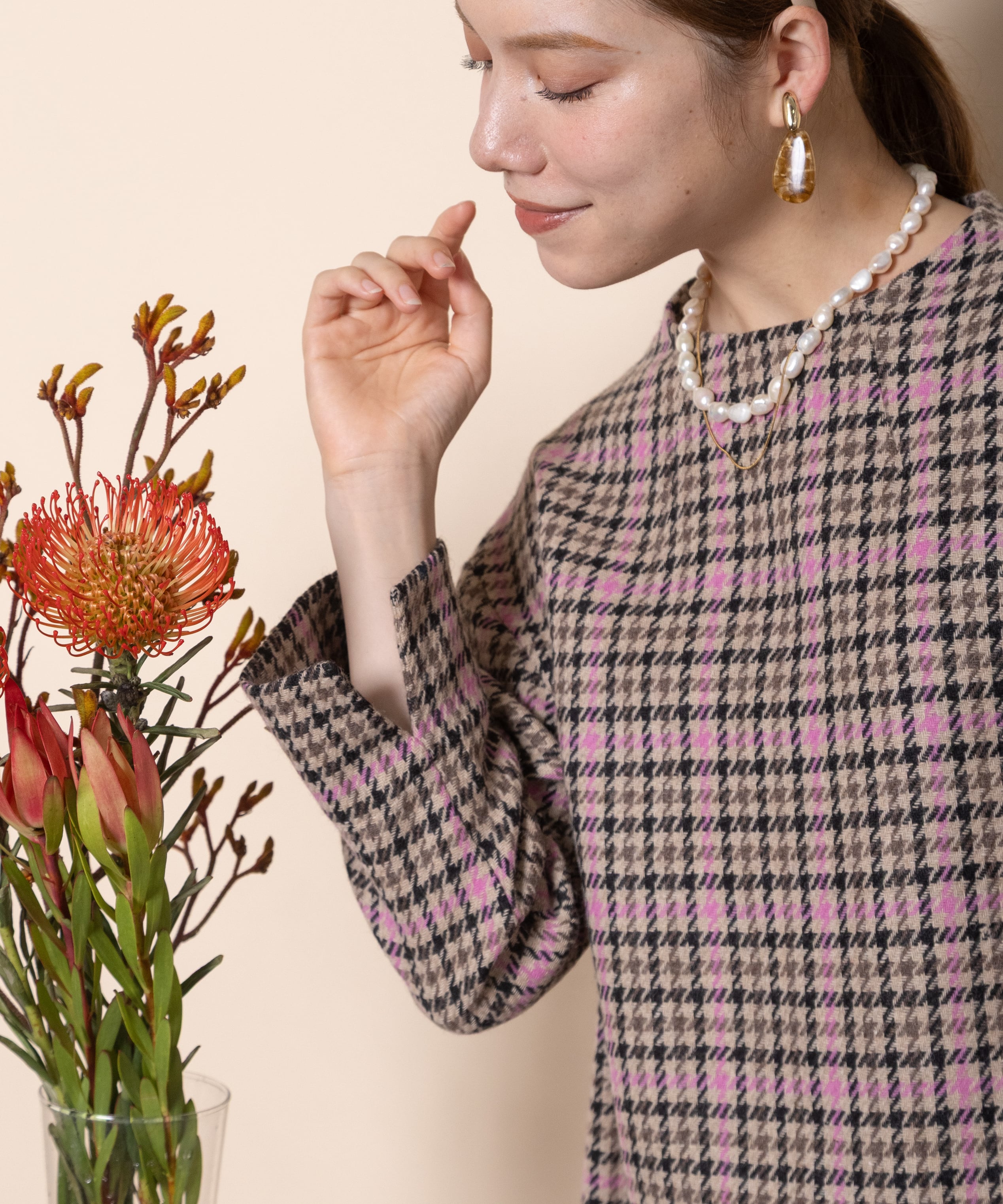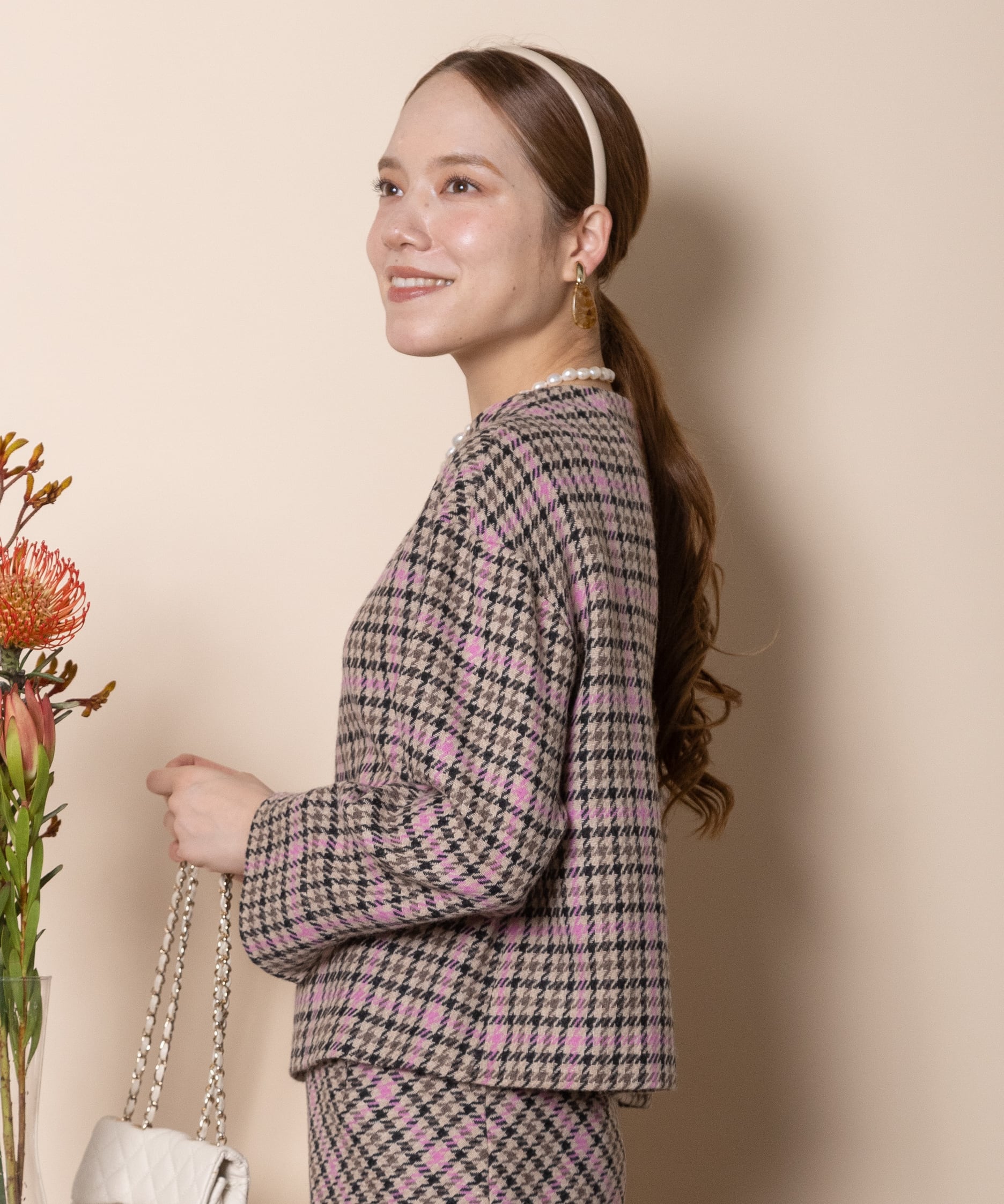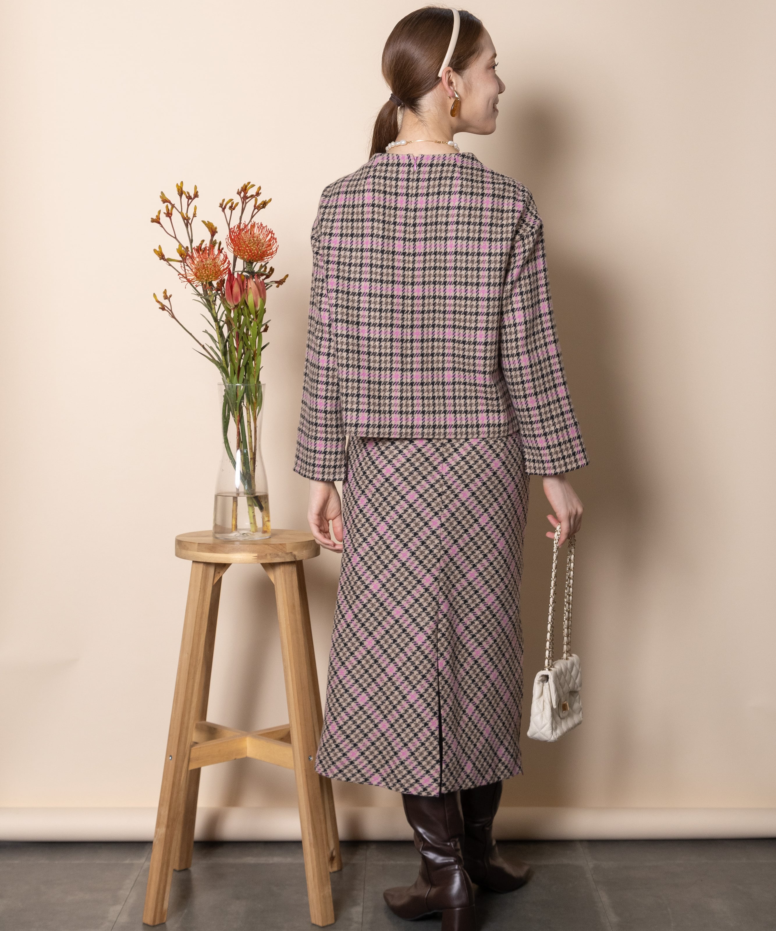 セットアップ派におすすめの上質な先染めチェックのボトルネックのプルオーバー。同素材のスカートとあわせれば、オシャレなセットアップスタイルが完成。お仕事にお出かけにおすすめのきっちりした丸の内スタイルのセットアップスーツ。もちろん単品でもおしゃれに決まります。バックファスナー仕様。
