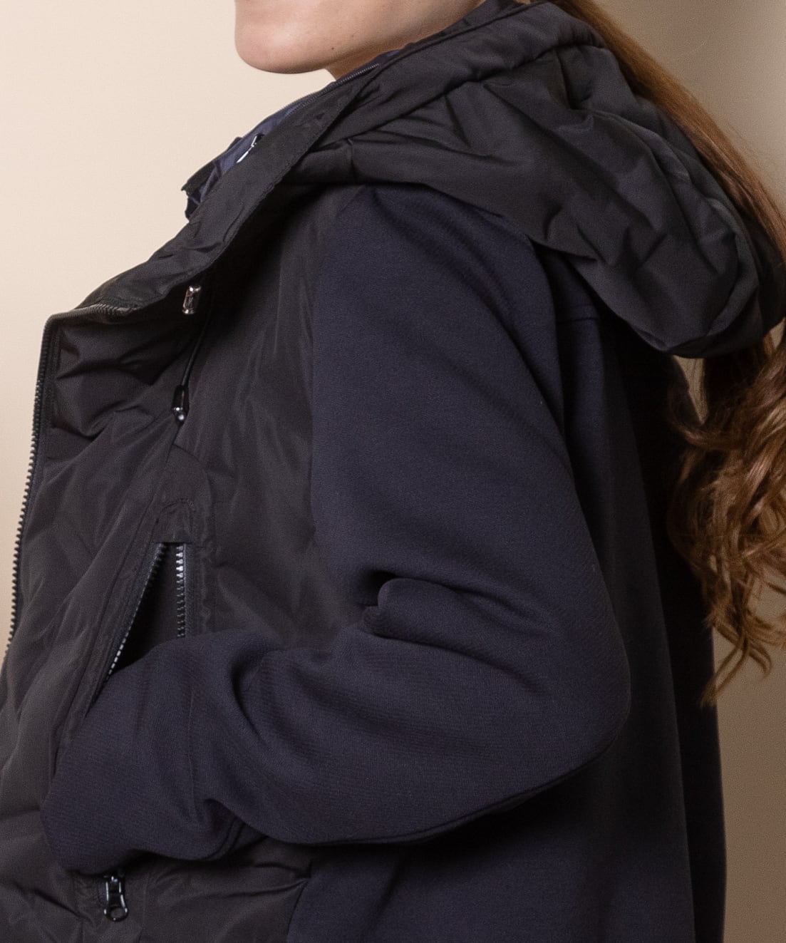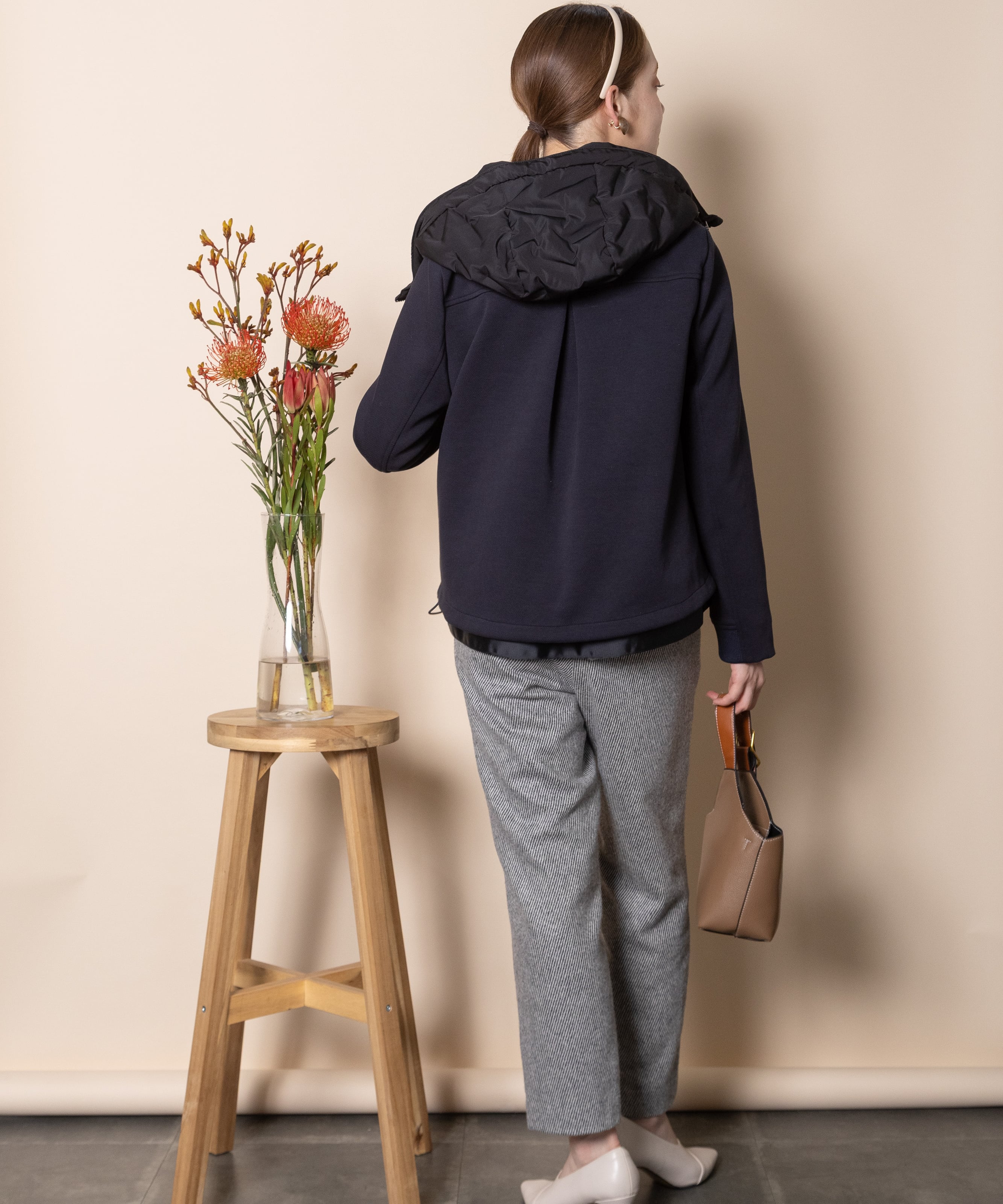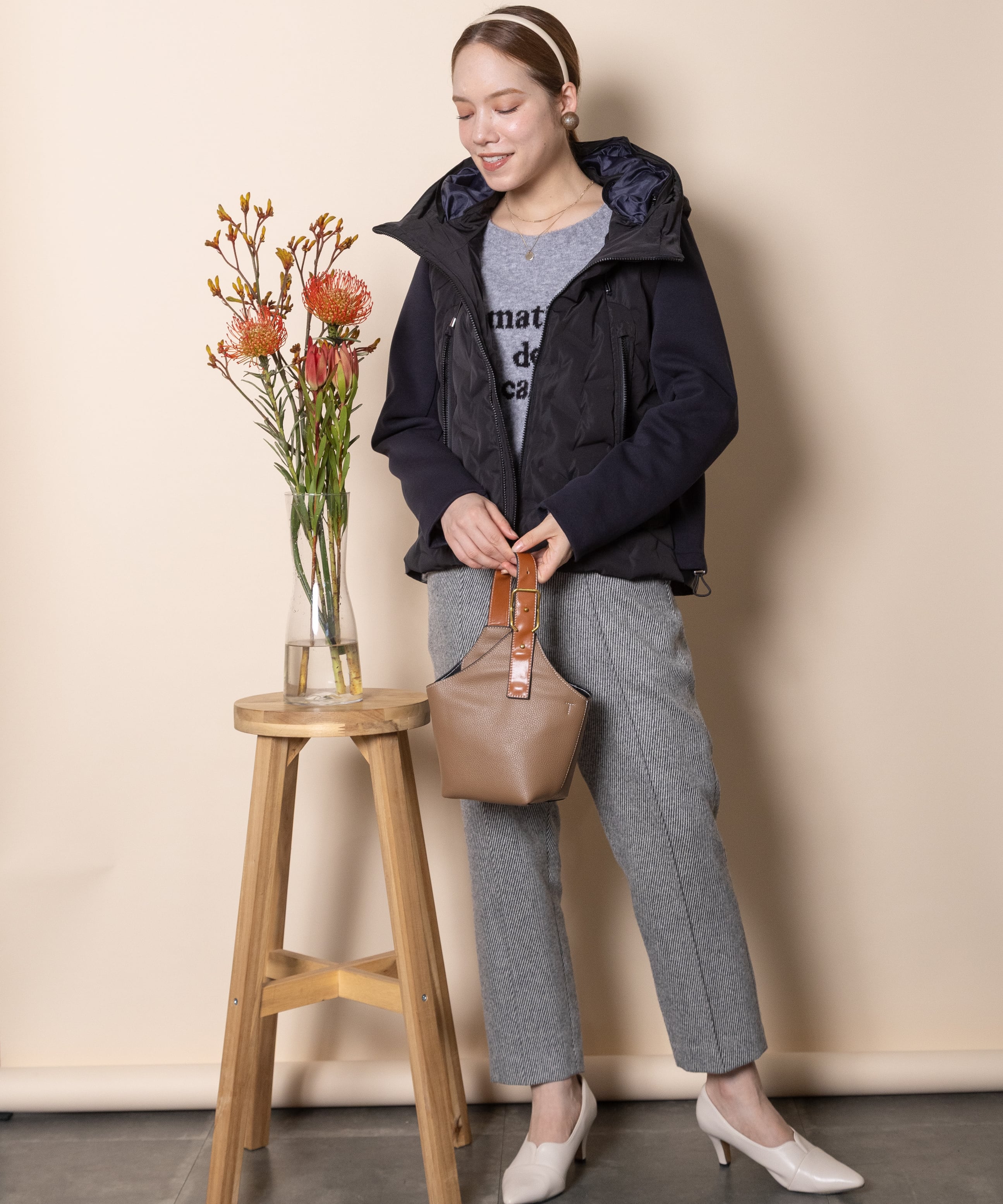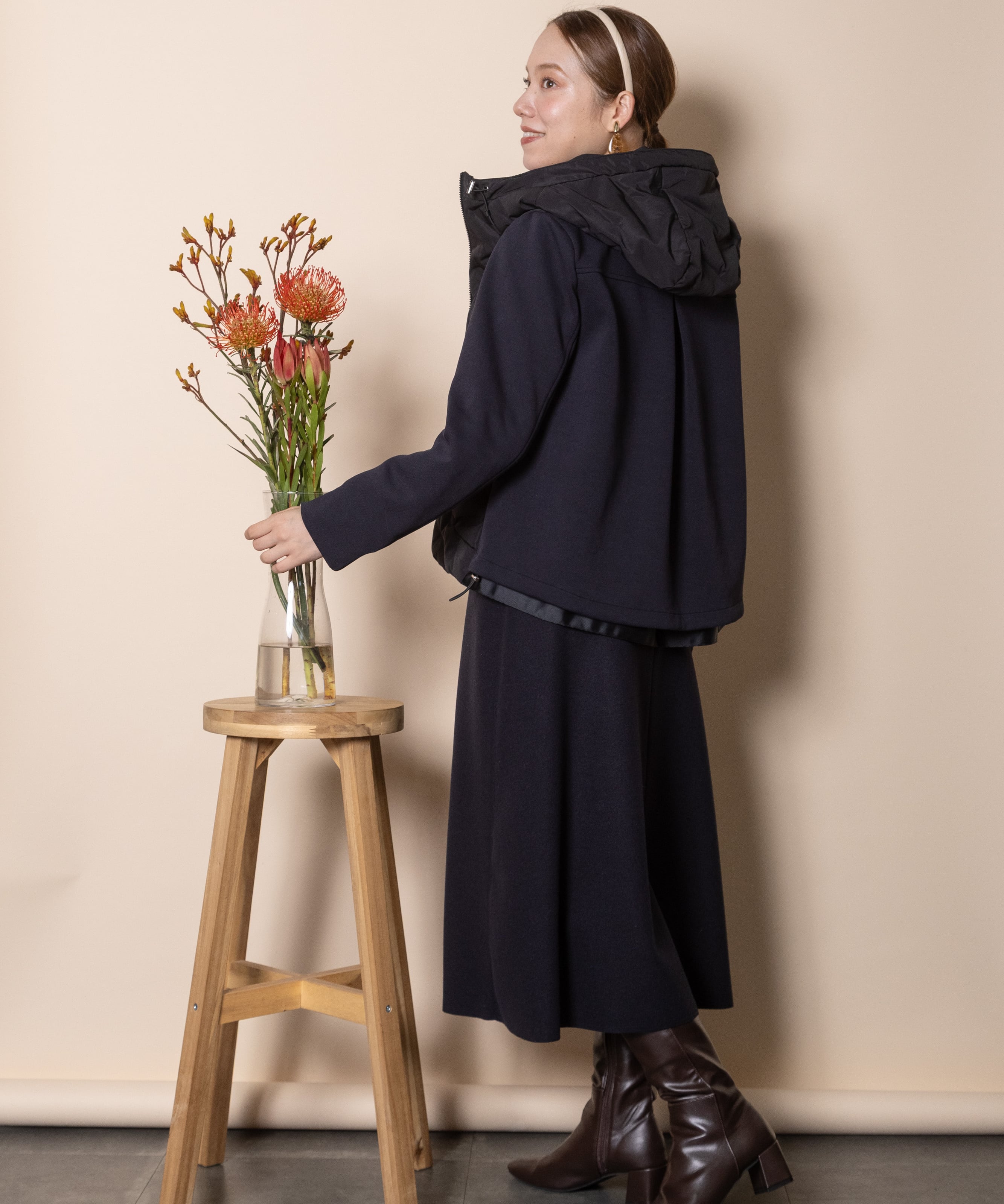 ・前身頃はキルトダウン、後身頃はダンボールニットのドッキングデザイン