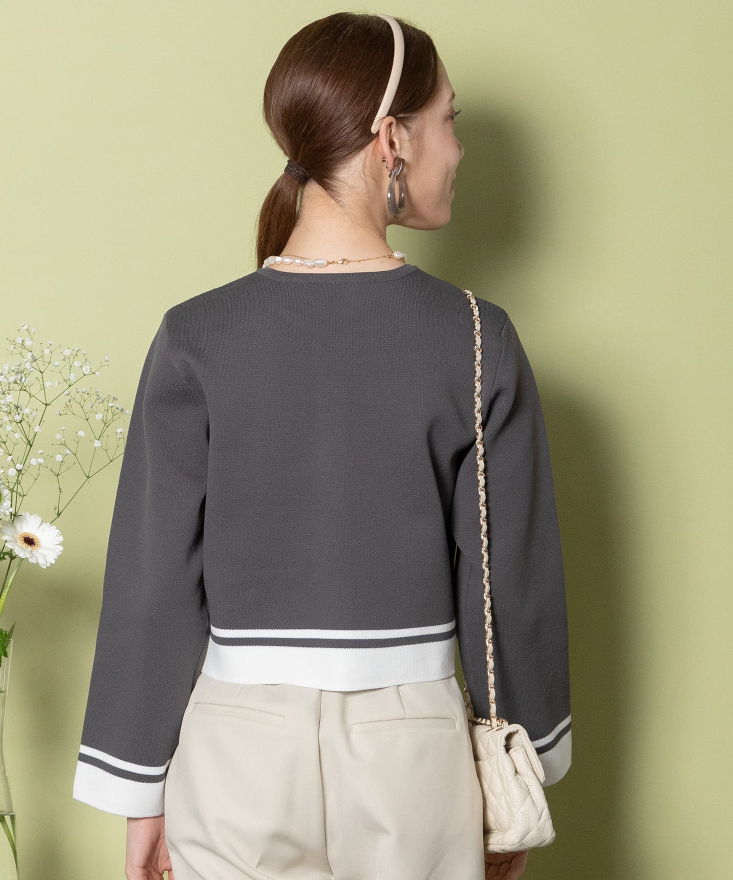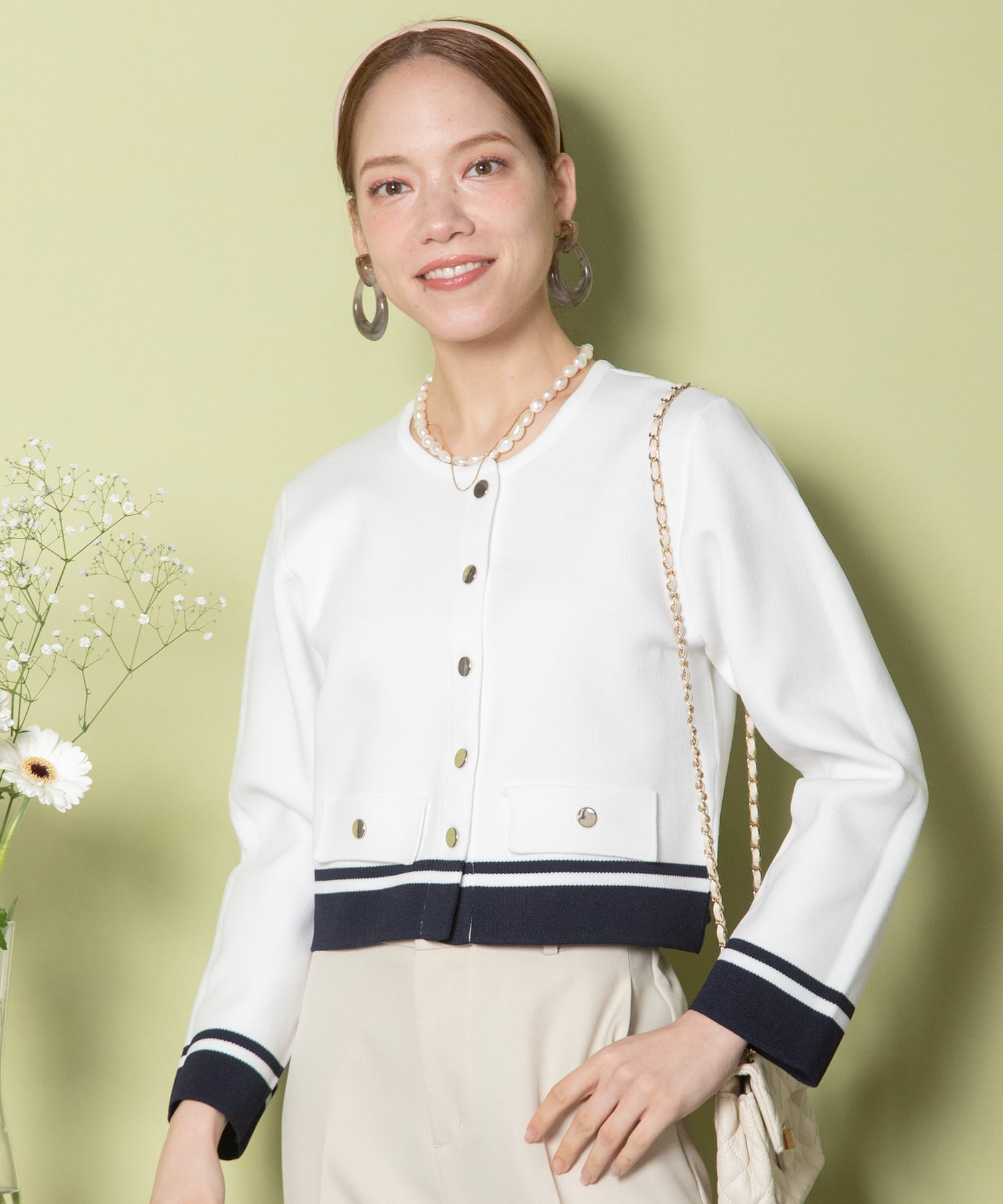気軽に羽織れて人気のノーカラーニットジャケット。トレンドの短めのクロップド丈。裾と袖に配色ラインとスナップボタンデザインで程よいカジュアル感のあるアイテム。